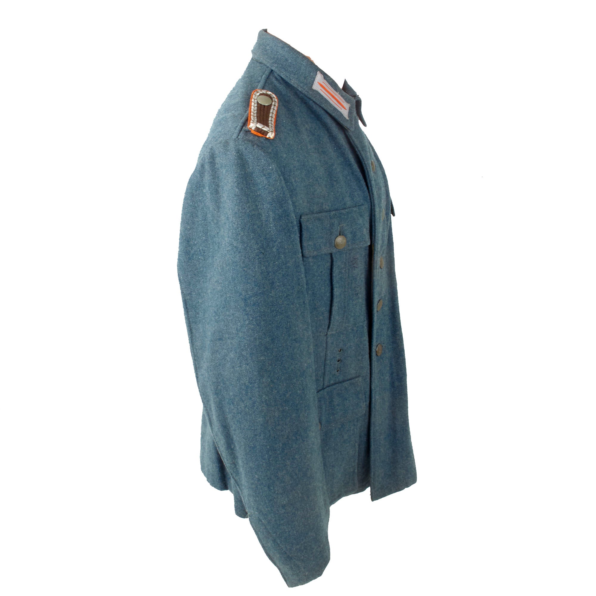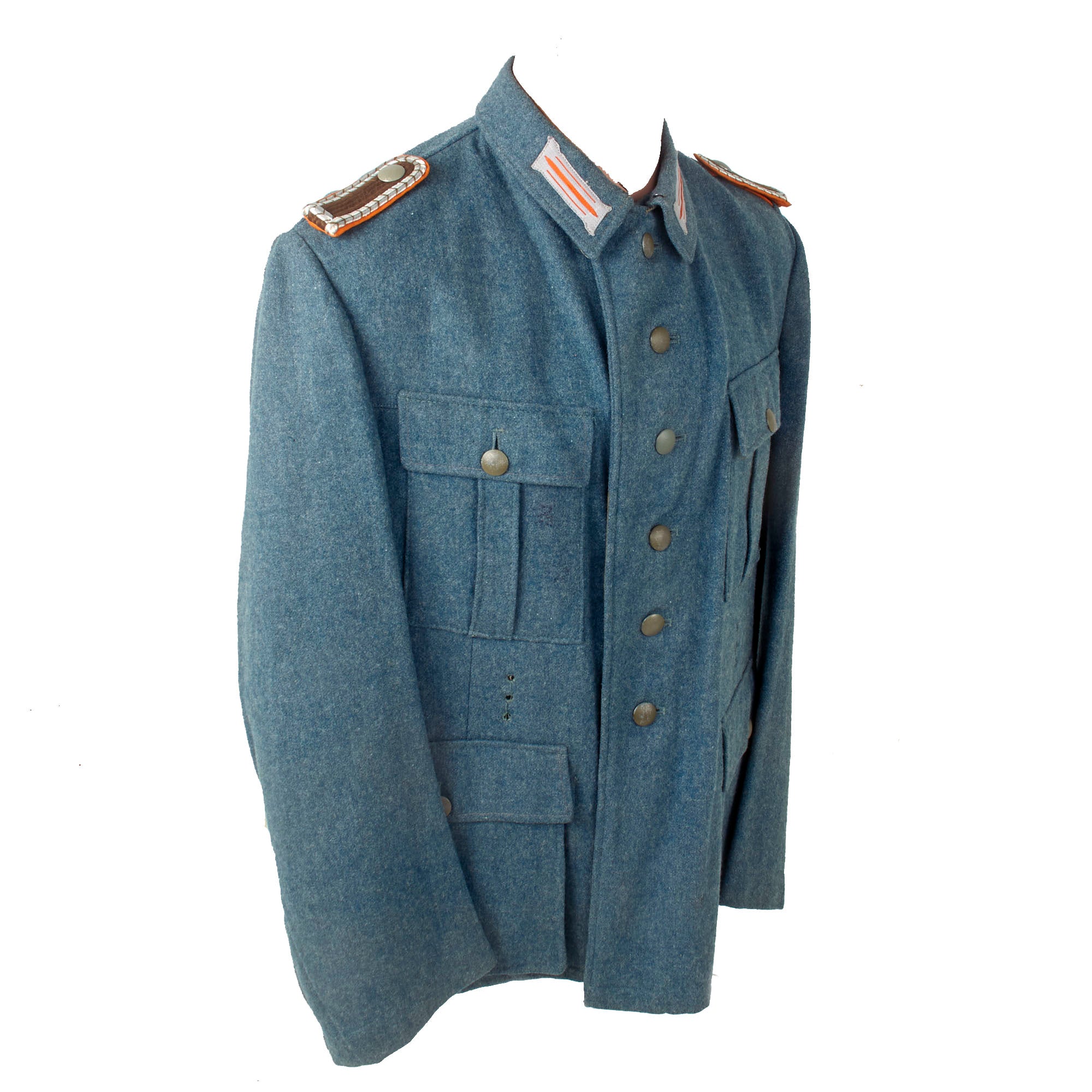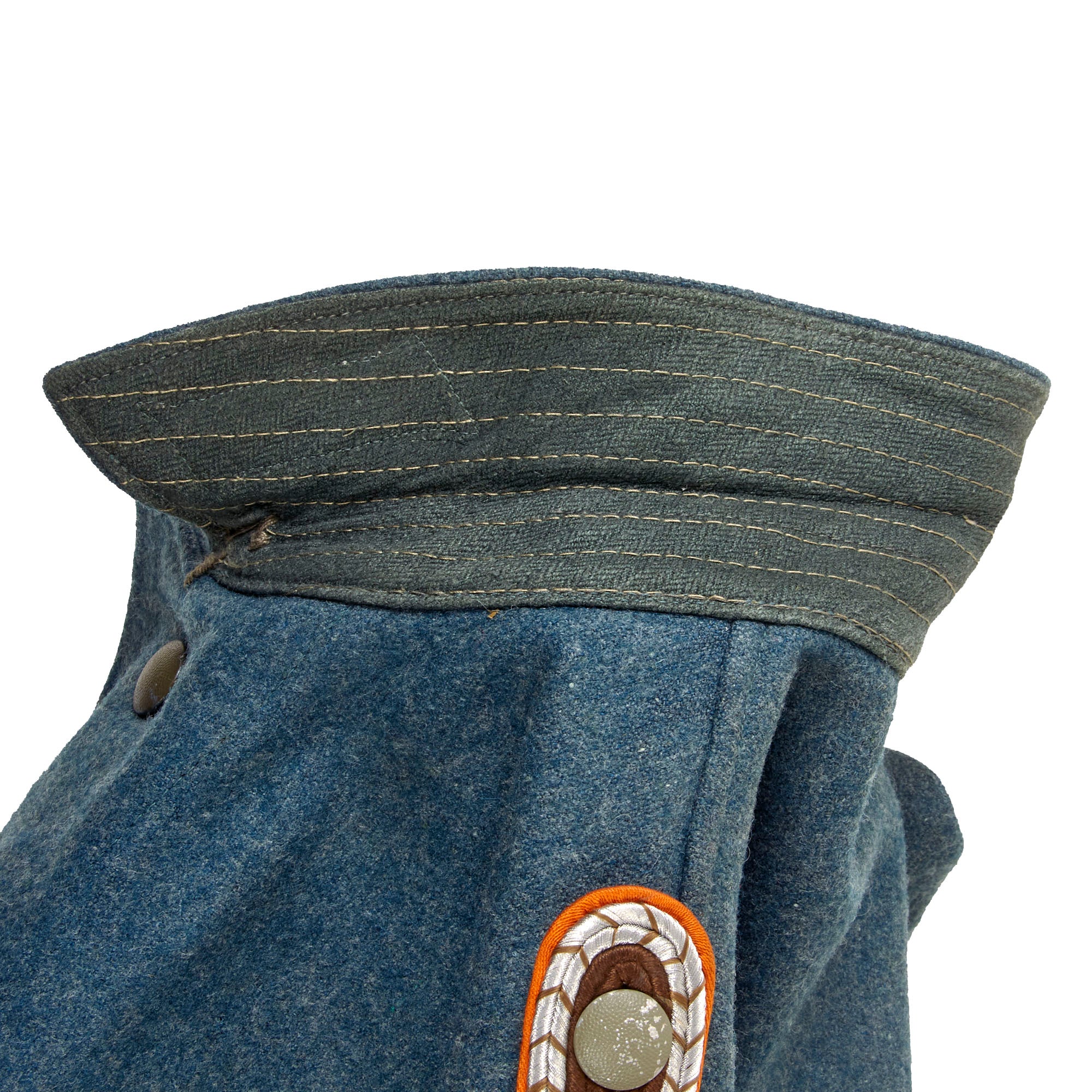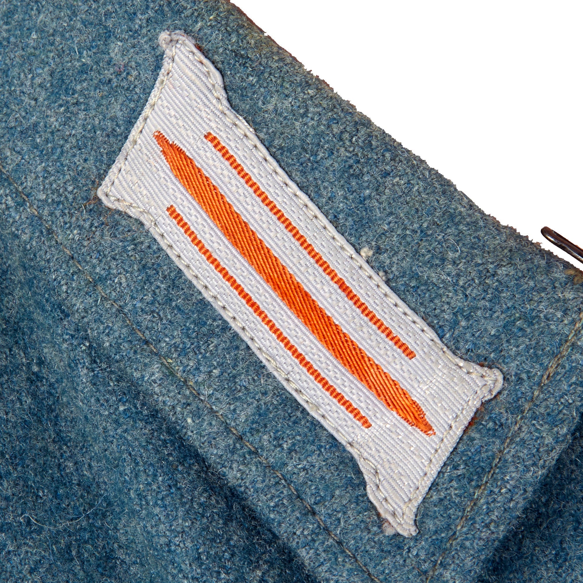 As this is a later war "field tunic", the brown "badge cloth" collar and sleeve adornments, as well as the piping, are not present. It features field style machine-woven police NCO's litzen collar patches on each side, made from light gray thread with Police Orange-gelb (Orange-yellow) stripes, the Truppenfarbe (Troop Color) of the Gendarmerie. As this is a Police tunic, there is no Wehrmachtadler breast eagle, and instead the uniform has a high quality machine embroidered Civic Police Eagle badge sewn to the left sleeve. As it is post 1941, there is no district marking, and it also is light gray on a police green background, which could be used for any branch.