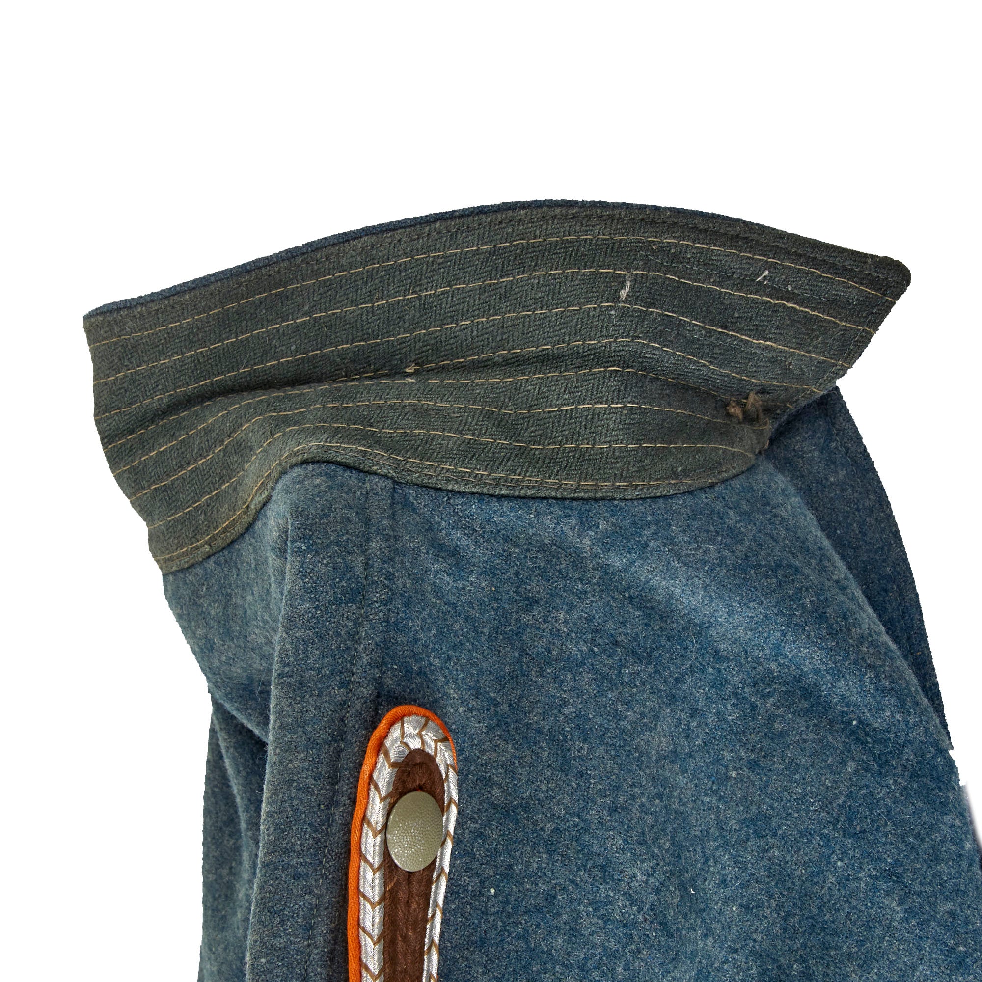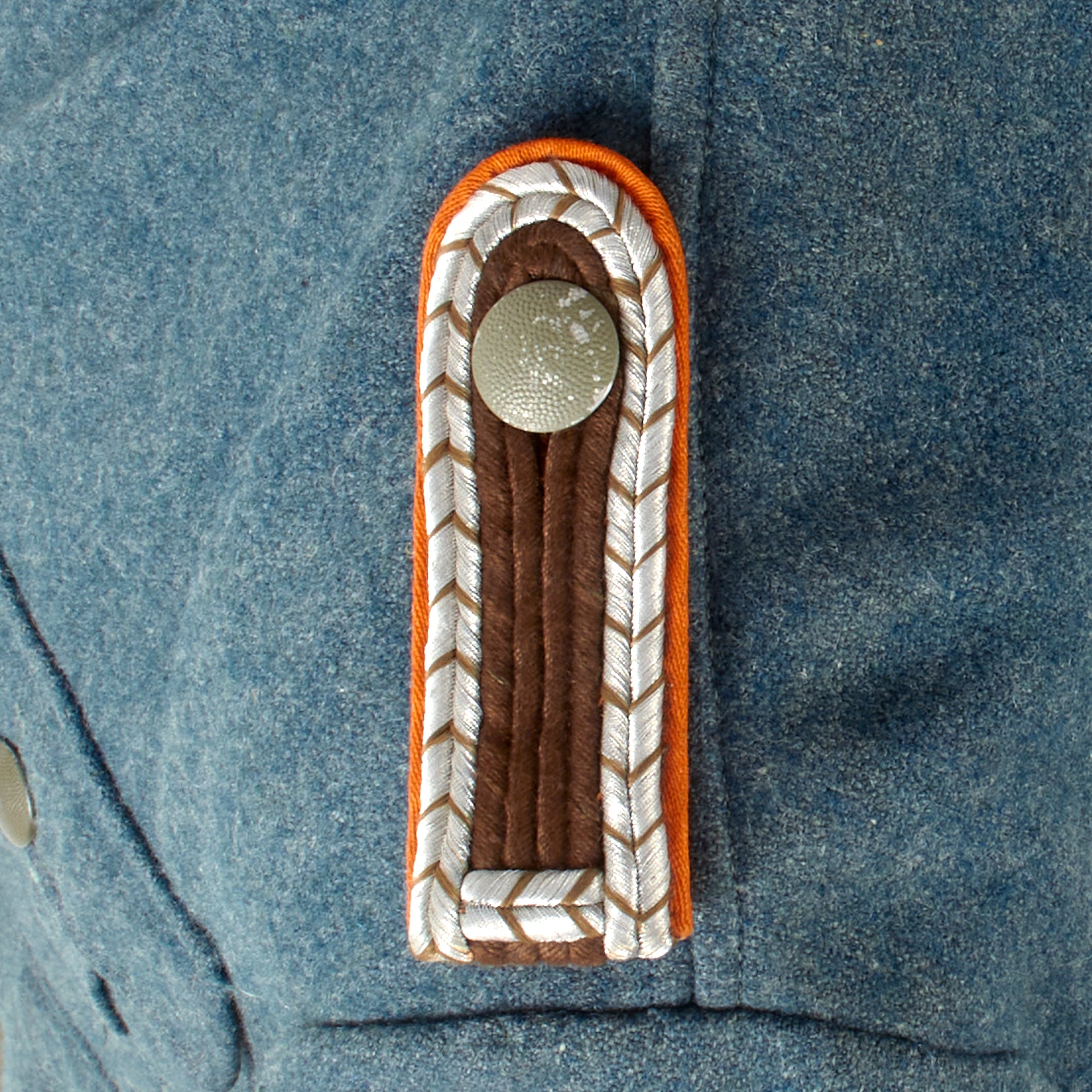 The button attached style NCO schulterklappen (shoulder boards) of this tunic are unique to the rank of Oberwachtmeister, and are bordered with a single row of of fine silver flatware "Russia Braid" double piping around the edge, with police chocolate brown chevrons woven into the design. Inside this is a row of brown double piping, and there is also bar of silver piping at the edge, closing in the brown. These are shoulder boards for the police rank of Oberwachtmeister (Senior Watch Master), equivalent to an SS-Scharführer or U.S. Army Staff Sergeant. They have the correct orange-yellow base material and straps for the Gendarmerie.