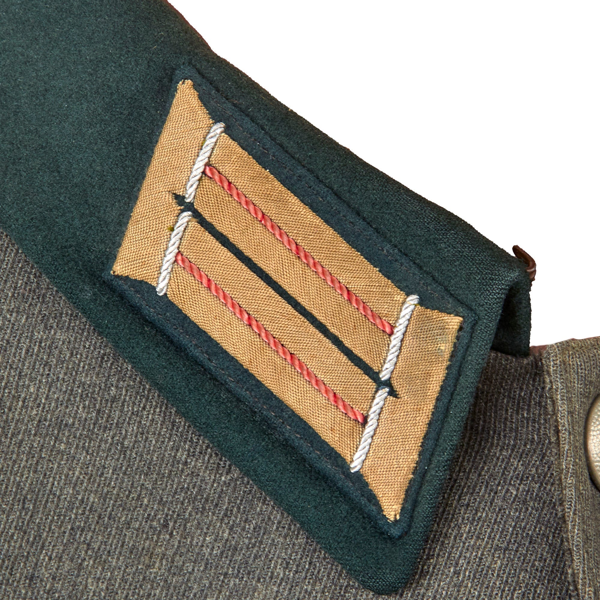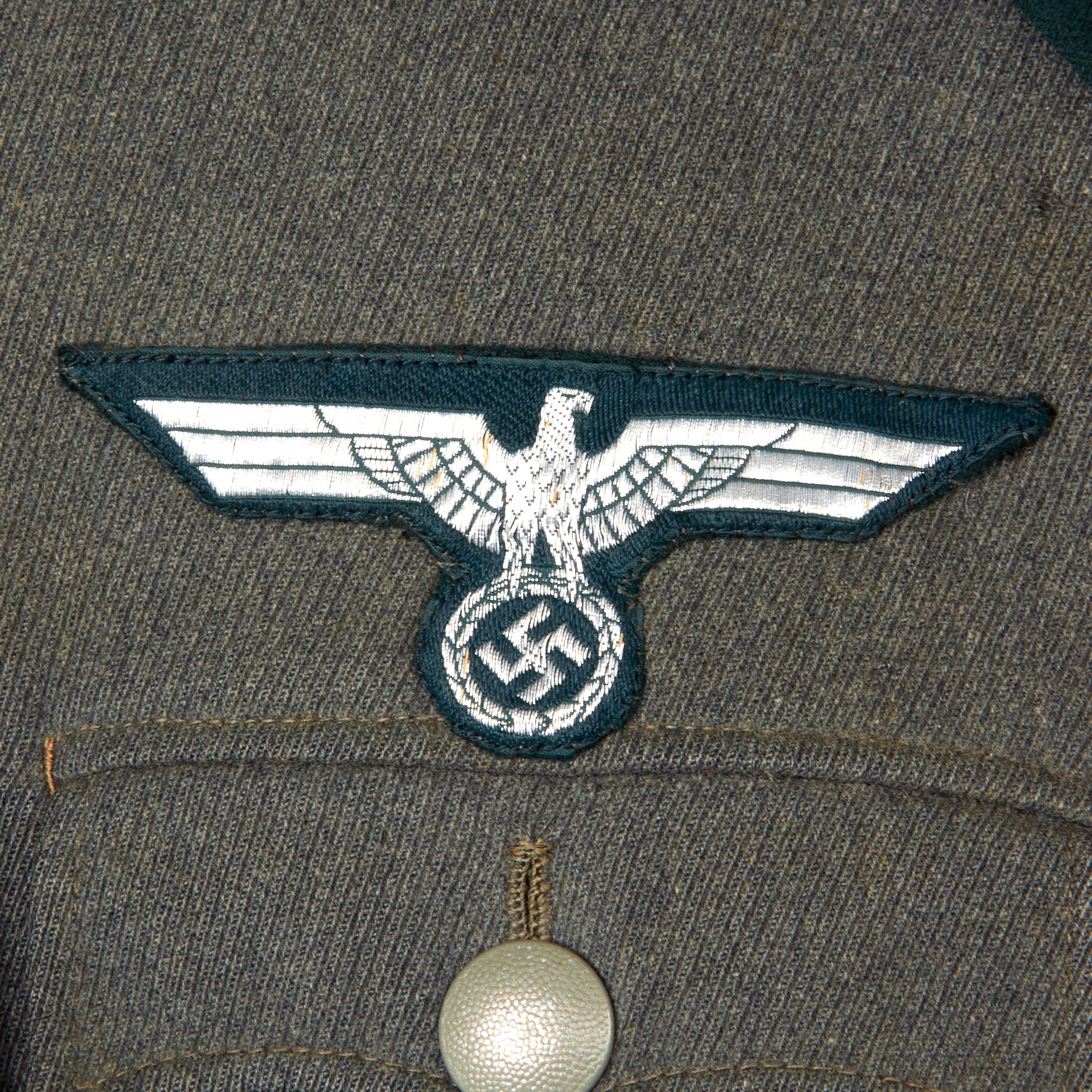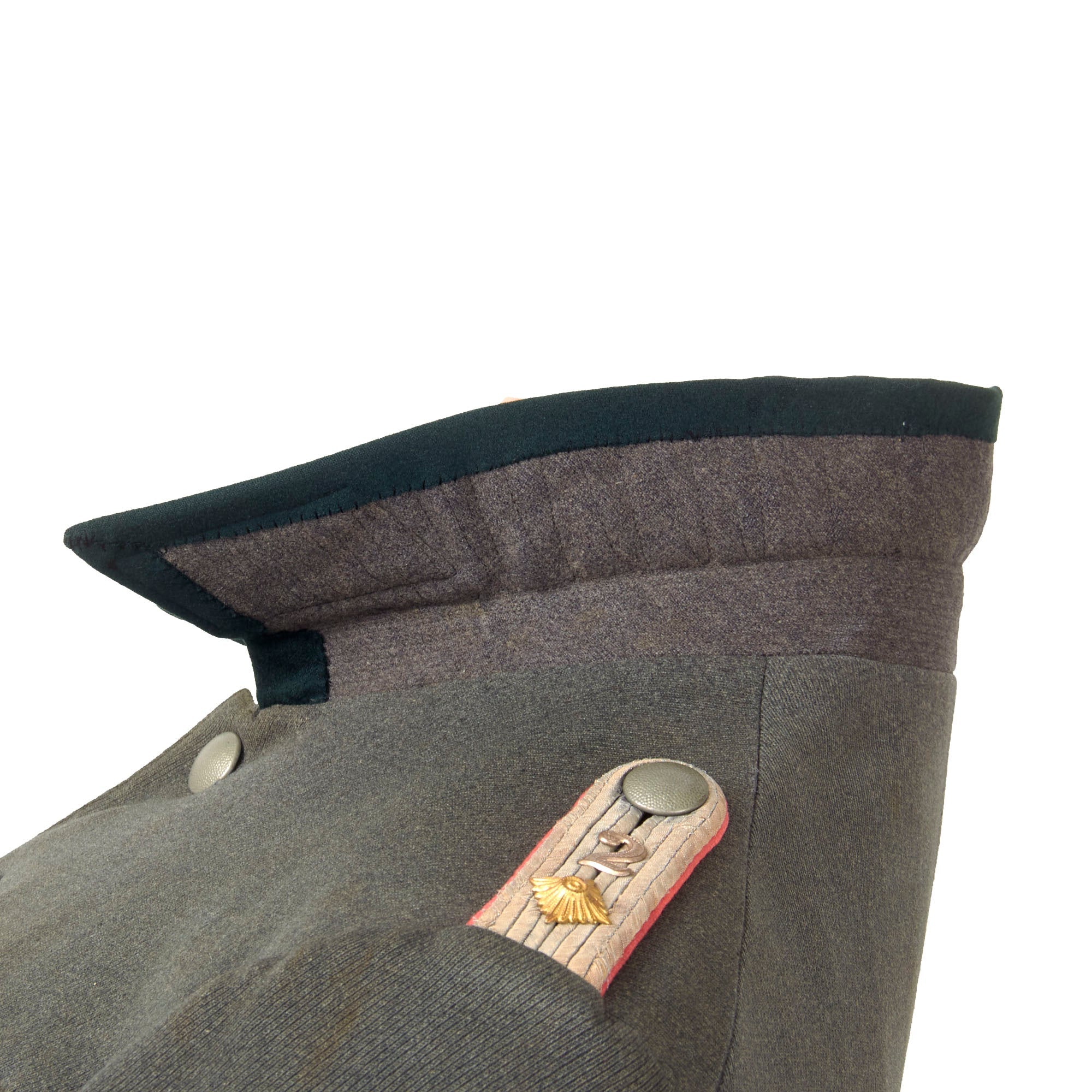It is adorned with the usual rank and branch insignia used on German tunics. The attractive Army breast eagle is an early war pattern officer's silver bullion machine embroidered silver flatwire type on a dark green background, and is stitched to the outer layer of fabric only. The collar is wrapped in flaschengrün (dark bottle-green) wool, and has officer's field litzen collar patches on each side, which are woven from silver bullion thread with dark bottle green backgrounds matching the collar. It is in good shape, though there is wear around the top edge, which is usually one of the first places to show damage from use.