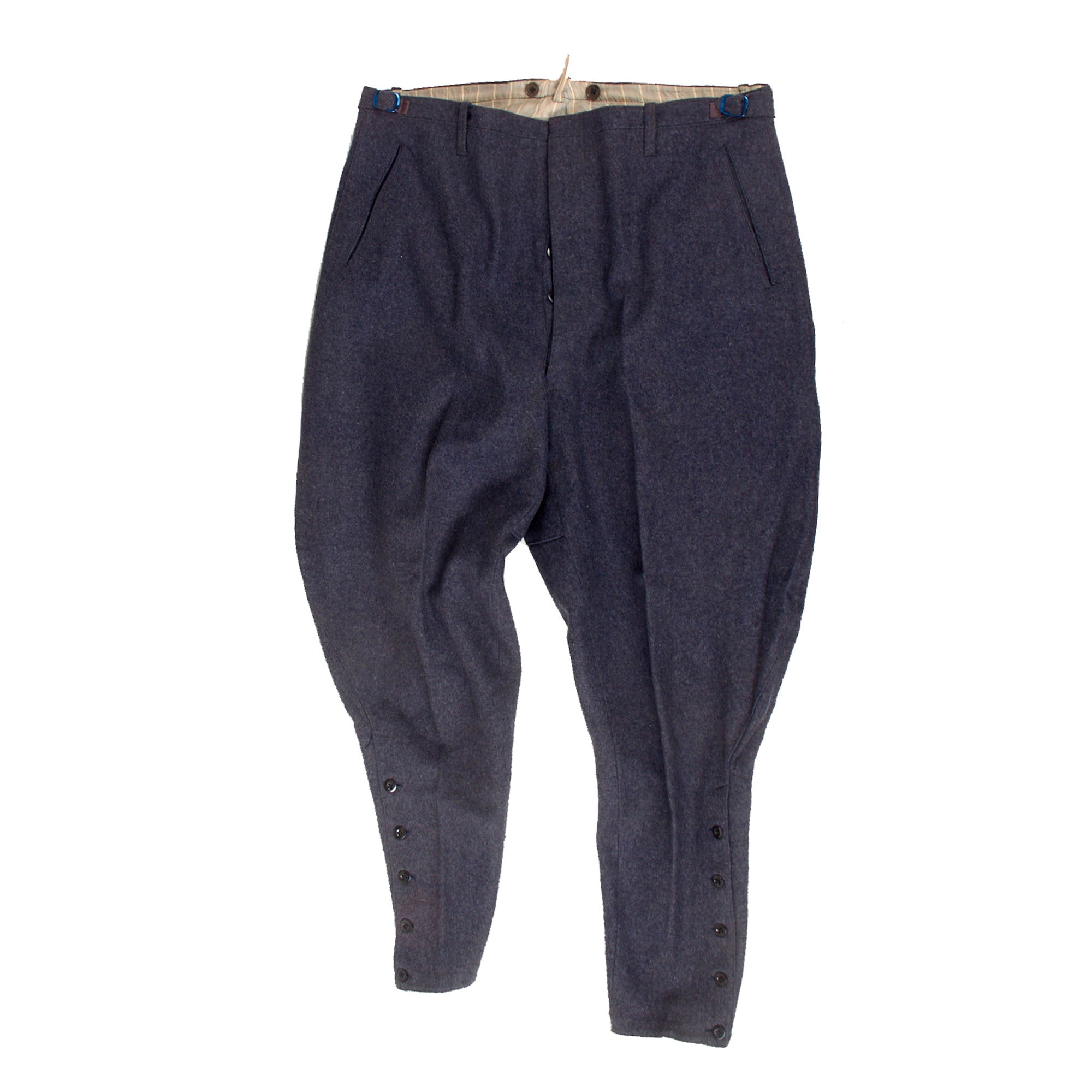 The included breeches are in very good condition, made from lovely "doeskin" weave steingrau (Stone Gray) wool fabric. They have a button fly closure with four hidden buttons under a hook and loop fastener at the top. There are suspender buttons on the inside of the waist band, and all 4 front and 2 rear buttons are present. There are adjustment straps on the sides of the waist band as well. They feature two slanted waist slash pockets with another button secored slash pocket on the right seat. The bottoms of the legs have five button closures to fit inside boots, and overall they are in lovely condition.