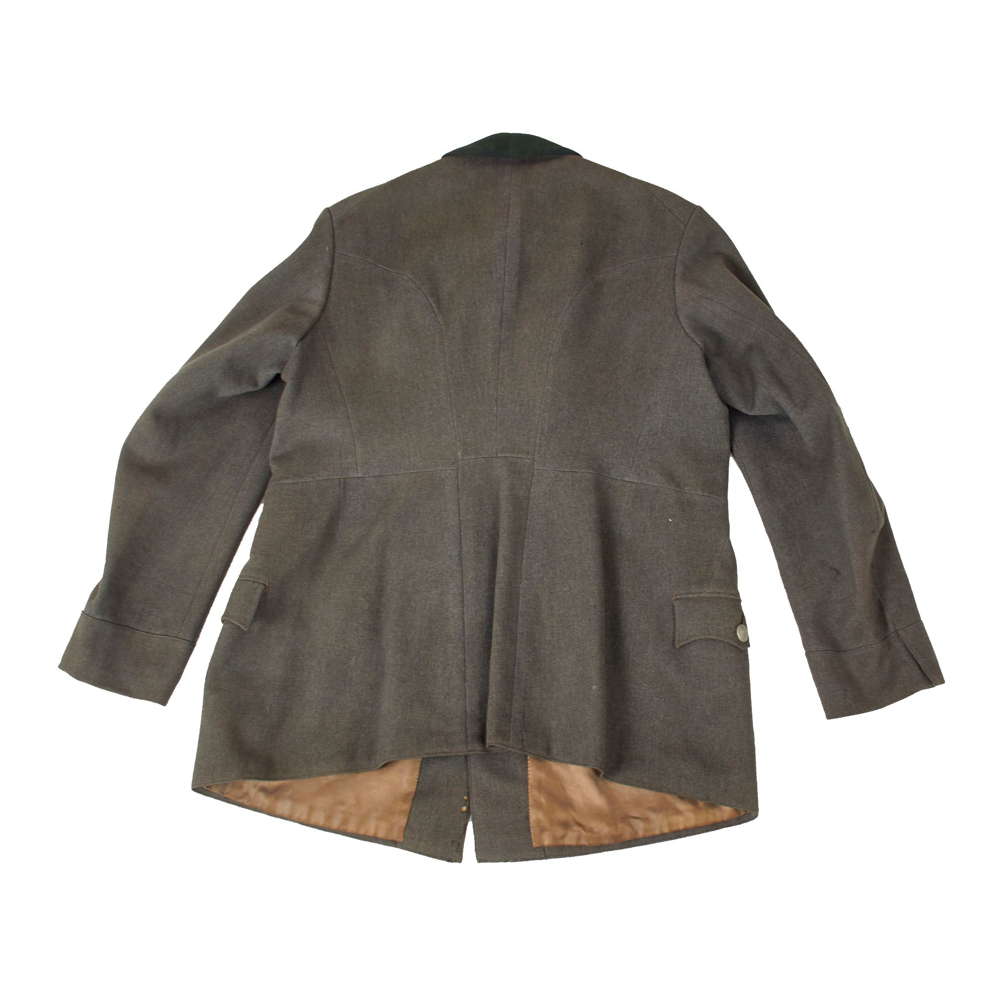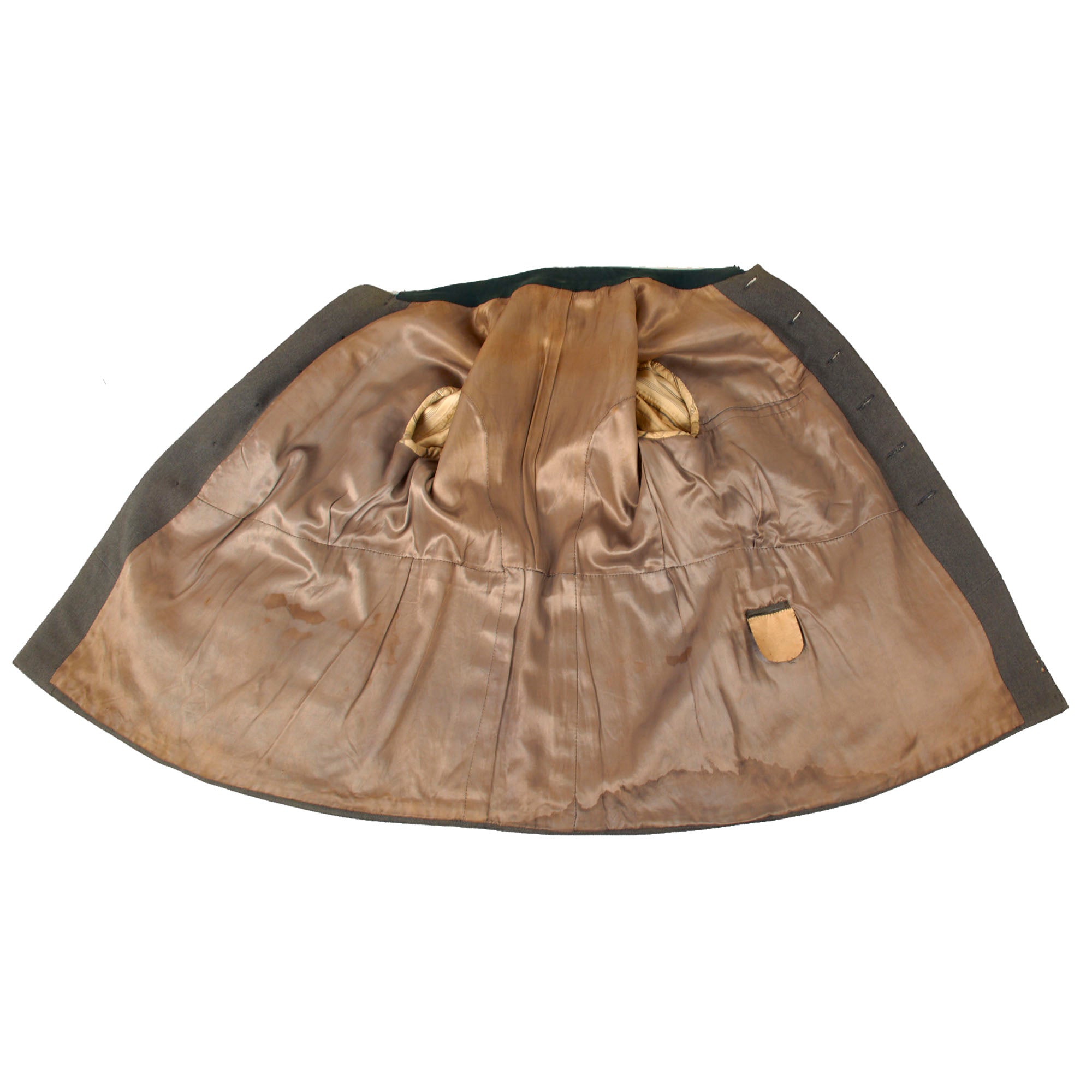 The interior is lined with with a very nice light green gray colored rayon cotton blend twill fabric, while the sleeves are lined with patterned rayon or cotton. There is a horizontal slash pockets on the inside of the left chest, which does not have any markings inside, and we were not able to see any maker marks anywhere on the interior. This means it is most likely a bespoke item made for this particular officer. It has the correct large eyelet opening into the left waist pocket for attachment of an officers dagger, which has some leather reinforcement below. We do not see any major repairs, just the usual wear and staining from service.