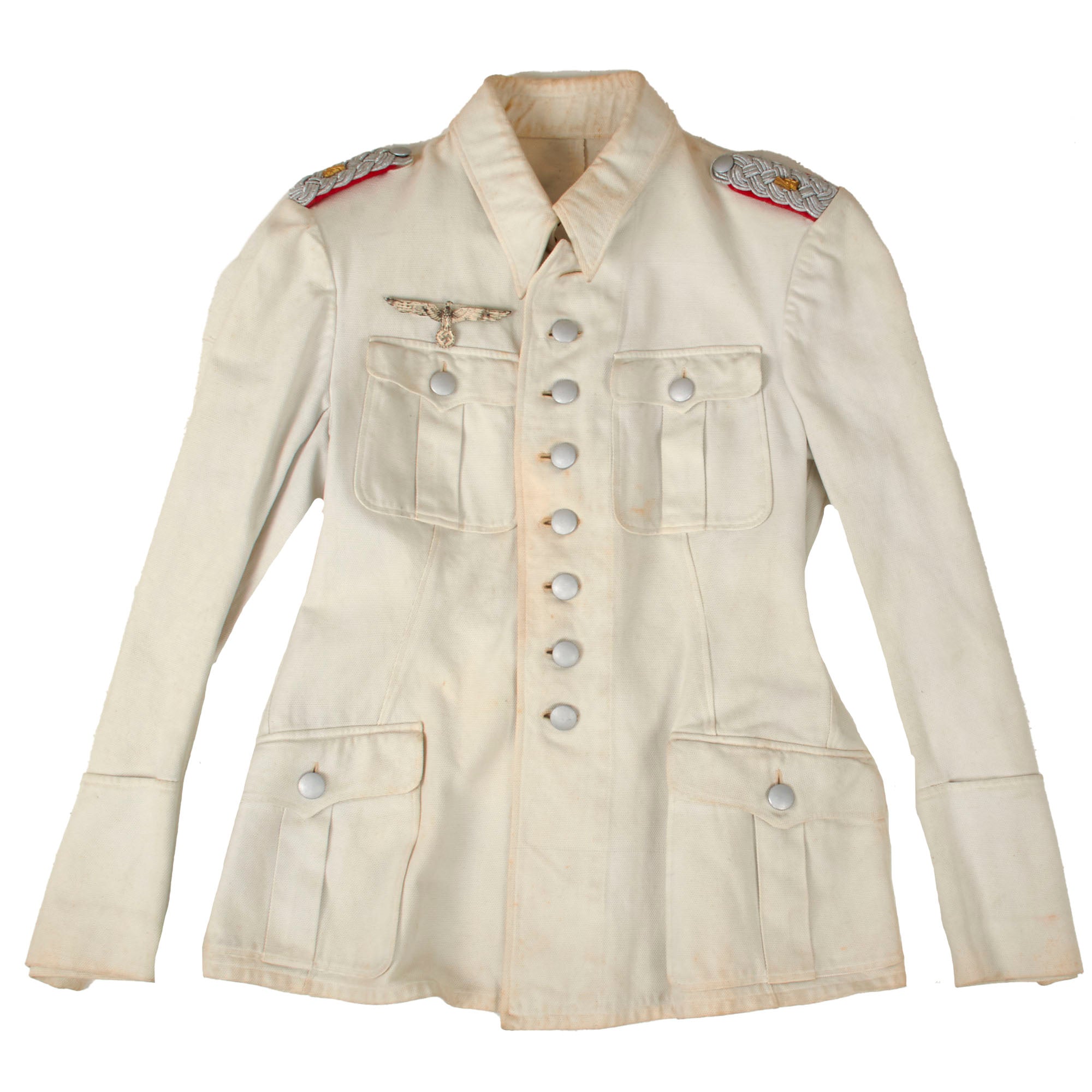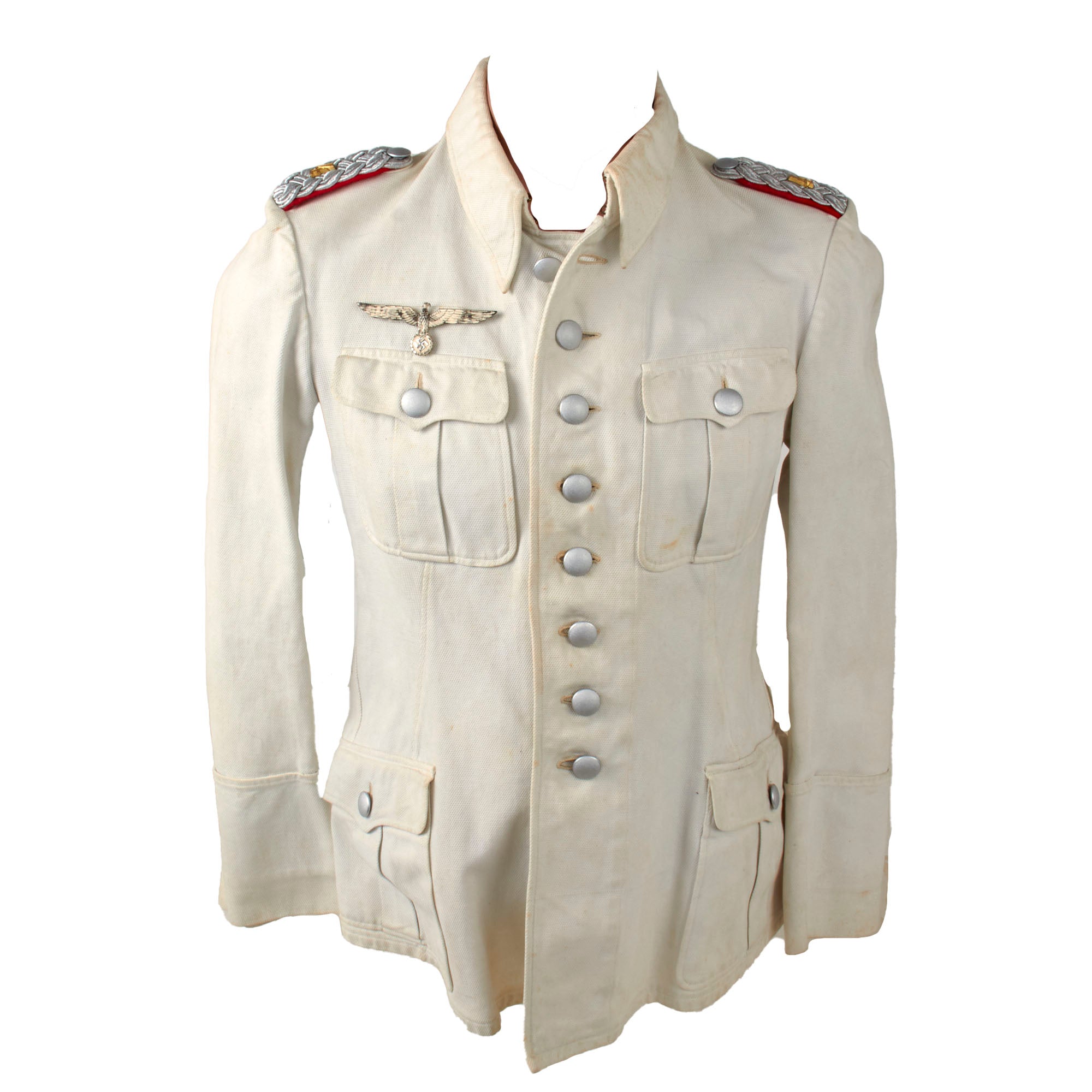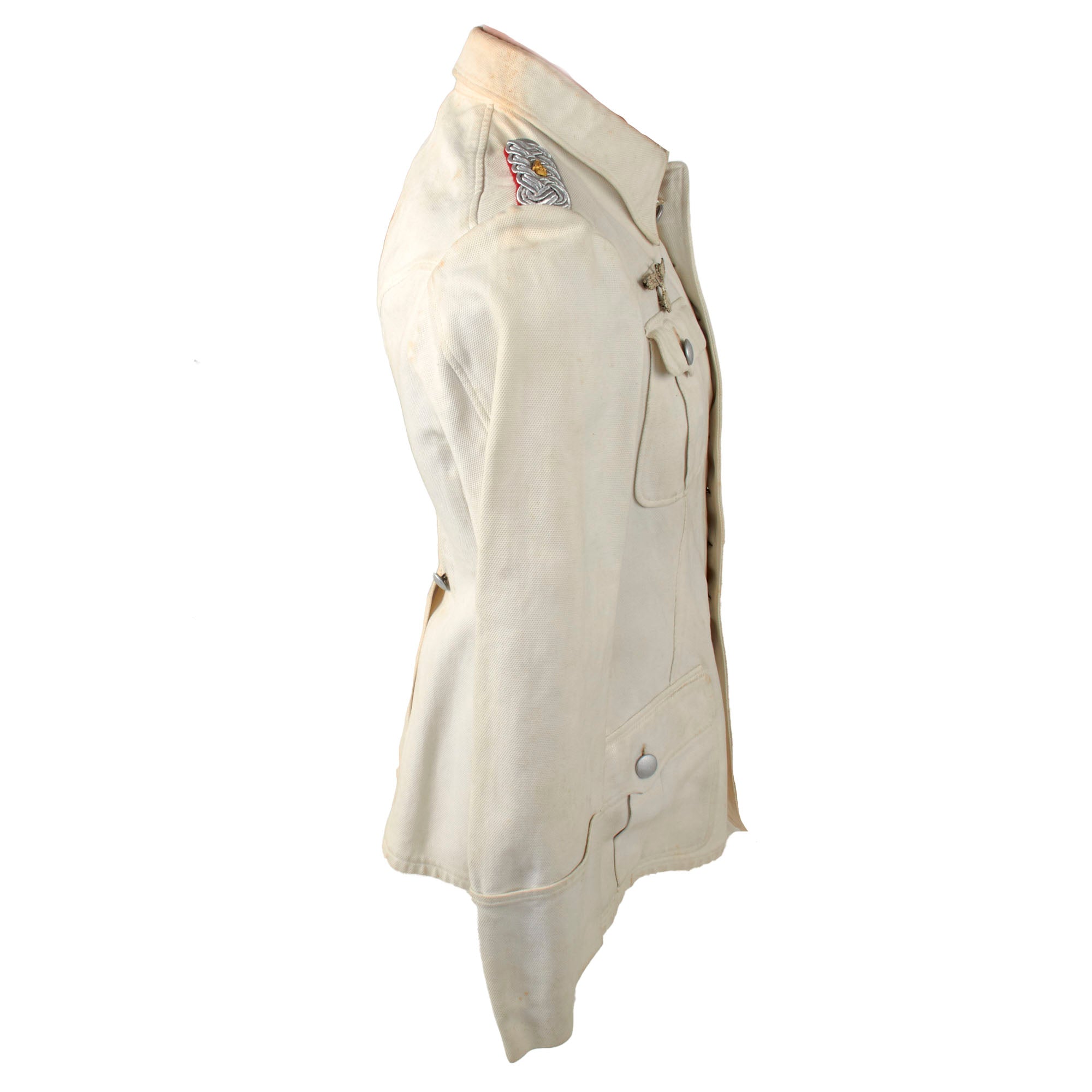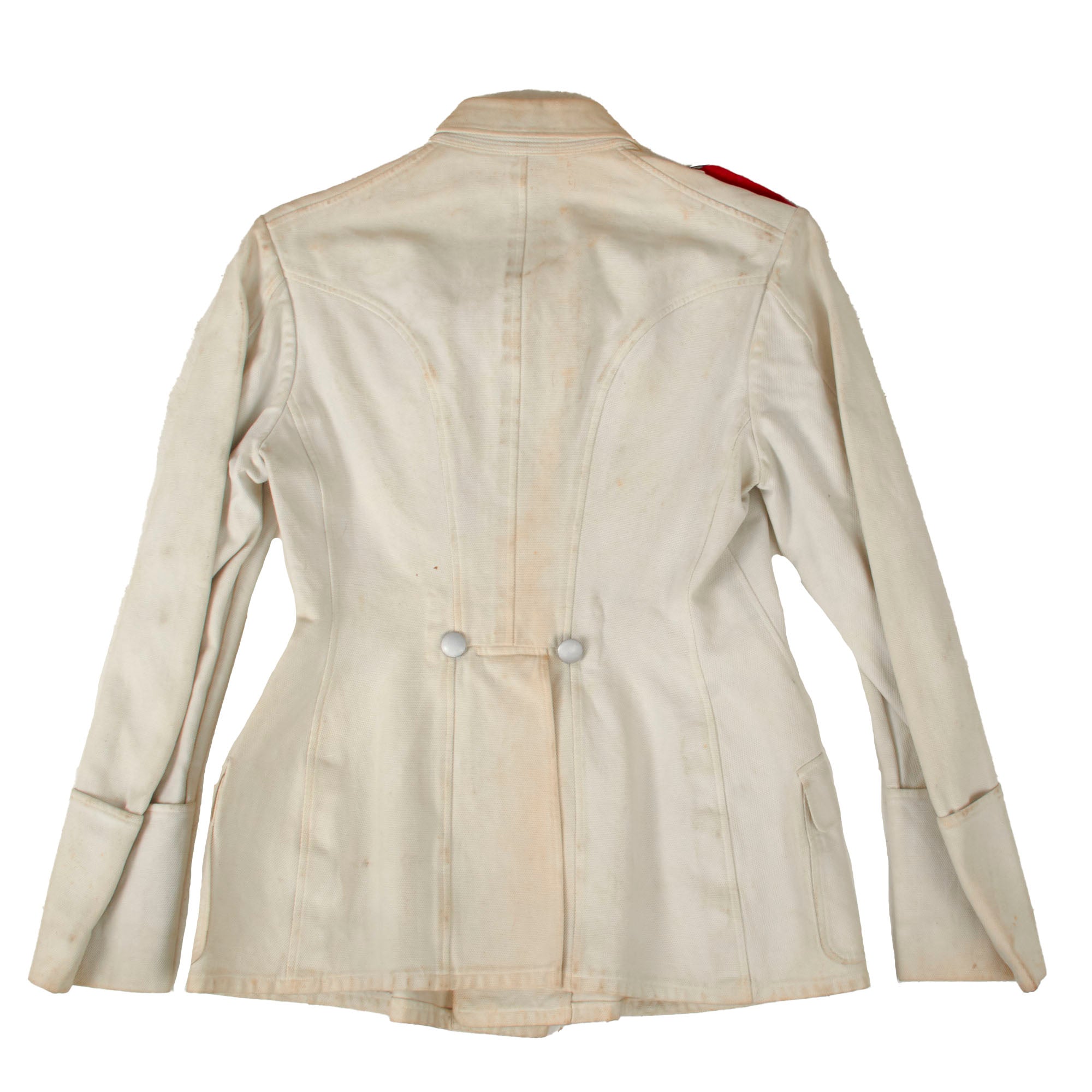 Original Item: Only One Available. This very nice condition summer tunic is fabricated from a white cotton material, which is both lightweight and soft, showing a very interesting star pattern weave. The front has vertical closure of 8 plated steel buttons with pebbled aluminum uppers, and there are also two hook and hoop closures for the collar. There are four pockets on the front, one on each breast and larger ones at the waist on both sides, each designed with a decorative pleat and pebbled buttons. All of the buttons except for those on the shoulders are retained by brass clips on the back. The tunic is not lined, and there are no internal pockets, though there is the correct eyelet opening into the left waist pocket for an officer dagger.