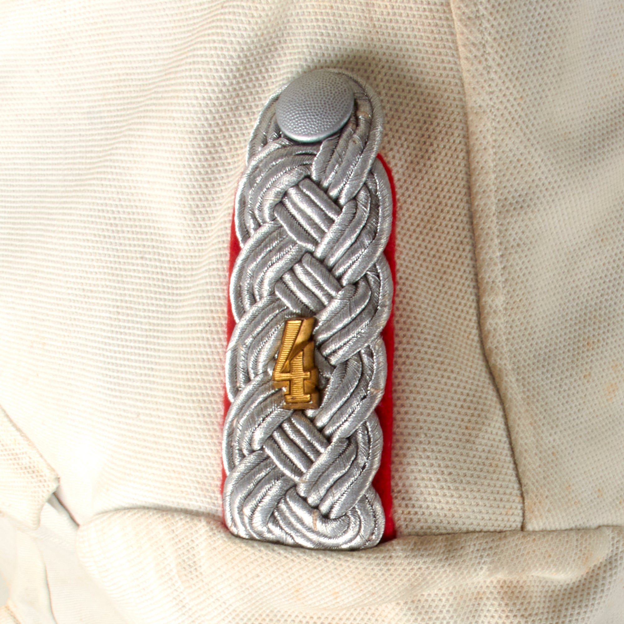The right breast above the pocket is enriched with a silvered metal breast eagle insignia pin held in place via a horizontally-aligned vertical white sleeve, with a horizontal loop below which attaches to a hook on the bottom. As is correct for a summer uniform, there are no collar tab insignia present. The shoulders are adorned with Heer Artillery Stabsoffiziere Schulterstücken (Staff Officer shoulder boards), incorporating two rows of fine silver flatware "Russia Braid" double piping, which are plaited together to form a loop around the buttonhole. The sides and underside are Hochrot (Deep Red), which was the Waffenfarbe (corps color) during WWII for Artillery, as well as General Level Officers. As this is a Staff Grade officer, it must be for Artillery. There are no rank "pips" installed, indicating the rank of Major, equivalent to the same Rank in the U.S. Army. There is also a gold number 4 cypher, most likely for the 4th Artillery Regiment.