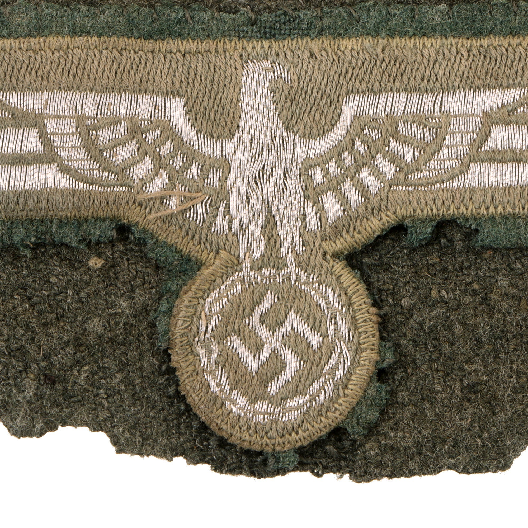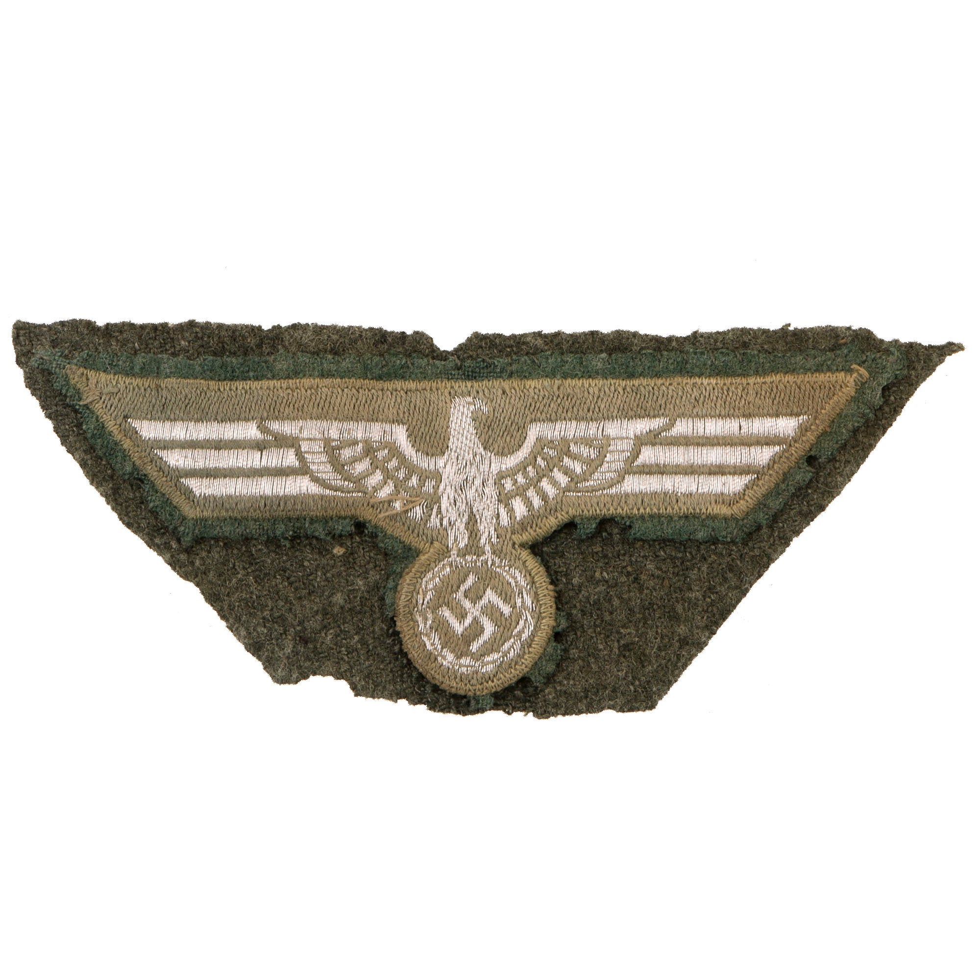 This example was cut off a uniform, complete with some surrounding fabric, and looks to have been relatively well cut. The insignia is about 4 1/2" x 1 3/4", with the uniform section measuring approximately 5" x 2". After being removed, the eagle and fabric did suffer moth damage to the wool portions, which has resulted in loss of almost all of the fuzzy "nap" on the fabric, and also damaging the backing in areas as shown.