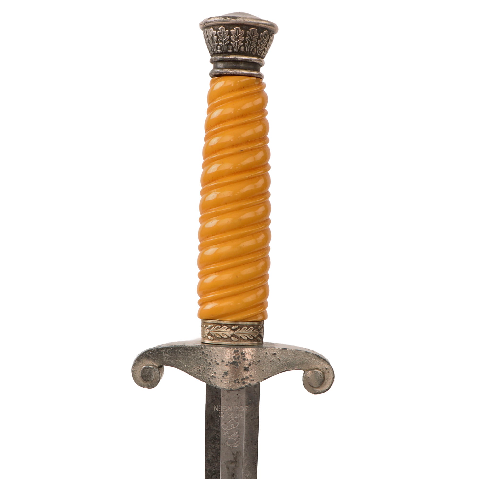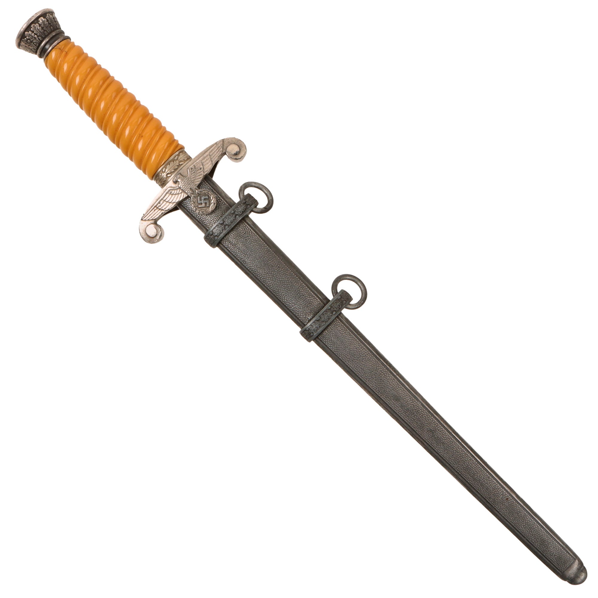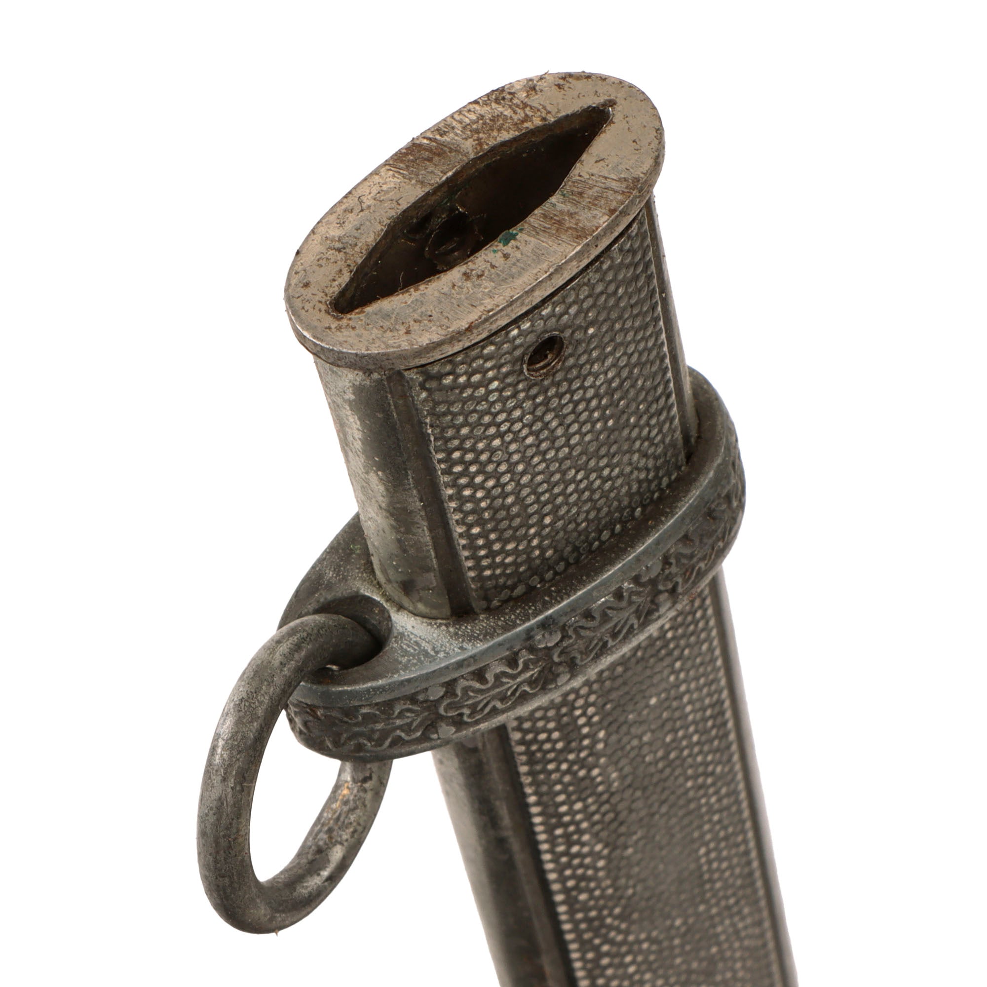 The pommel depicted oak leafing around the outer circumference. The scabbard had panels of pebble designs. Later produced examples were plated with nickel, and late war-made pieces were unplated, finished in a gray color metal. These daggers are often encountered with an aluminum portepee.