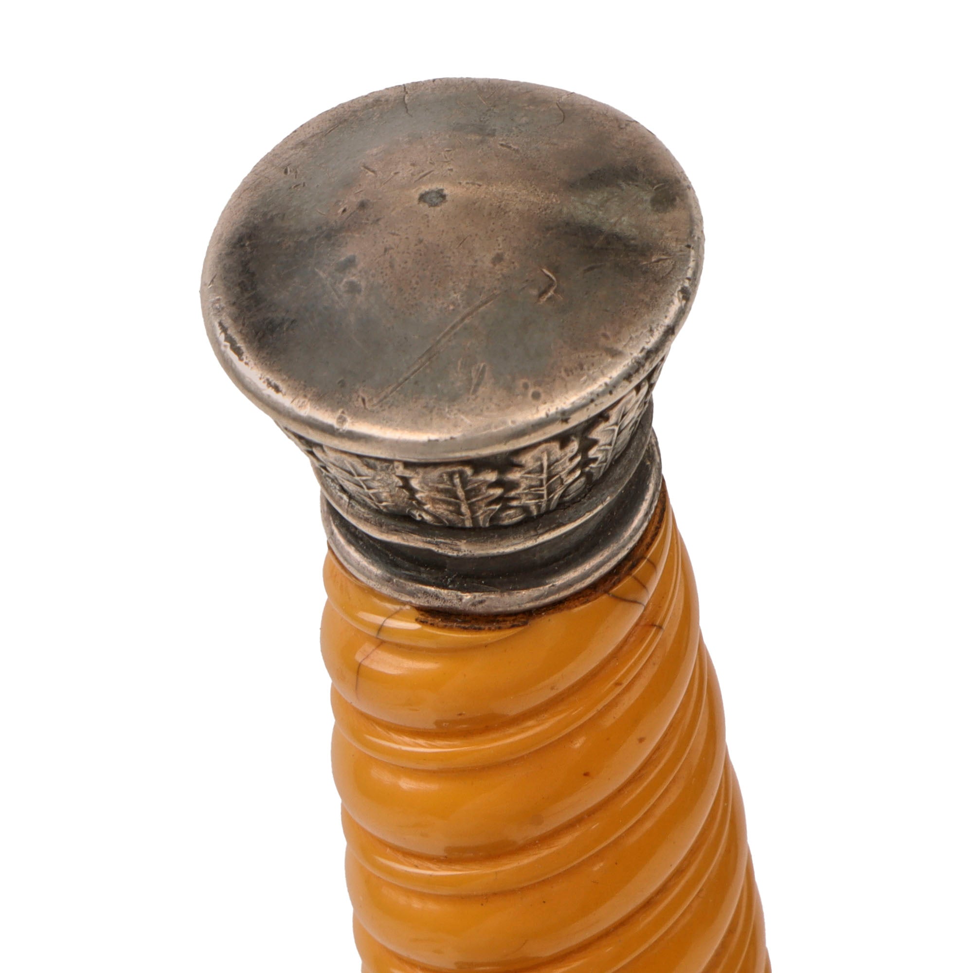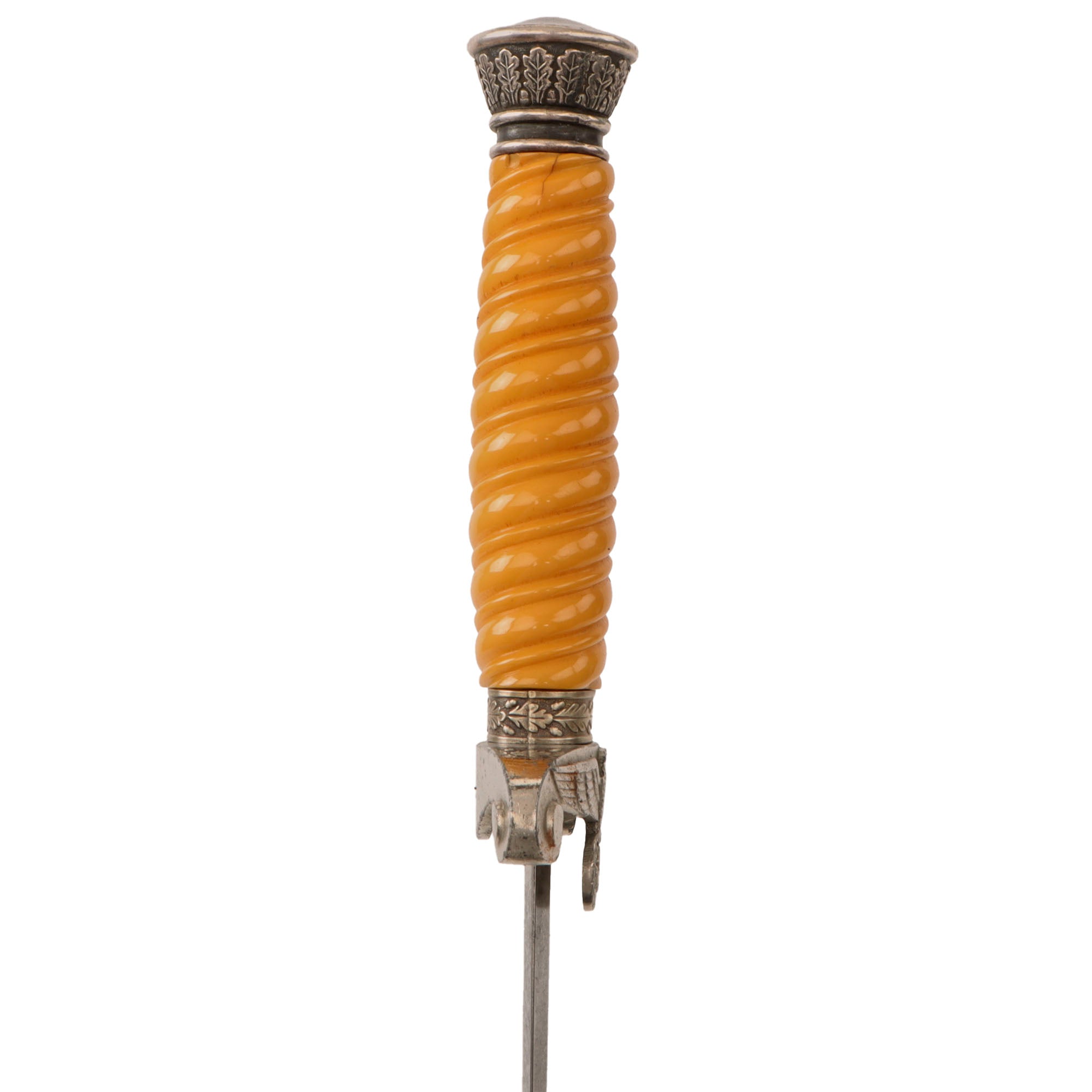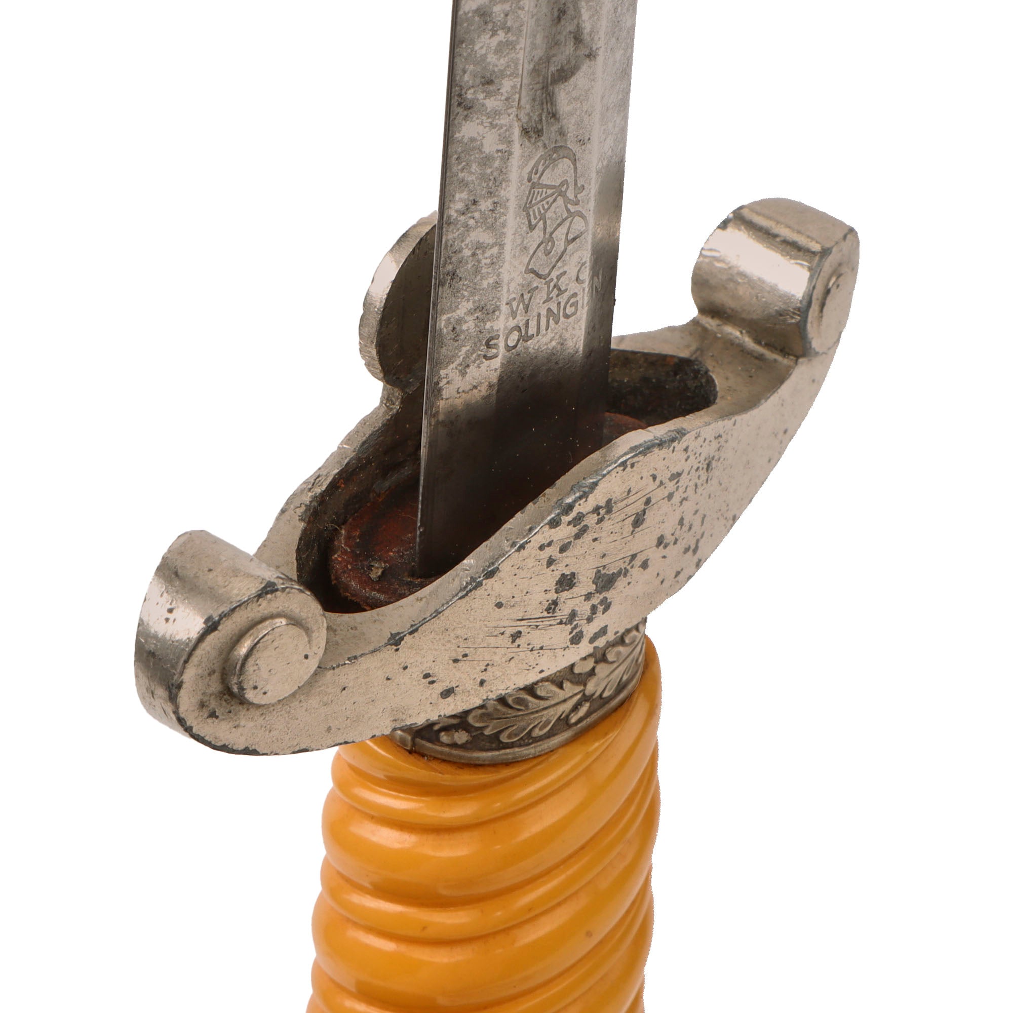The zinc alloy cross guard is in similar condition, still retaining much of the original plating, but definitely showing wear from cleaning and use. The details throughout the characteristic WKC eagle are still present throughout the head, breast and wing feathering, talons and wreathed mobile swas (hook cross). The leather blade buffer is still present in the recess on top of the guard. The grip is a great amber color, aged from the original ivory white. This grip is in very good condition, showing some light cracking and chipping near the pommel, but no major damage. The alloy grip ferrule is in lovely condition, showing a great lightly oxidized patina.