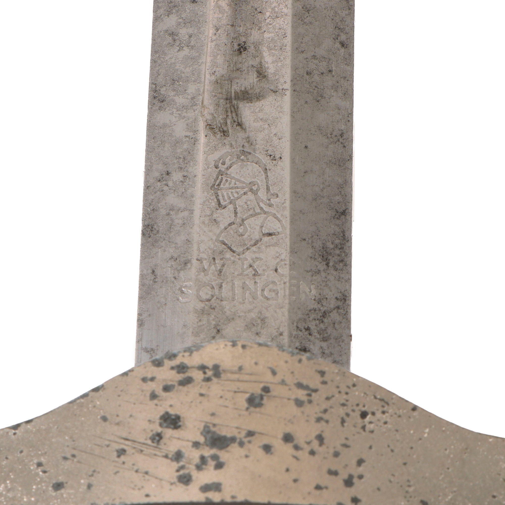 The reverse ricasso is etched with the trademark "Knights-Head" (Ritter-helm) logo of legendary maker Weyersberg Kirschbaum & Cie of Solingen, over the firms initials of WKC / SOLINGEN. This company is a famous manufacturer of military swords and cutlery in Solingen, Germany - a city famous since the middle ages for its metal-working and craftsmanship in sword making. Per J. Anthony Carter's fine work GERMAN SWORD AND KNIFE MAKERS, the traditional manufacturing of swords at WKC dates back to the year 1774 when the Weyersberg first registered the ''Kings head'' as their trademark. Later in 1883 the company merged with the Kirschbaums and the company Weyersberg Kirschbaum & Cie was formed, which continued into the Weimar Period. It then rebranded as W.K.C. Waffenfabrik GmbH, and produced many edged weapons during the NSDAP Period. The company is still in operation today.