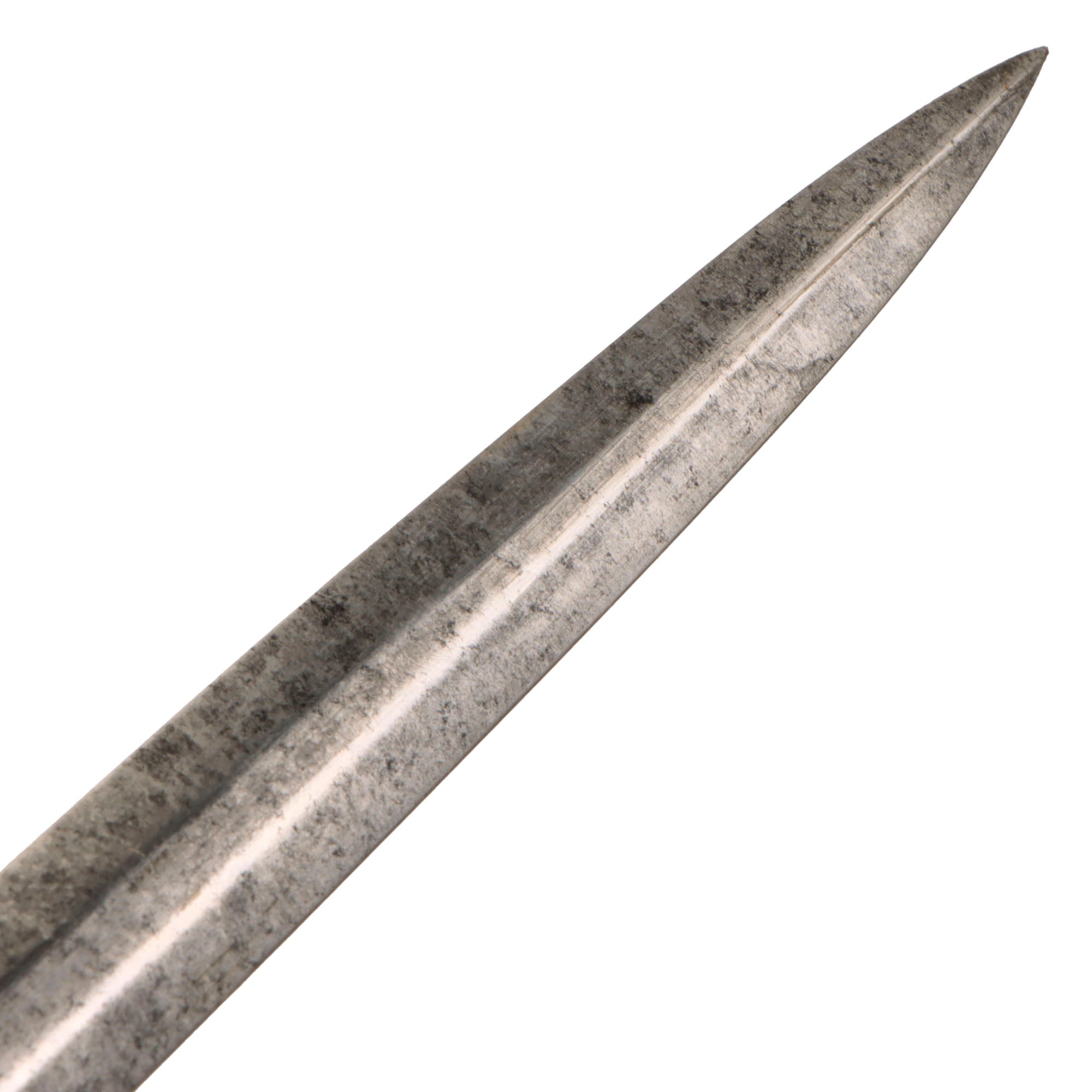 The blade on this dagger has definitely seen exposure to the elements, and now displays a stained patina with signs of pats water staining and light peppering, now partly cleaned away. We still can however see some areas near the ricasso where the original factory final polish crossgrain is still evident. This texture is iconic, and is the definitive identifying characteristic for a real WWII German Blade. The needle-like tip is intact and unbent, and the edges have correctly not been sharpened, though cleaning has made the overall geometry a bit "soft".