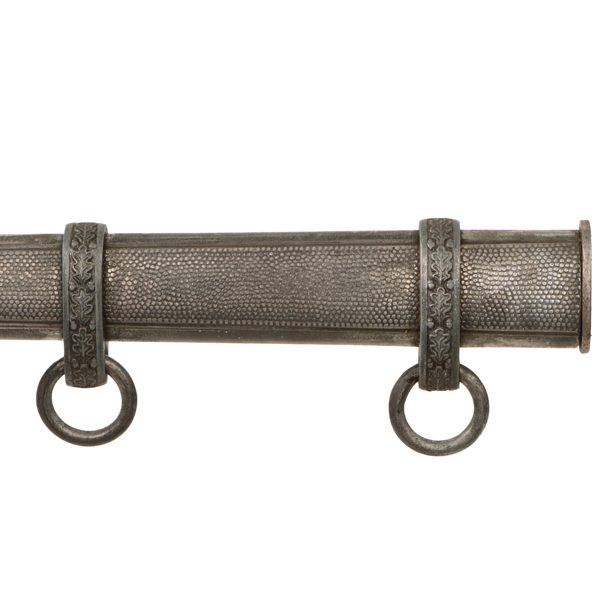 The scabbard is a classic WKC example, and looks to originally have been bright zinc plated, which has turned a lovely gray color over the years, showing no real areas of wear through. This scabbard does not have any dents we can see, and it still has crisp finely grained panels. The carrying bands have an excellent pattern of overlapping oak leaves and acorns, with hand enhancing evident on each of the leaves, though they do show some moderate oxidation.