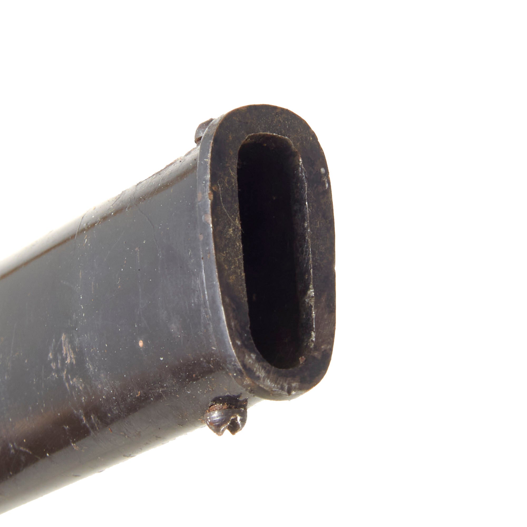 The steel scabbard of this example is very good shape, still straight and dent free. It still retains about 90% of the original factory black enamel finish, which shows just a bit of wear and chipping, mostly around the hanger ring, and there is some oxidation where the finish is missing.. There is also a lovely pattern of checking and crazing in the enamel, confirming the age. It still retains both throat screws, the hanger loop, and the slot for hitching up the sword to the belt when indoors.