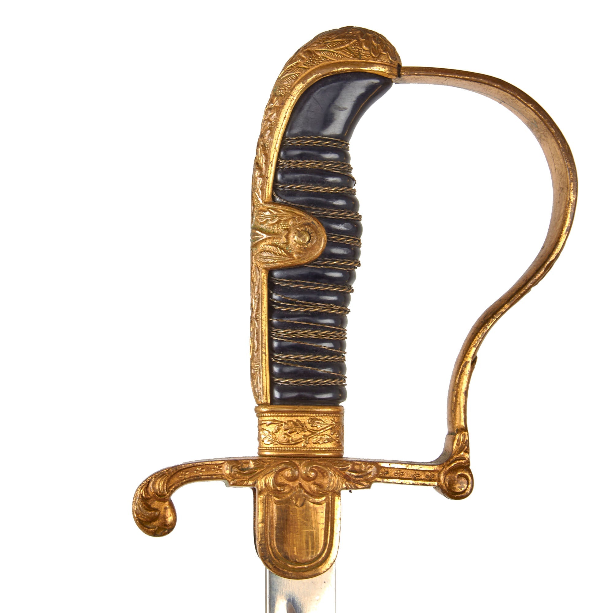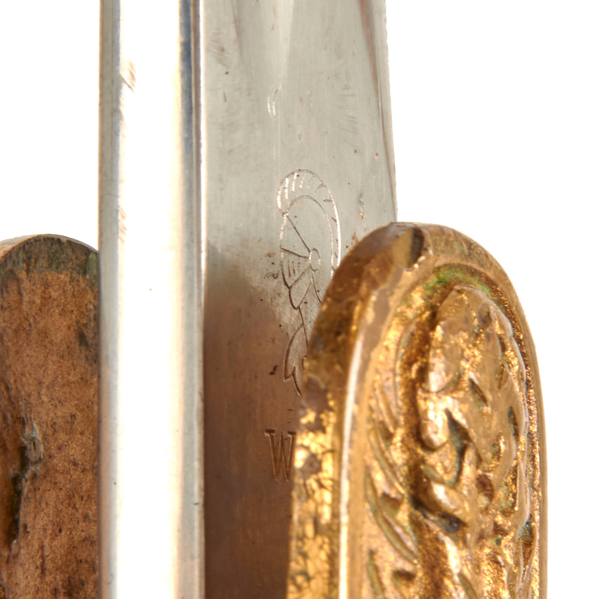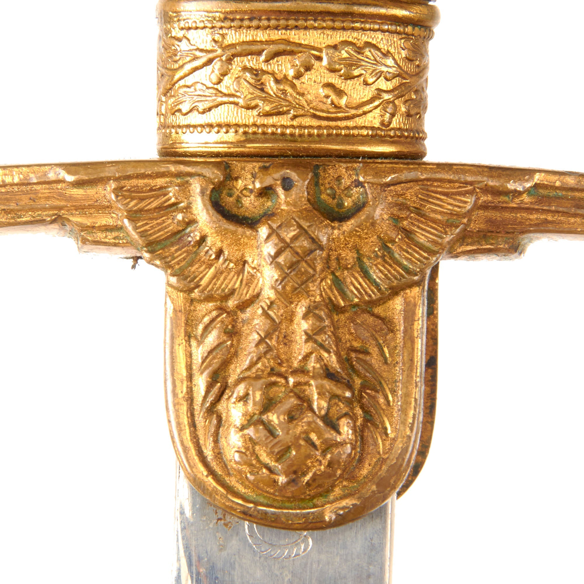 The hilt on this example is the classic gilt brass alloy, not the later war plated aluminum. Unlike most that we see, it still retains a good amount amount of the original gilding overall, which is just a bit better retained in the recesses of the design. There is no major patination or oxidation on the raised areas, just a bit at the very top of the eagle, so it was definitely well taken care of. Really a lovely looking hilt, with all of the details still there. The dove head hilt on this pattern is plain, showing engraved German "oak leaf and acorn" motifs on the back strap, side tabs, and guard. The cross guard langet has a lovely "spread-wing" Wehrmachtadler eagle that looks to the left, while the reverse langet has a shield shaped field where a monogram could be added, but this example as blank. There is lots of hand enhancing and the leaves all show a pebbled texture.