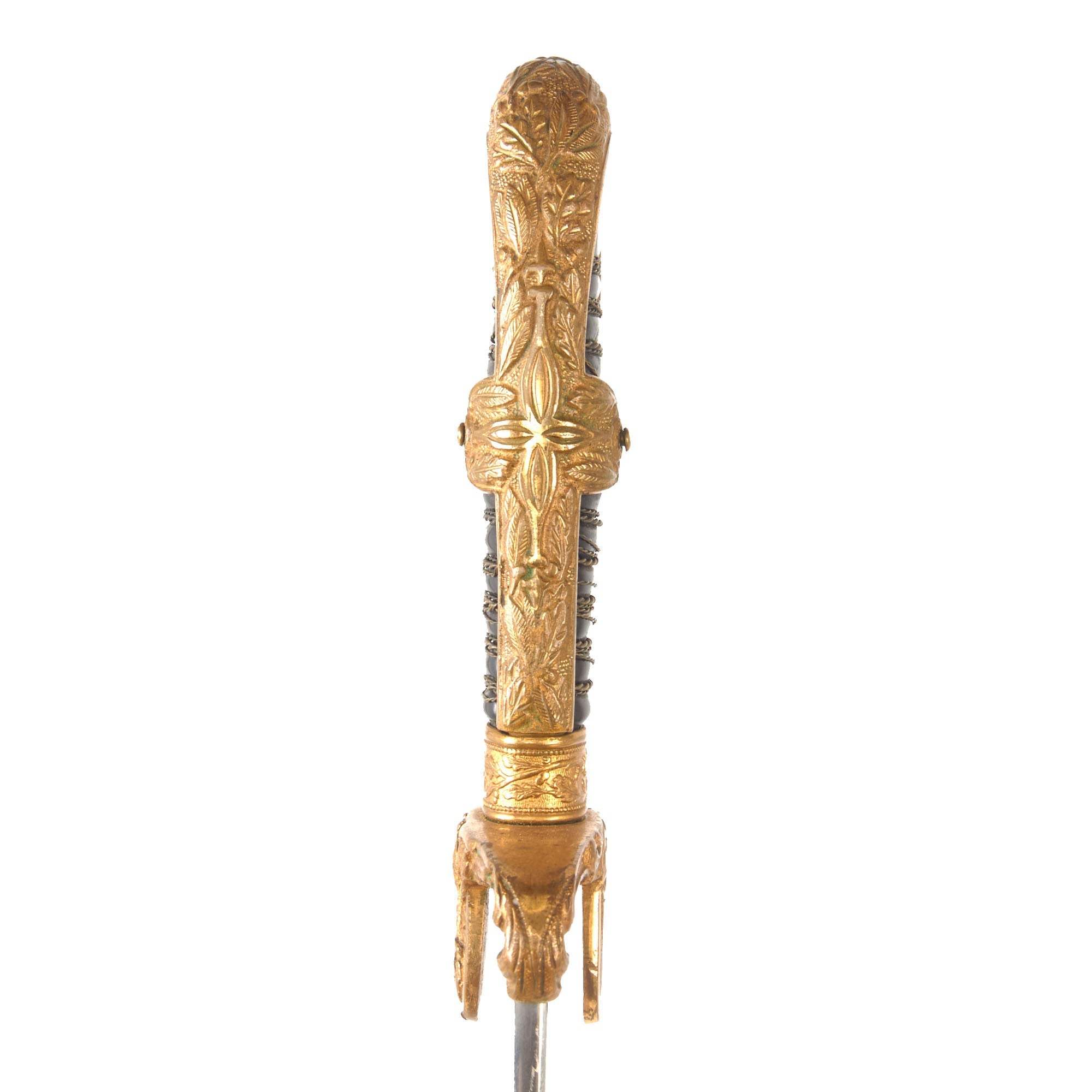 The grip of this example is a black celluloid over a carved wood base. The celluloid is still in very good condition with no cracking or chipping, showing very little wear. The grip is wrapped with triple pairs of twisted wire, the center set being larger in diameter,, which now show a lovely matured patina. The wrapping is a bit loose, with some twisted strands out of place, but all are still present. There is a bit of play on all of the hilt components, but nothing out of the ordinary.