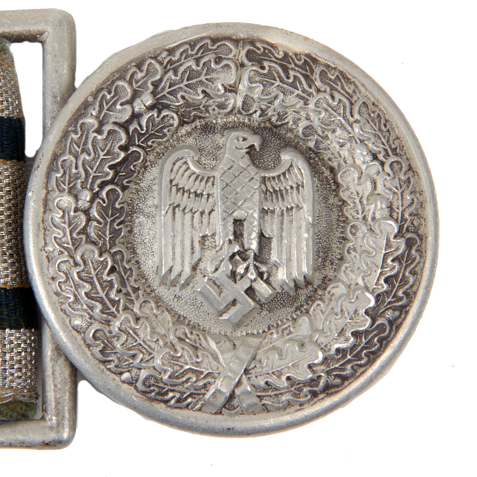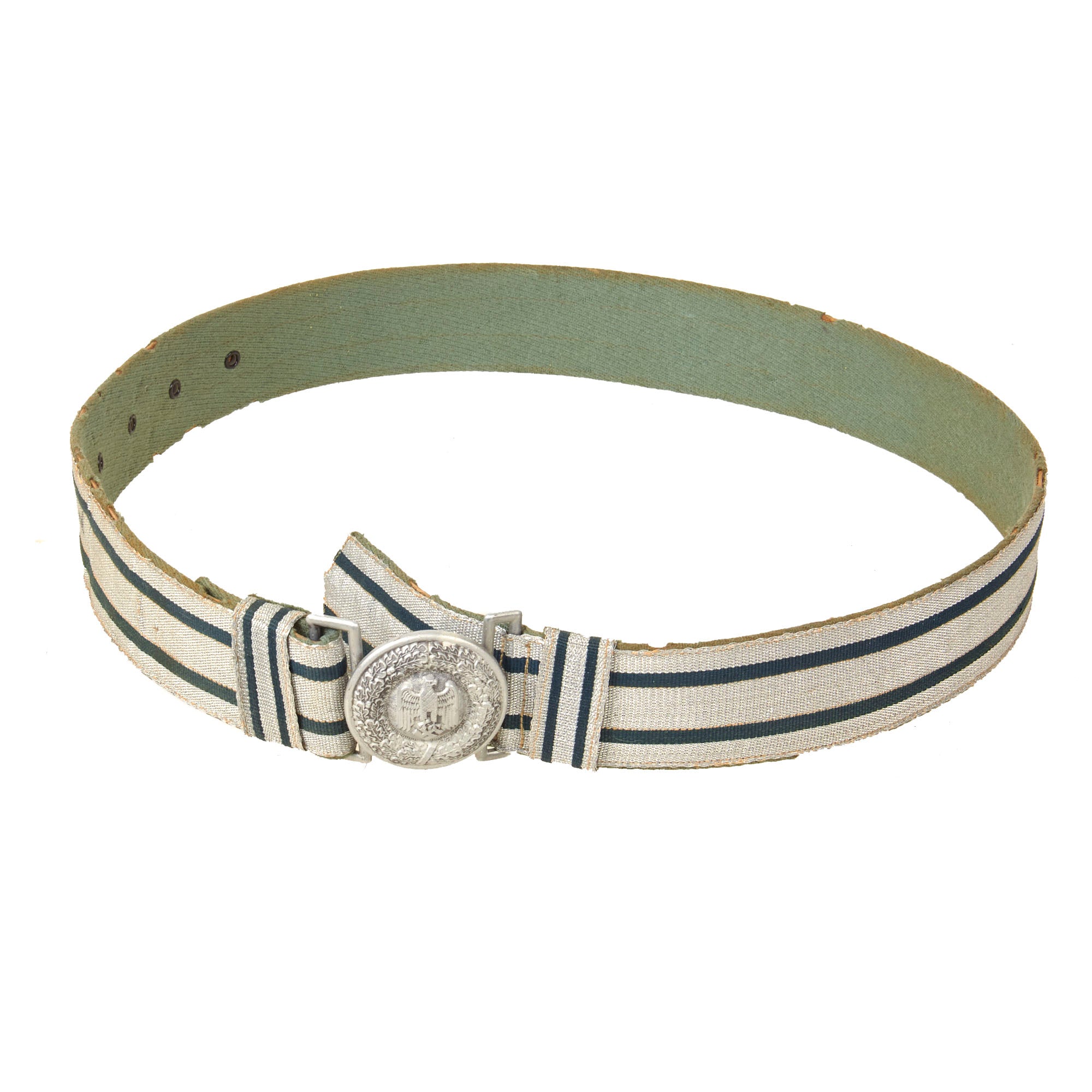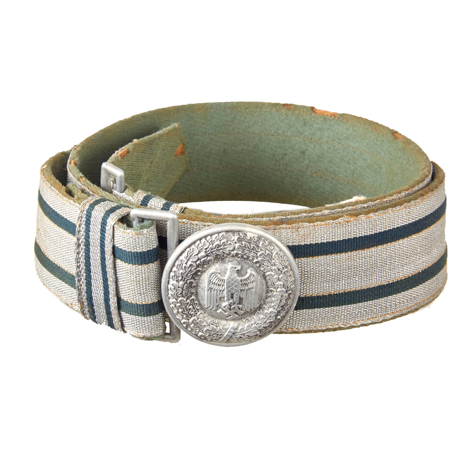The belt buckle is of die struck/stamped, aluminum alloy based construction that has been silver washed. It depicts the Wehrmacht Heer Eagle on a pebbled background that is surrounded by an oak leaf wreath that is tied together at the bottom. The buckle is attached by a double square ring to a long quality woven bright silver/aluminum construction brocade belt. The belt pattern has two horizontal green lines, and the two sliding vertical loops have the same pattern.