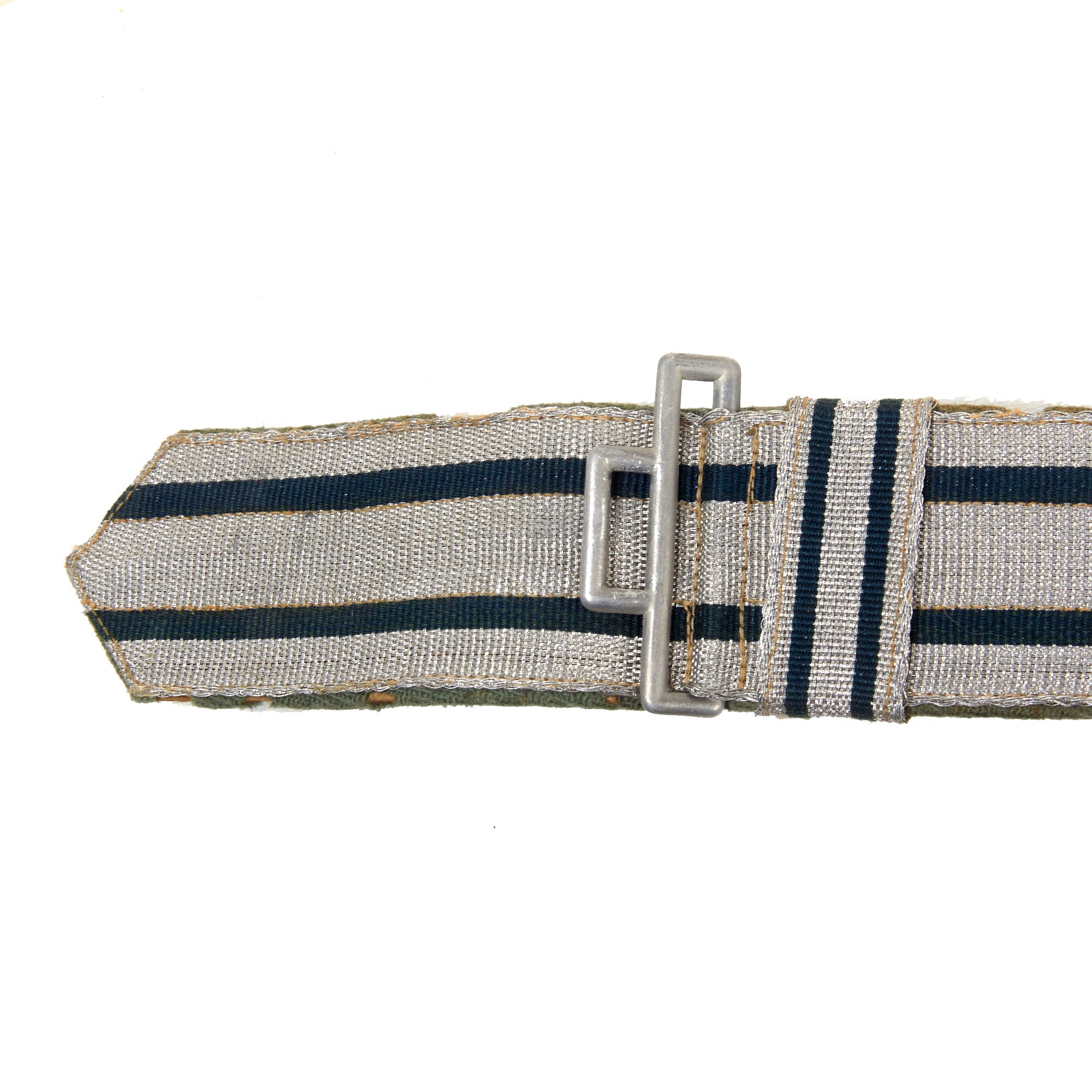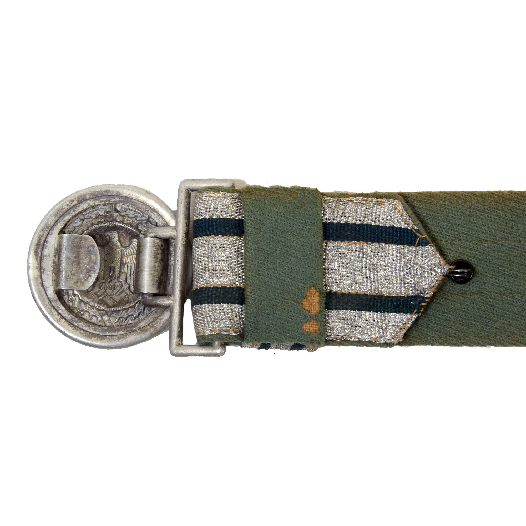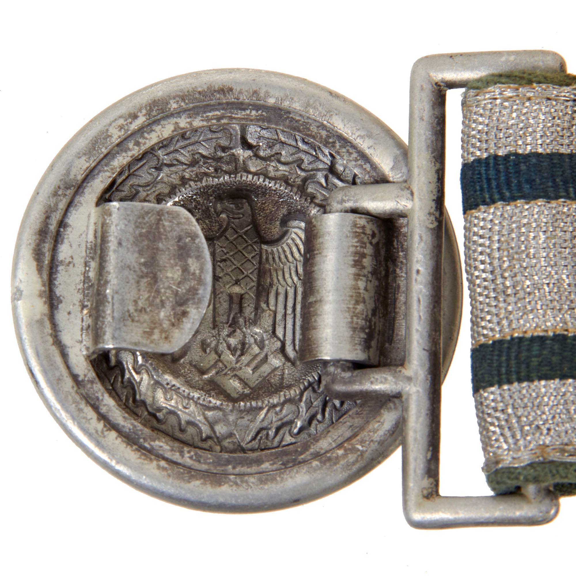 The belt buckle is of die struck/stamped, aluminum alloy based construction that has been silver washed. It depicts the Wehrmacht Heer Eagle on a pebbled background that is surrounded by an oak leaf wreath that is tied together at the bottom. The buckle is attached by a double square ring to a long quality woven bright silver/aluminum construction brocade belt. The belt pattern has two horizontal green lines, and the two sliding vertical loops have the same pattern.