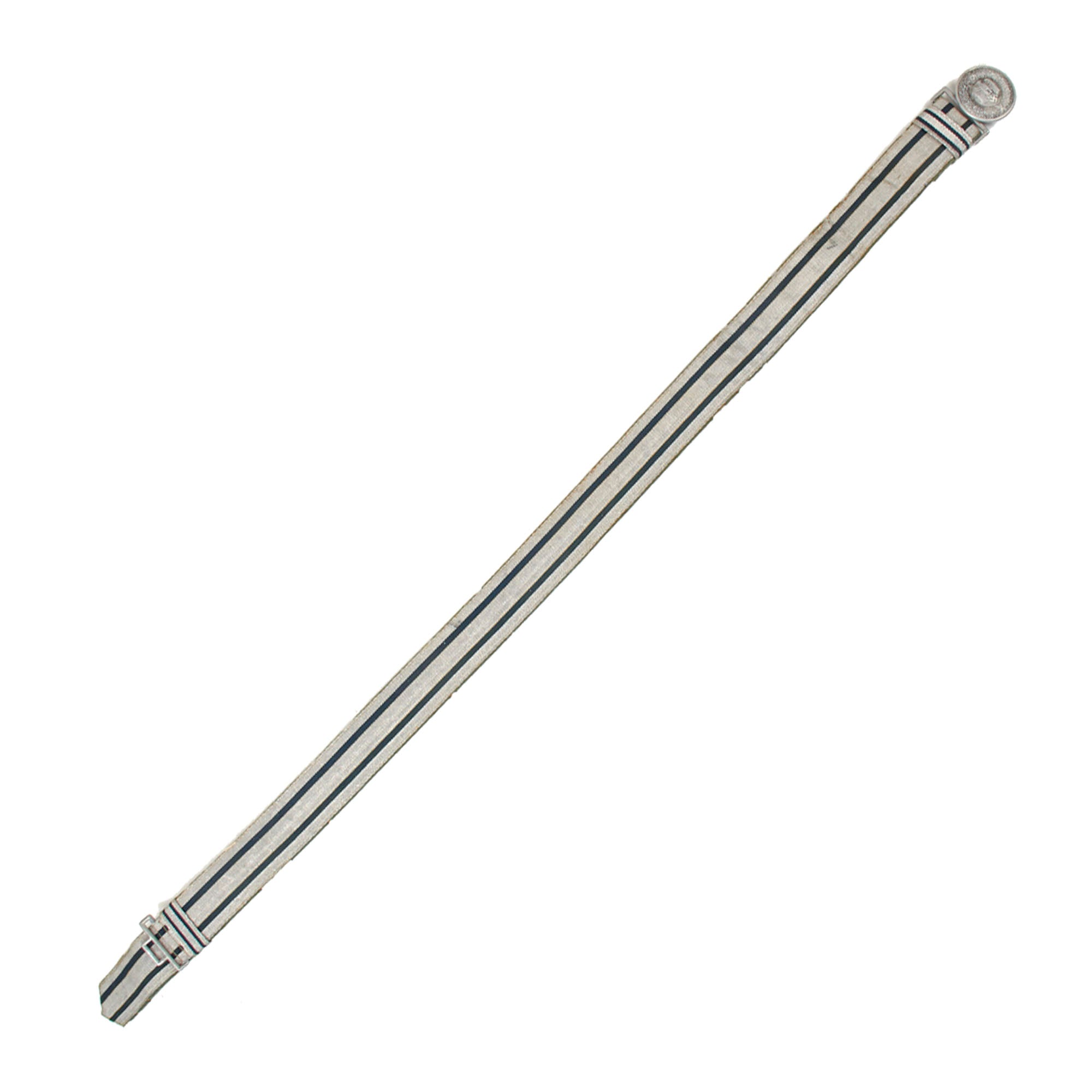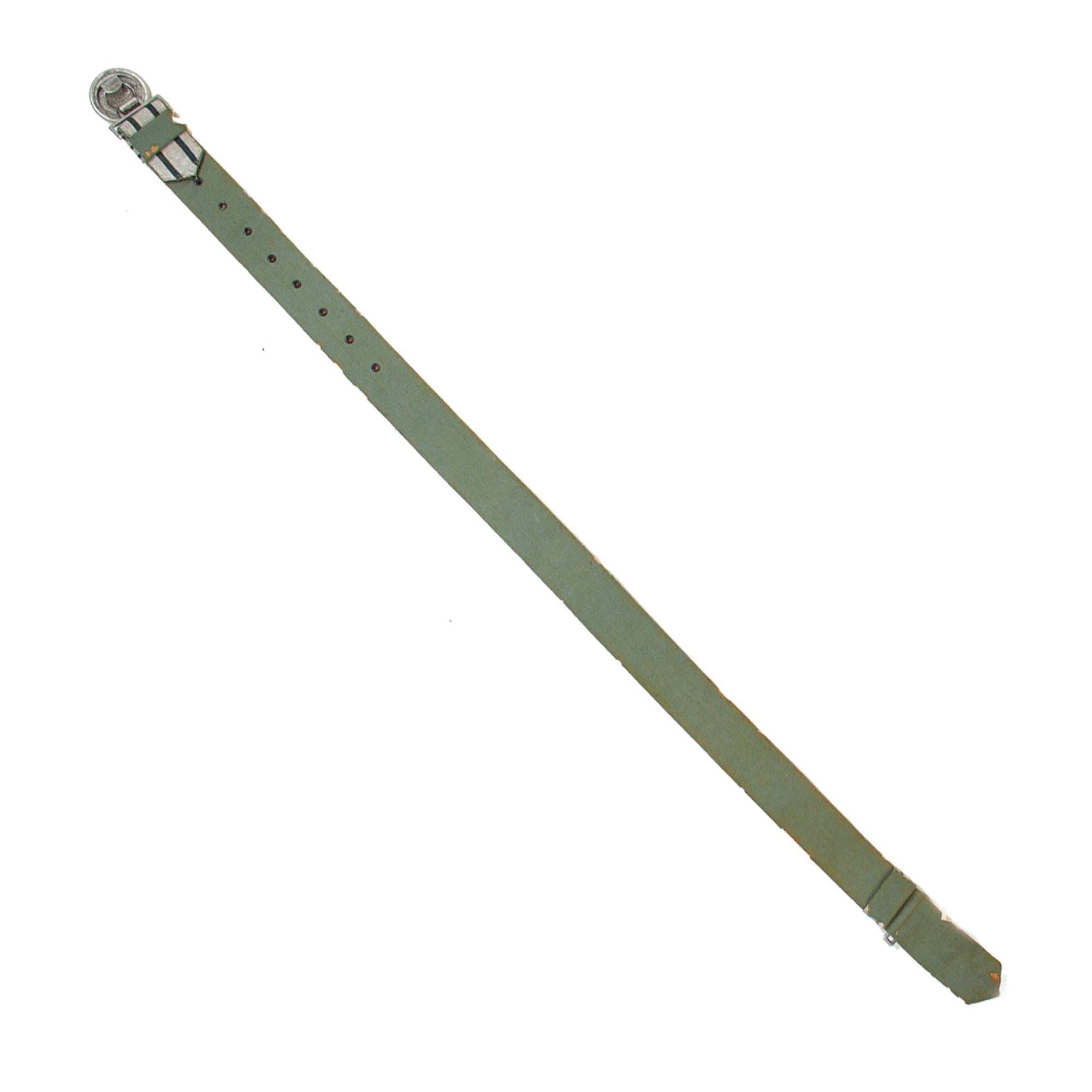 The reverse is lined in a Heer Field Gray wool fabric continuous with the front, and it feels like the belt has an internal leather or pressed paper body, which has become quite stiff over the years. There is a long extension past the square loop on the end that goes behind the buckle when fastened, and the length is adjusted using eyelets on the belt body and a hook on the end of the belt on the buckle end. The belt itself measures about 39 1/2” from the buckle clip to the loop on the other end when fully extended, and does not have any maker markings on the buckle or belt that we can see.