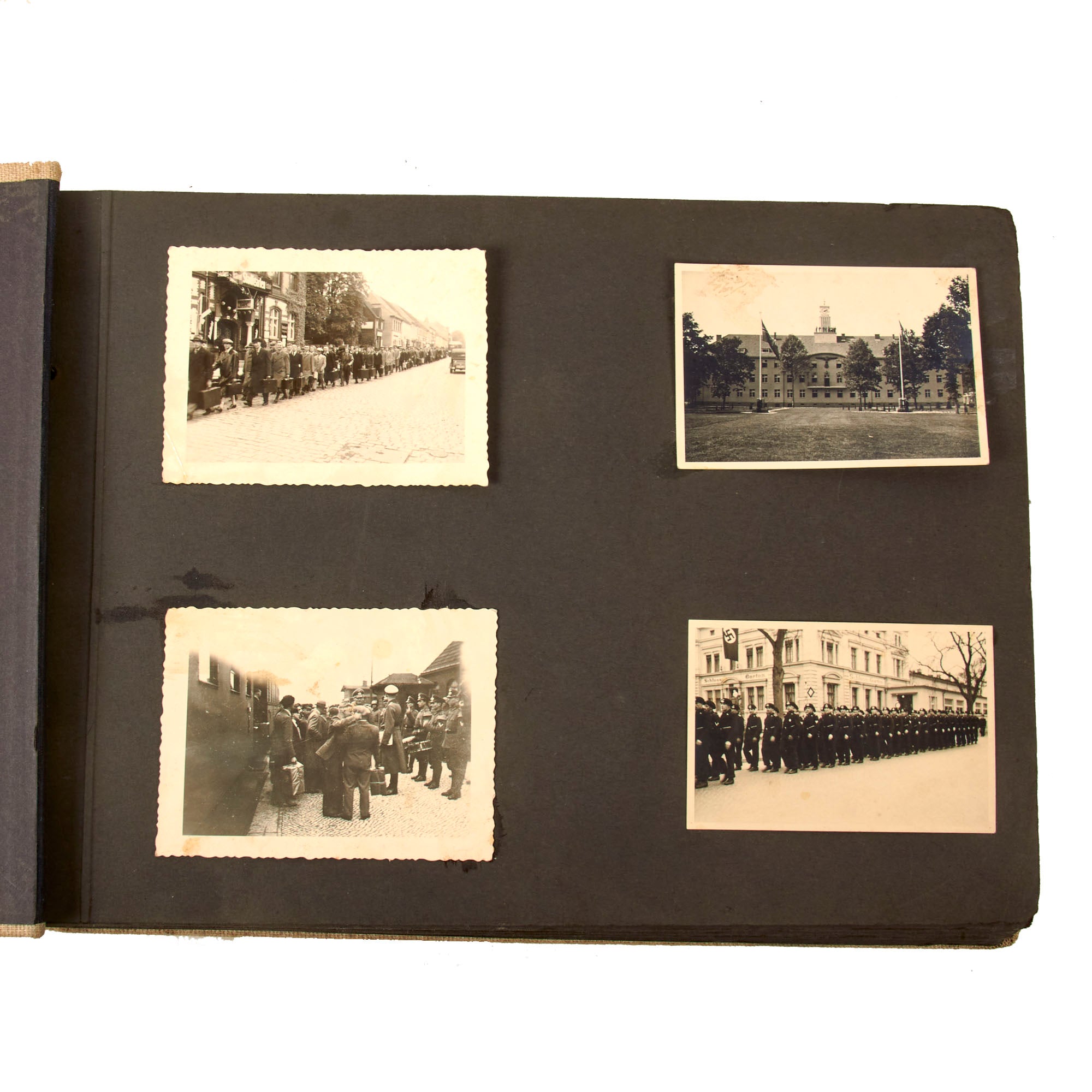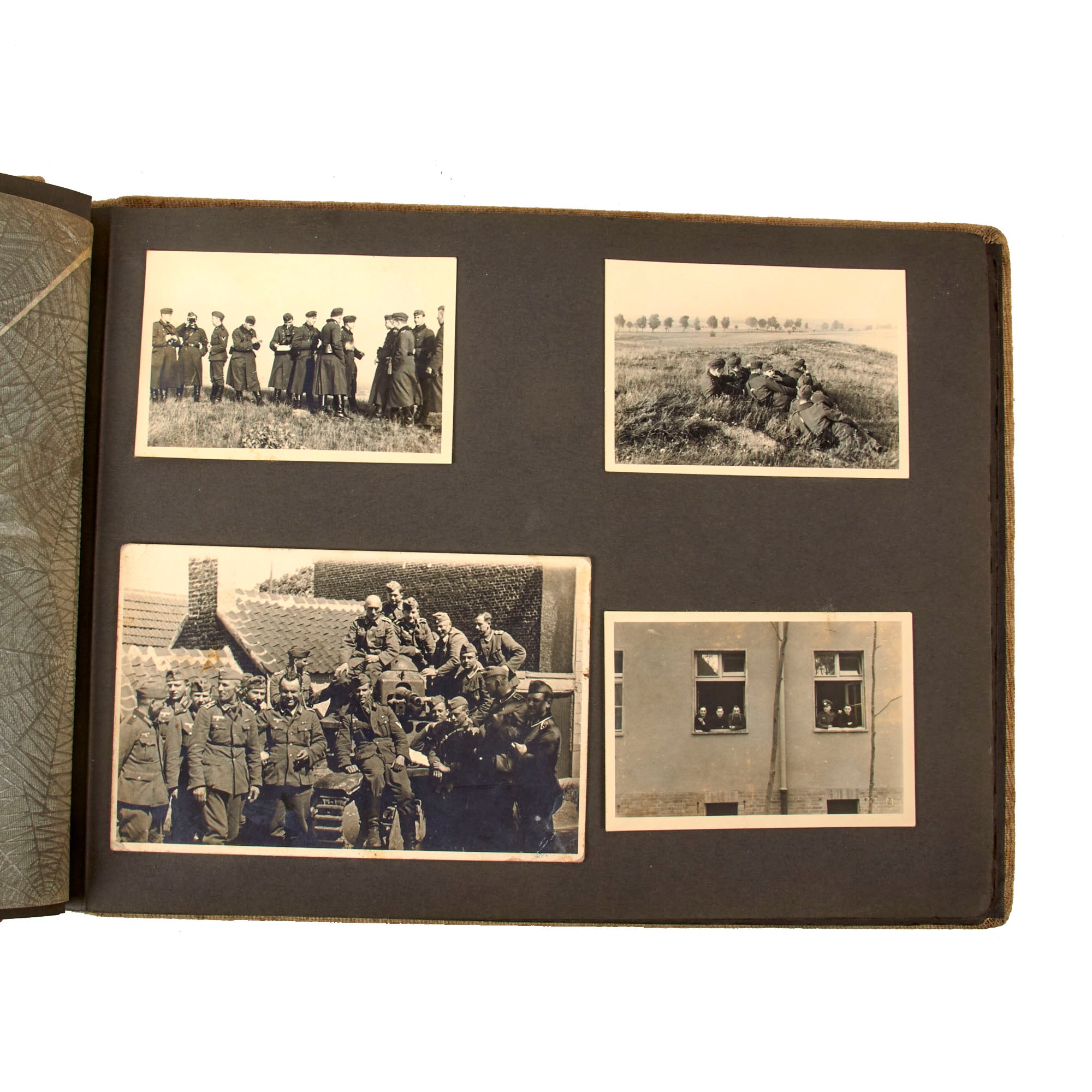 Original Item: One-of-a-kind. A wonderful personal photo album, marked on the front with the standard Erinnerungen an meine Wehrdienſtzeit (Memories of my Military Service) in gold letters, with a Heer Army stahlhelm helmet in the lower left. The inner rear cover still has a maker label from Berlin, and the album overall measures approximately 112 1/4" x 8 5/8". The album cover is fabric covered, with a tri-color cord binding it together.