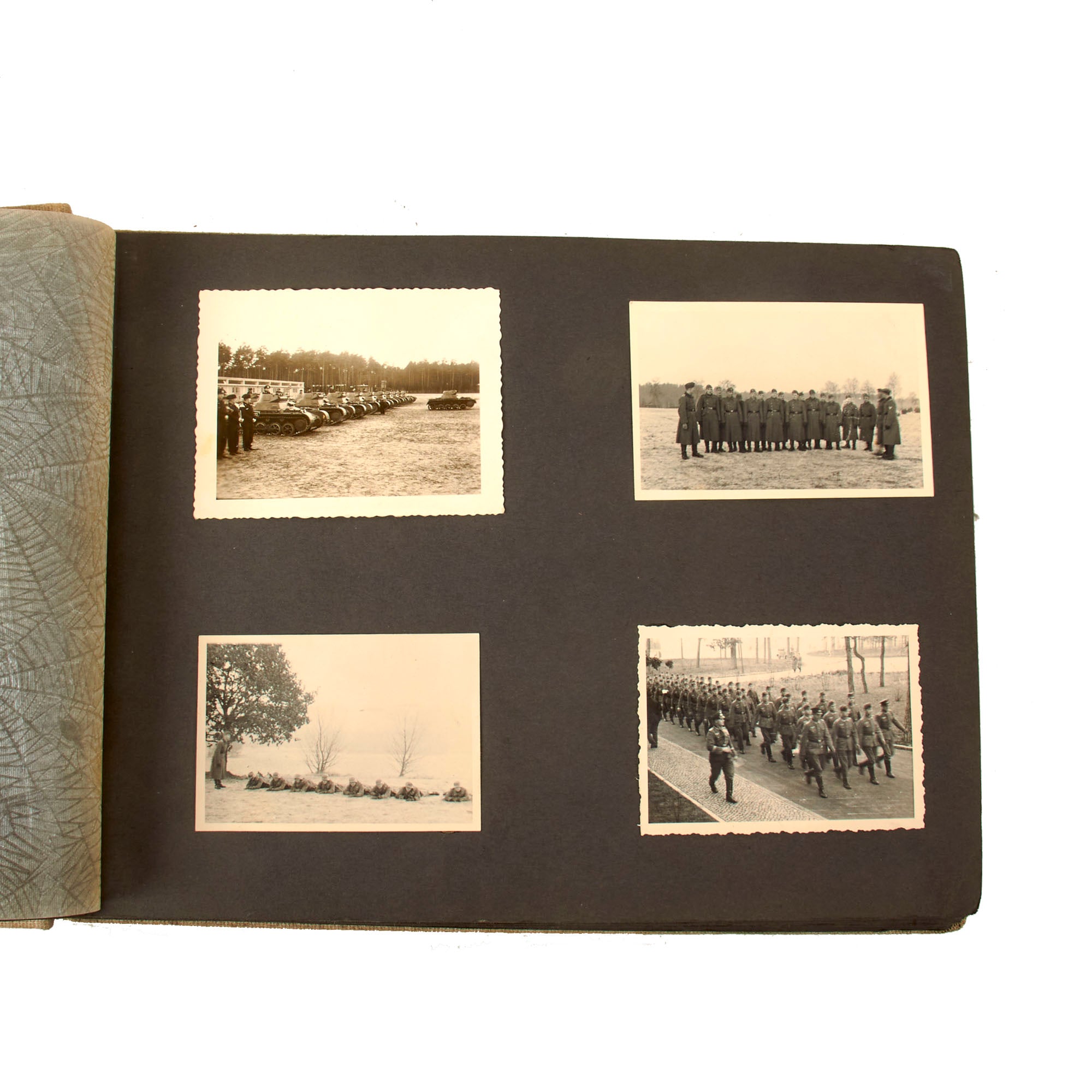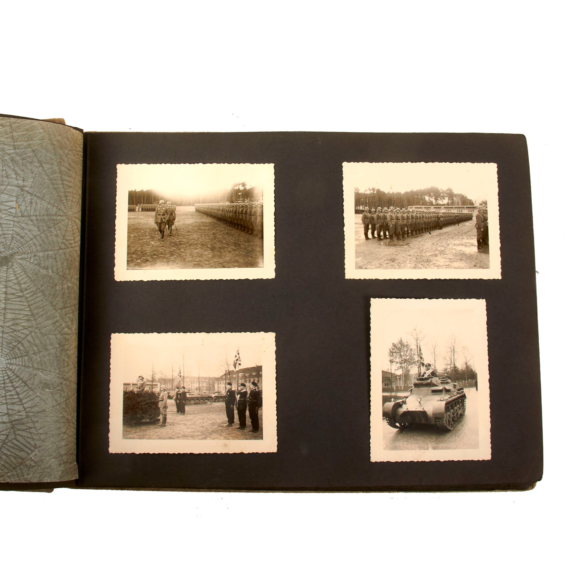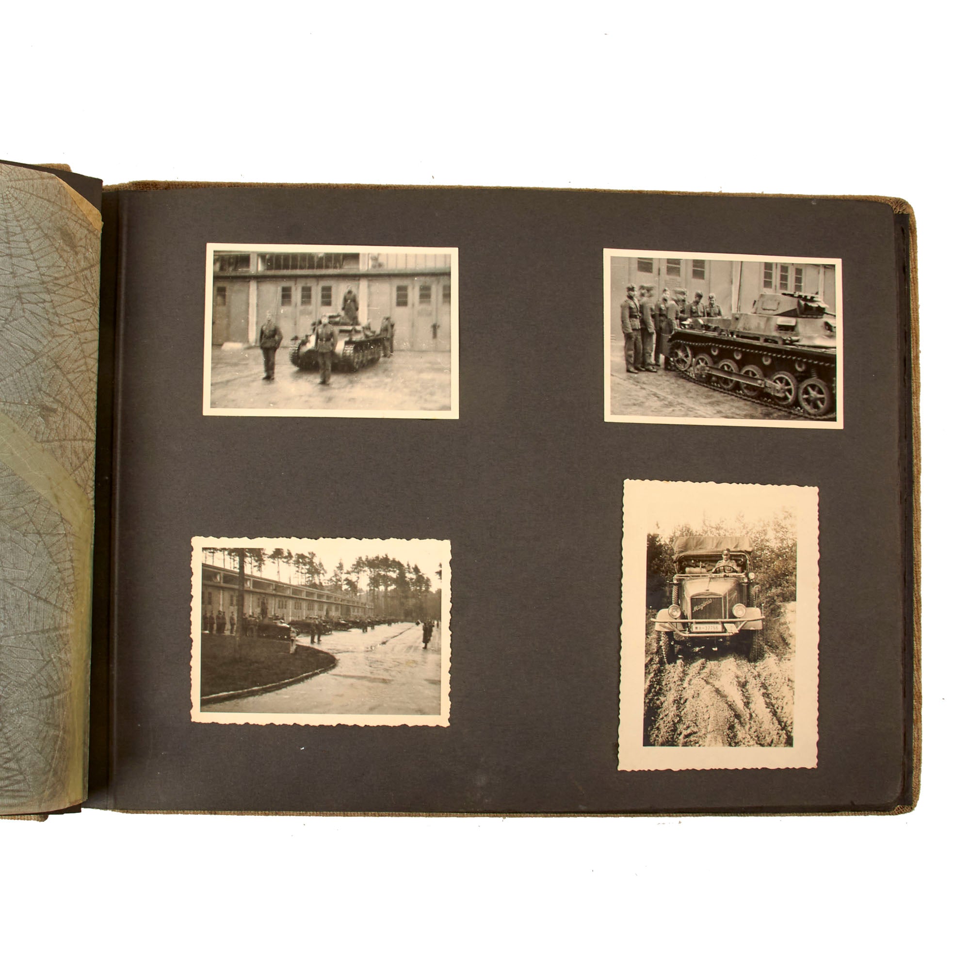 A total of 72 photographs fill the pages of this album, making it a treasure-trove of images taken from the viewpoint of a young, patriotic German soldier. These are contained on 22 pages, which are not captioned, and most are separated by "spiderweb" pattern "onion skin" separators. All of the photos appear to be attached by adhesive on the reverse. The pictures show a Panzer Armored unit in training and also at ease, and there are numerous pictures of German Panzer I (Panzerkampfwagen I or Pz.Kpfw. I) tanks, both parked, and in the field. There are also pictures of panzer soldiers in their distinctive black "Panzer Wrap" tunics, wearing rare M1934 Schutzmütze Panzer "Beret" Protective Hats. There is even a picture later of a ship, as well as the Laboe Naval Memorial in Laboe, near Kiel, Germany. The inside of the front page has a handwritten note about the Panzer Regiment 6, part of Panzer Division 3, but we can find nothing in the album that actually connects it to this unit.