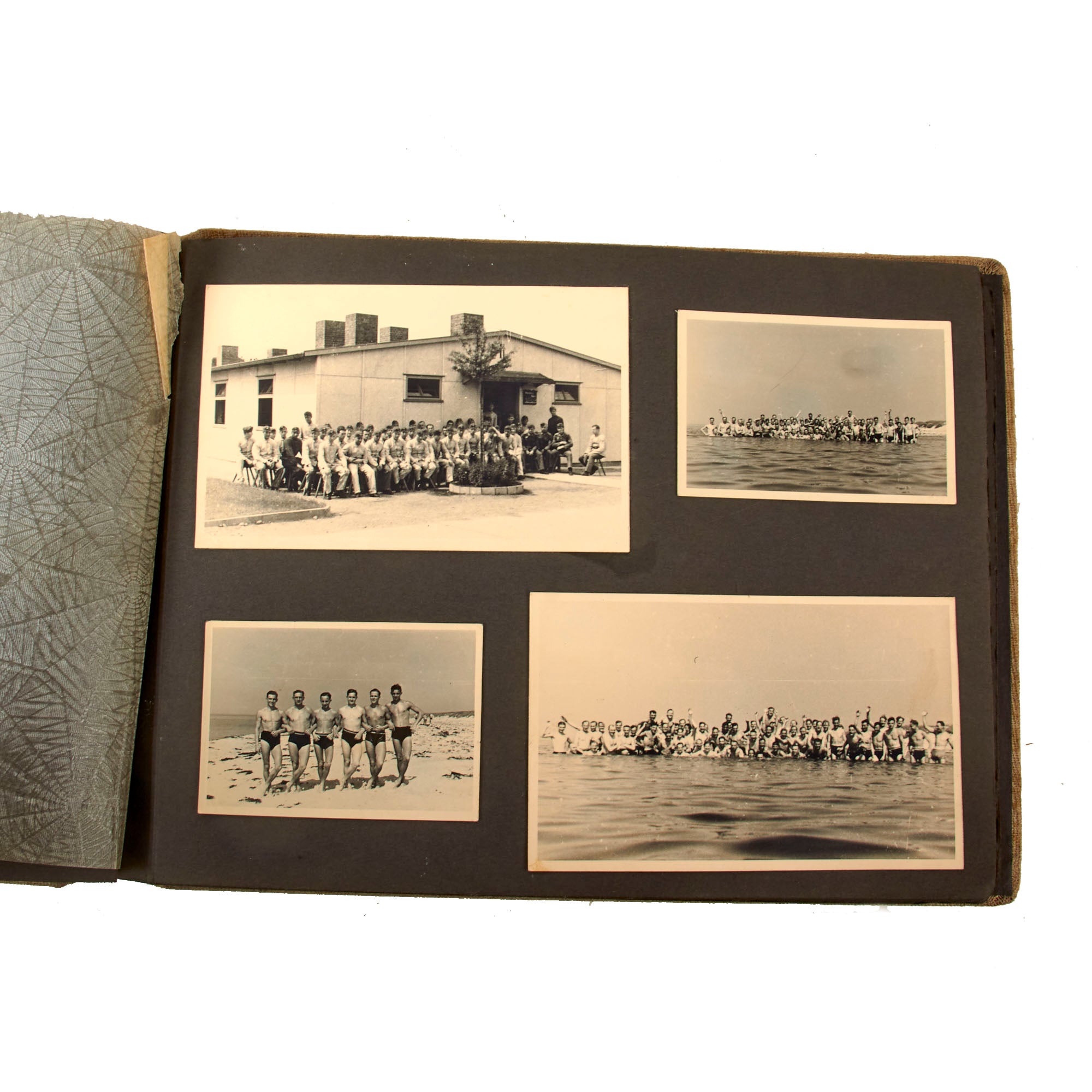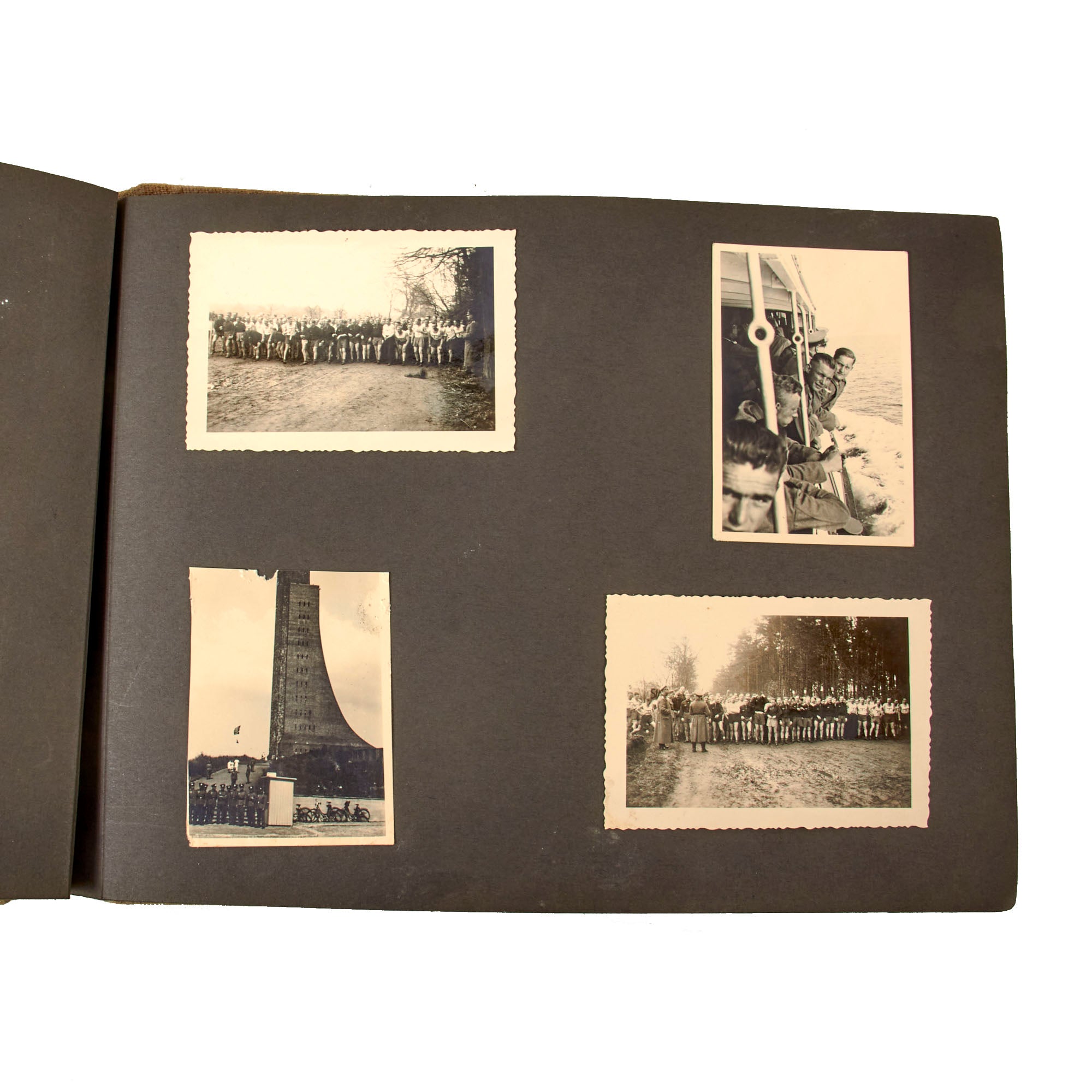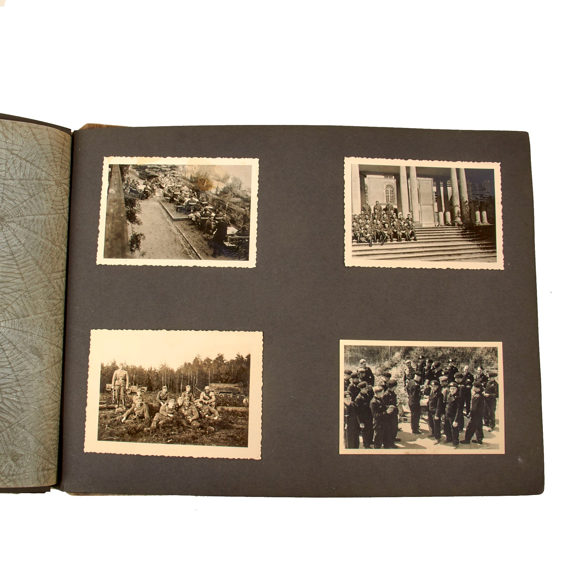 A total of 72 photographs fill the pages of this album, making it a treasure-trove of images taken from the viewpoint of a young, patriotic German soldier. These are contained on 22 pages, which are not captioned, and most are separated by "spiderweb" pattern "onion skin" separators. All of the photos appear to be attached by adhesive on the reverse. The pictures show a Panzer Armored unit in training and also at ease, and there are numerous pictures of German Panzer I (Panzerkampfwagen I or Pz.Kpfw. I) tanks, both parked, and in the field. There are also pictures of panzer soldiers in their distinctive black "Panzer Wrap" tunics, wearing rare M1934 Schutzmütze Panzer "Beret" Protective Hats. There is even a picture later of a ship, as well as the Laboe Naval Memorial in Laboe, near Kiel, Germany. The inside of the front page has a handwritten note about the Panzer Regiment 6, part of Panzer Division 3, but we can find nothing in the album that actually connects it to this unit.
