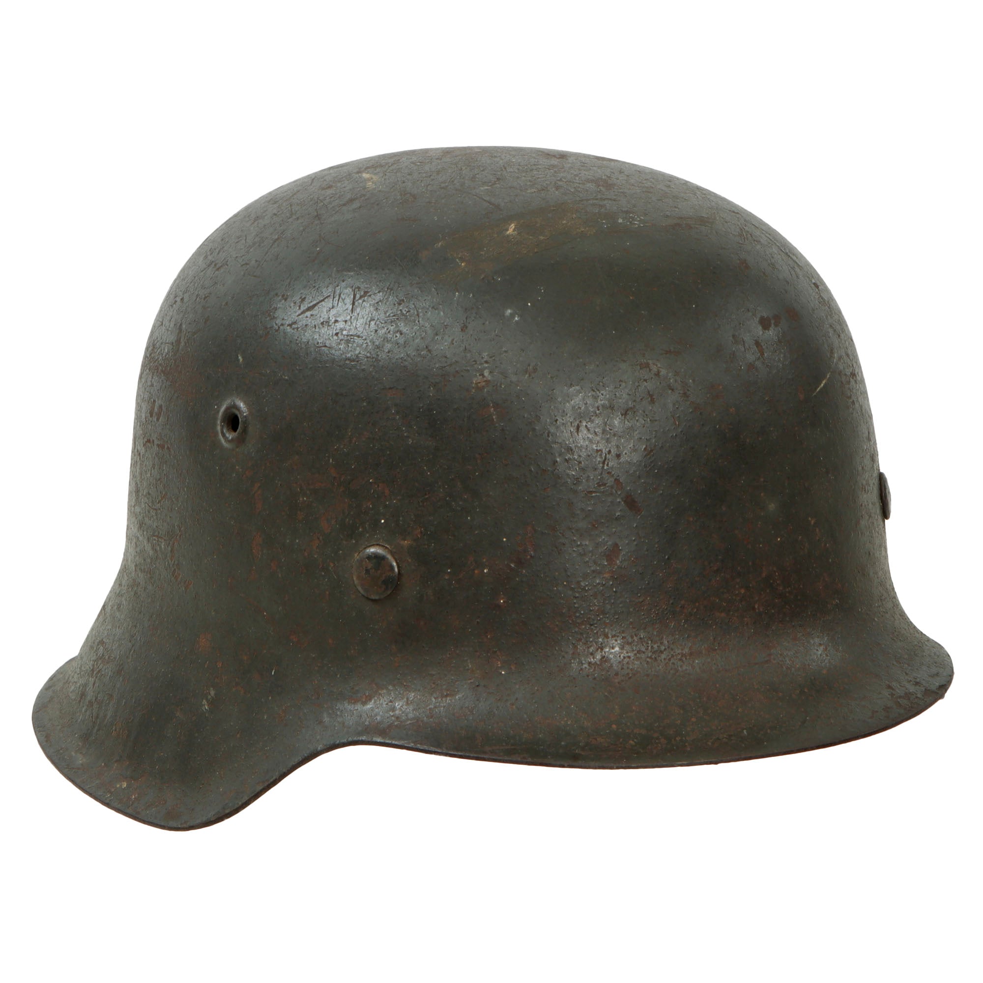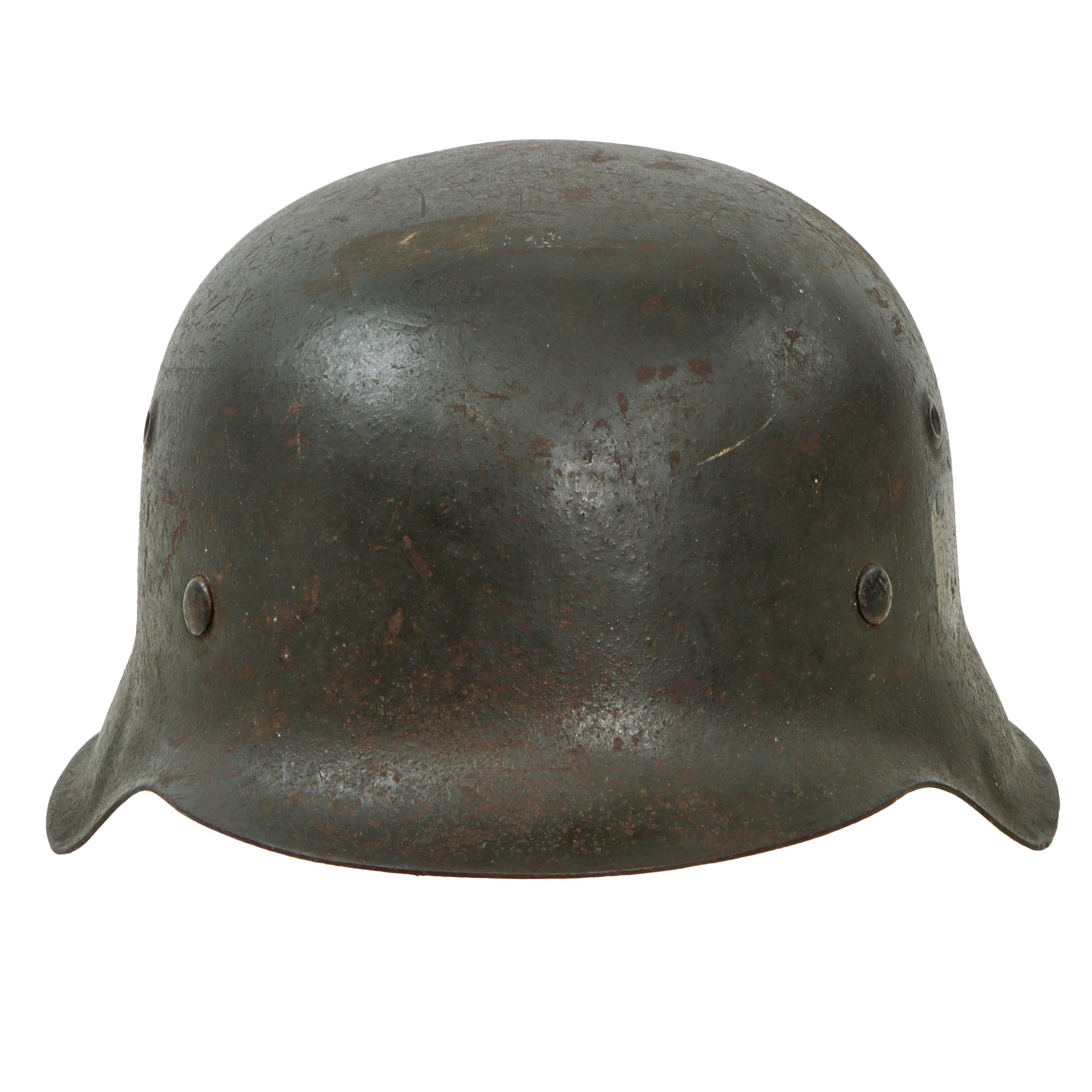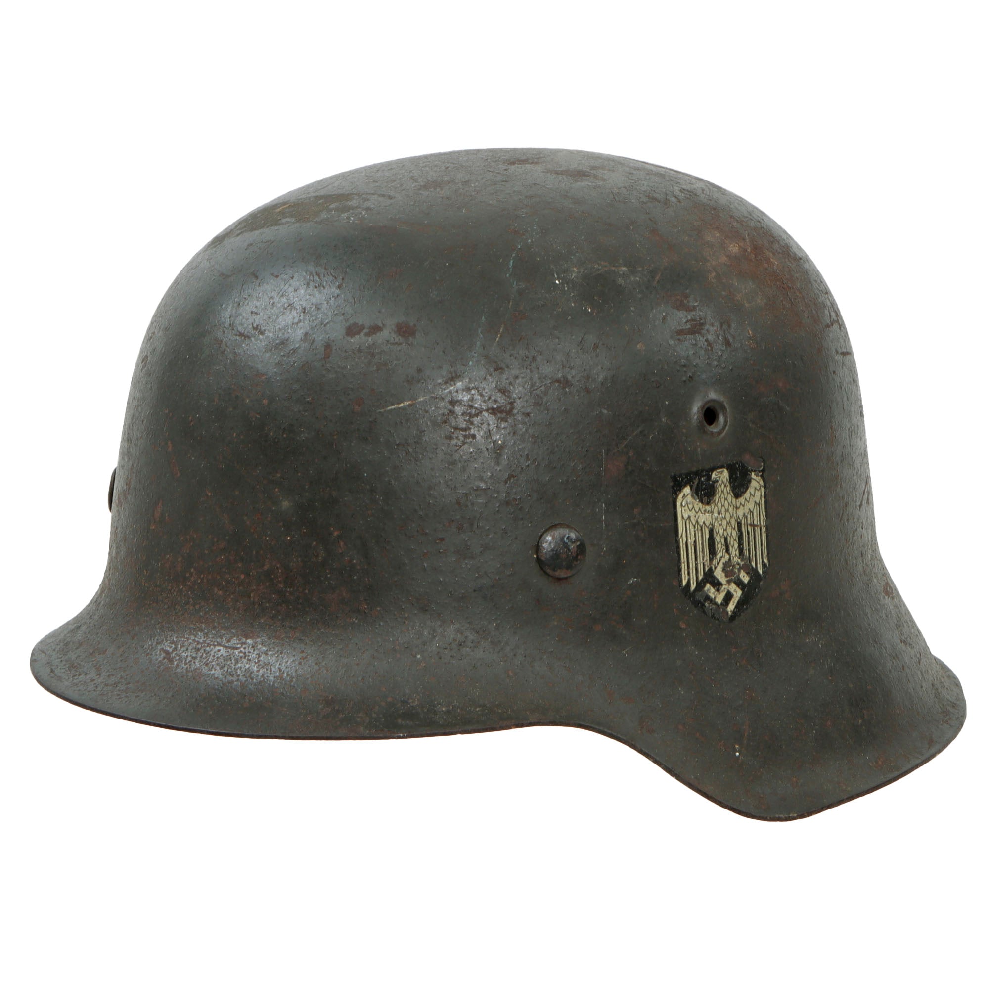 • Original Item: Only One Available. This is a very nice all original service used example of a German Model 42 Steel helmet, as issued to the Wehrmacht Heer (army). This stamped sheet steel construction helmet retains about 80% of its original paint, with flaking paint and oxidation consistent with use in service, particularly on the top of the crown, which shows scuffing and other marks. The left side of the helmet features a very nice Heer Silver Eagle decal, which is retained at about 85%, showing some chipping and wear. This is a very nice example of the M42 helmet, with a great service used look!