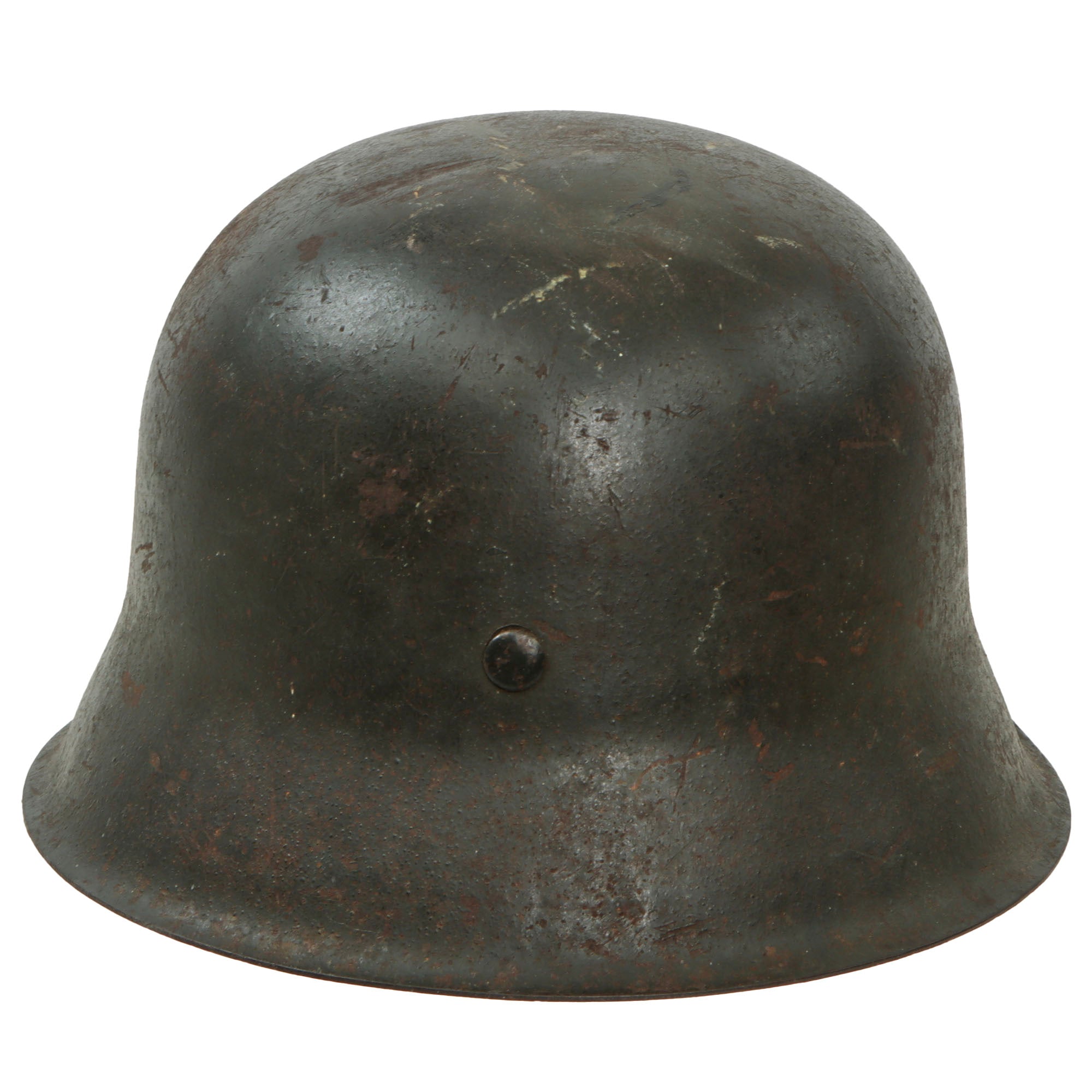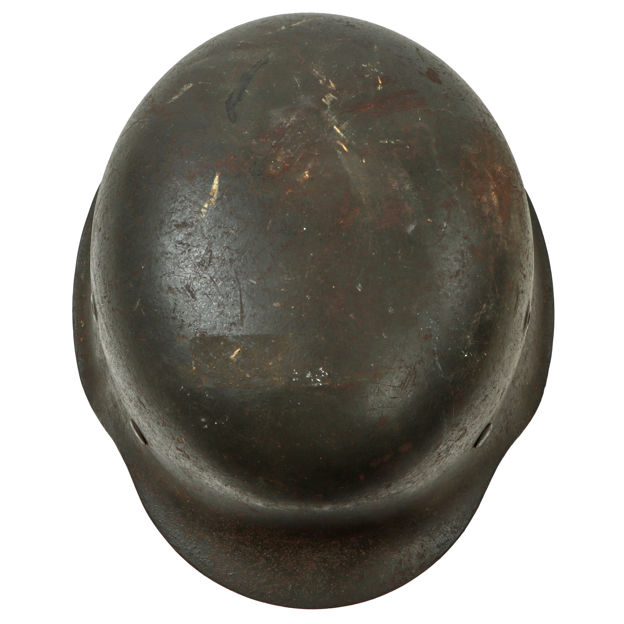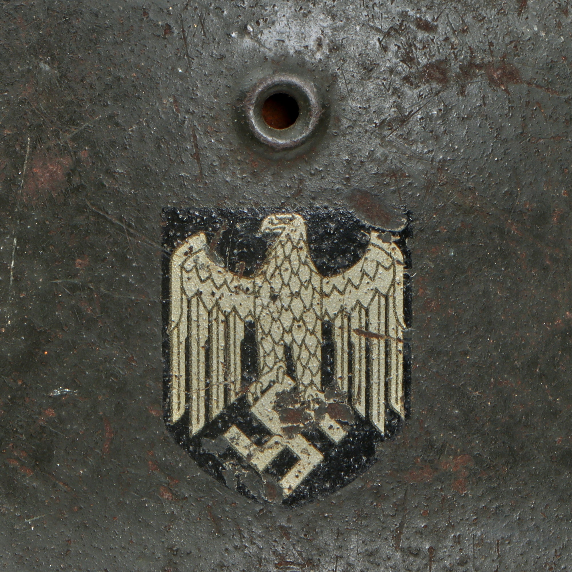 • Original Item: Only One Available. This is a very nice all original service used example of a German Model 42 Steel helmet, as issued to the Wehrmacht Heer (army). This stamped sheet steel construction helmet retains about 80% of its original paint, with flaking paint and oxidation consistent with use in service, particularly on the top of the crown, which shows scuffing and other marks. The left side of the helmet features a very nice Heer Silver Eagle decal, which is retained at about 85%, showing some chipping and wear. This is a very nice example of the M42 helmet, with a great service used look!