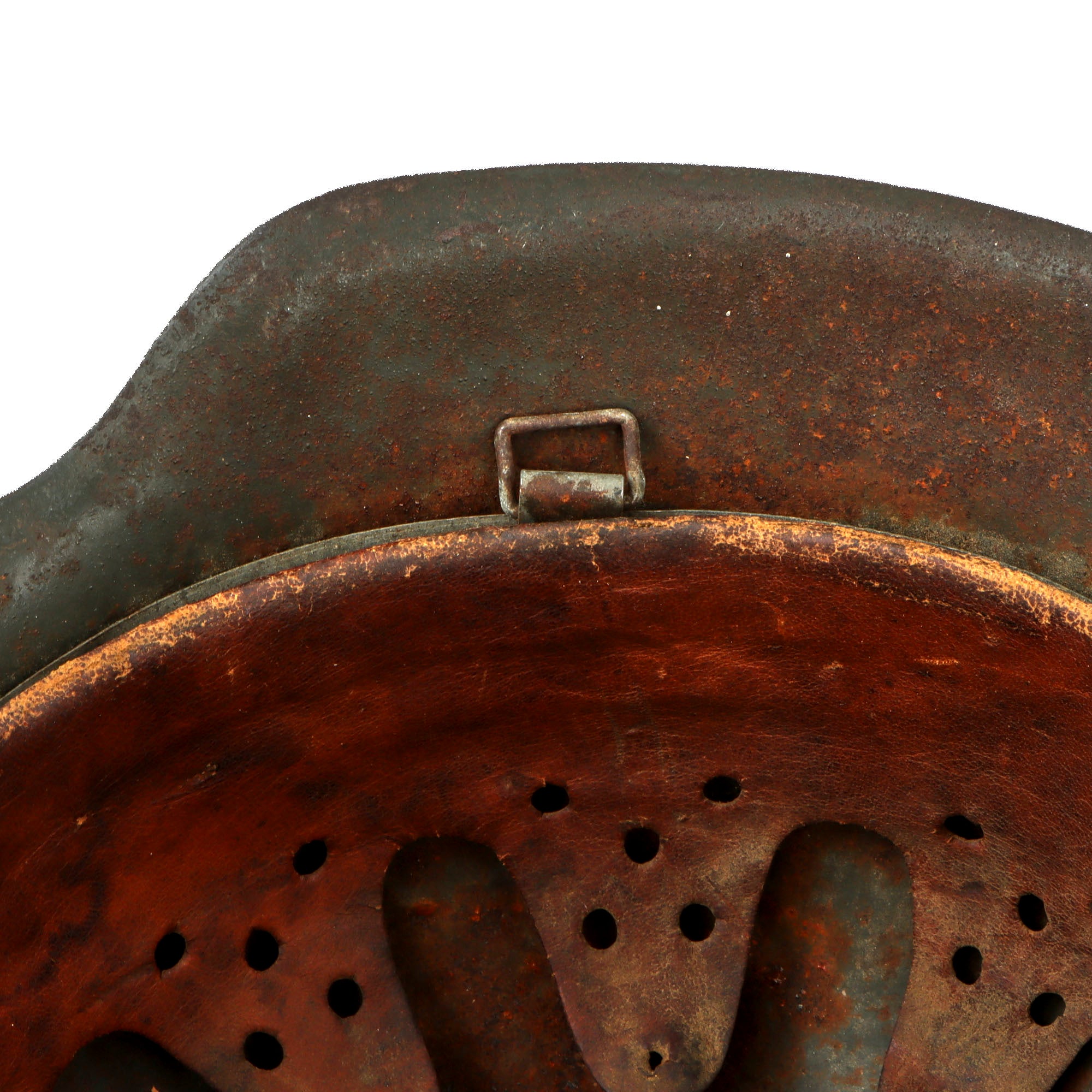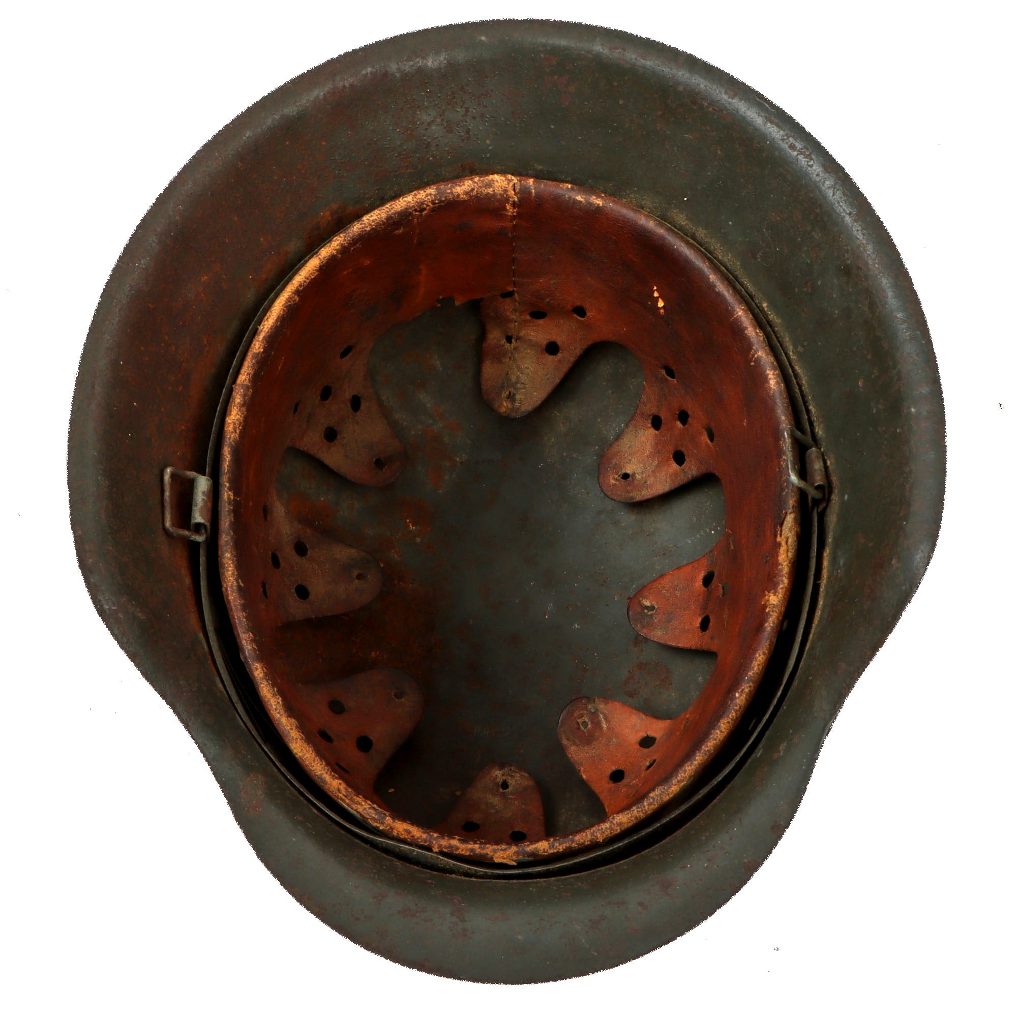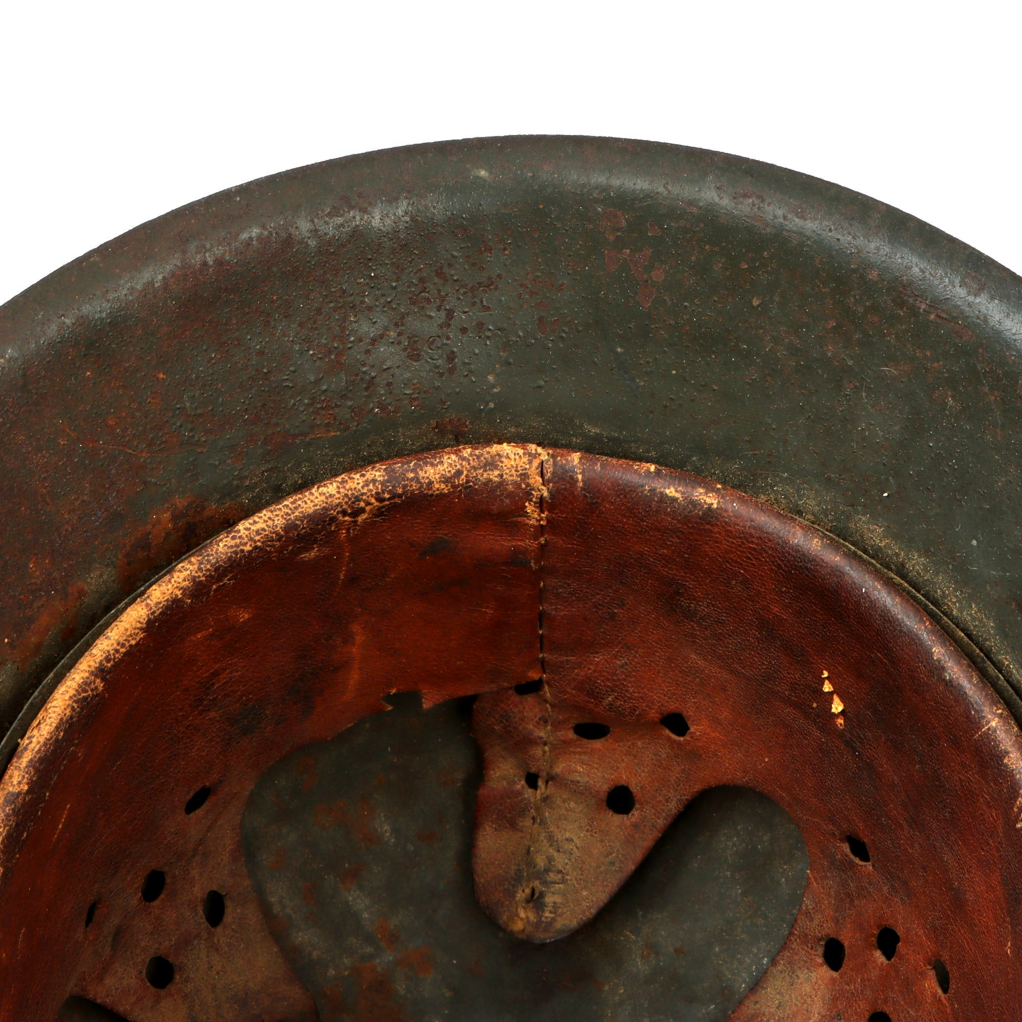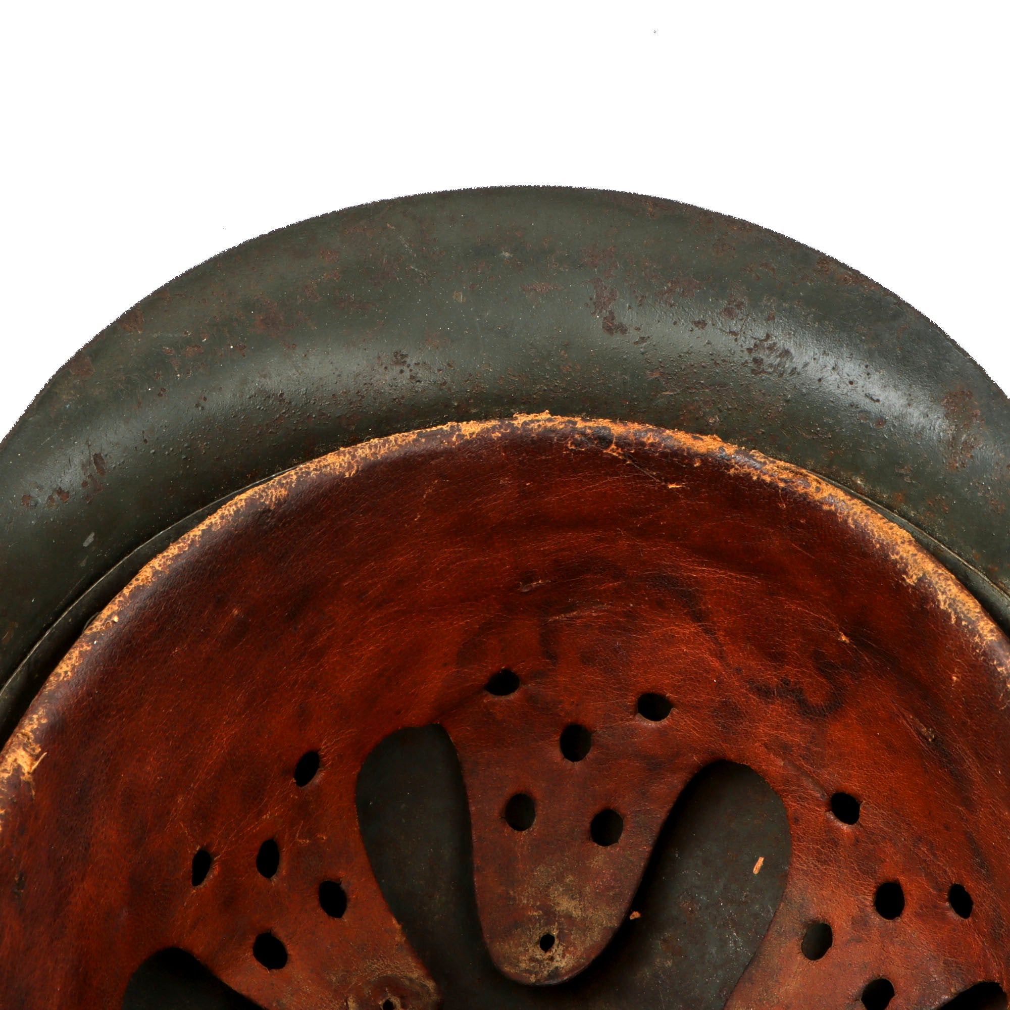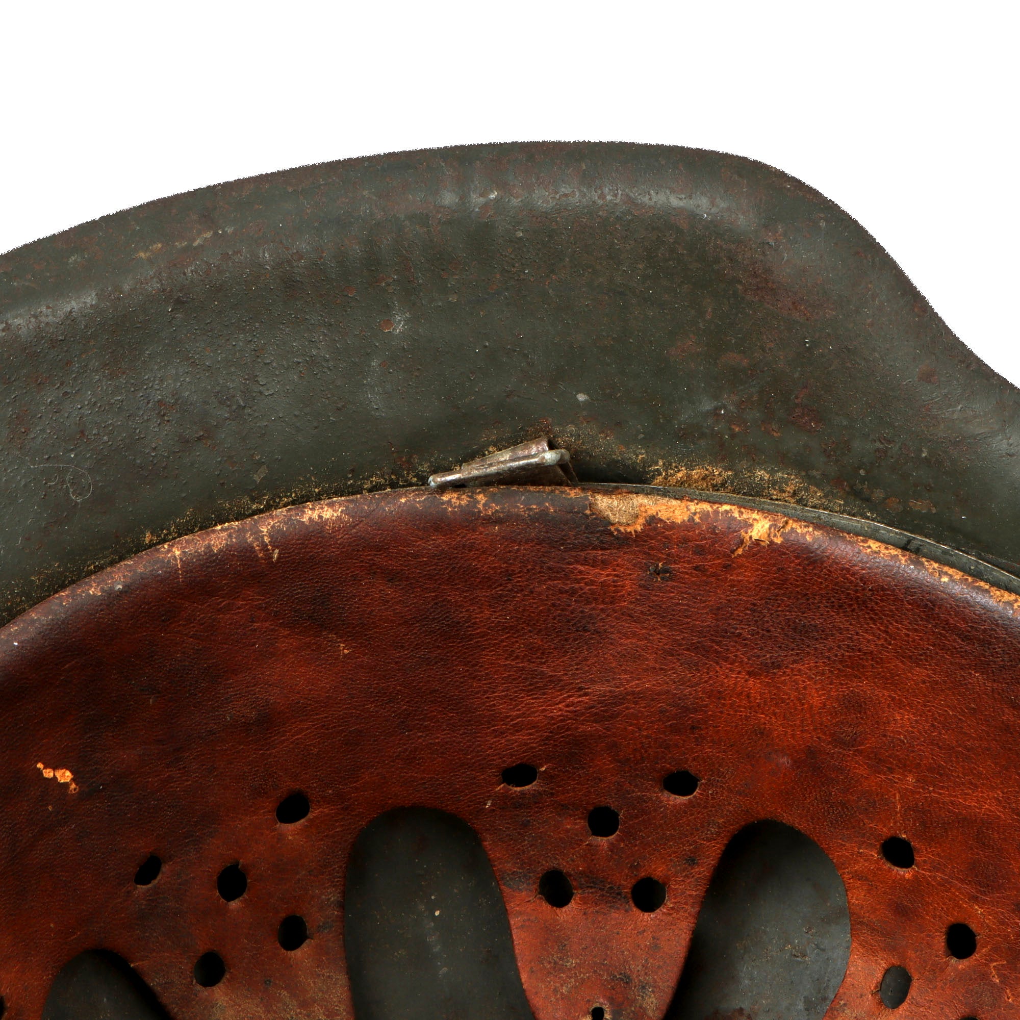 All three liner retaining pins are intact, with the exterior paint retained to a varying degree. The interior of the helmet still has an original M31 leather liner, which is in very good service used condition. The leather is a nice light brown color, and all fingers are present, though the top tie is missing. There is a bit of wear and splitting around the edge, but overall it is lovely, with a great chestnut brown color. The left exterior of the galvanized steel liner band is marked 66 n.A / 59, indicating that it is a size 59 liner for a size 66 shell, however the markings on the other side cannot be read due to dirt and oxidation.
