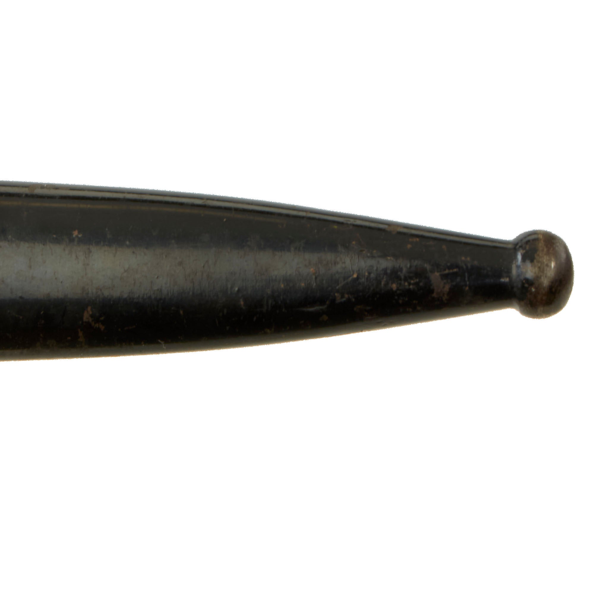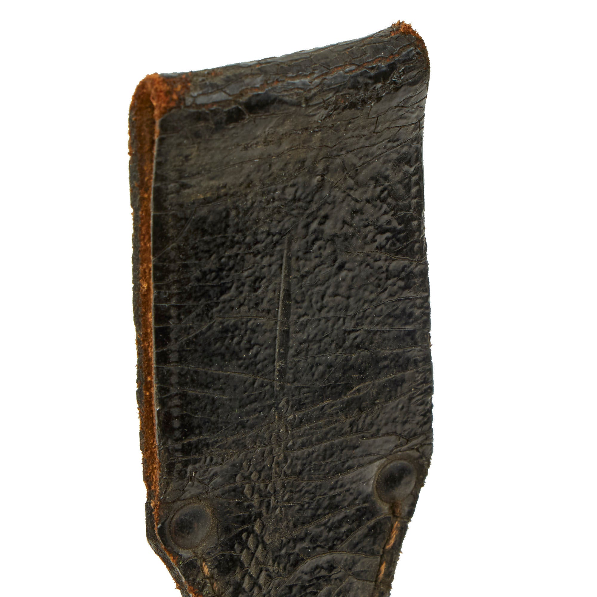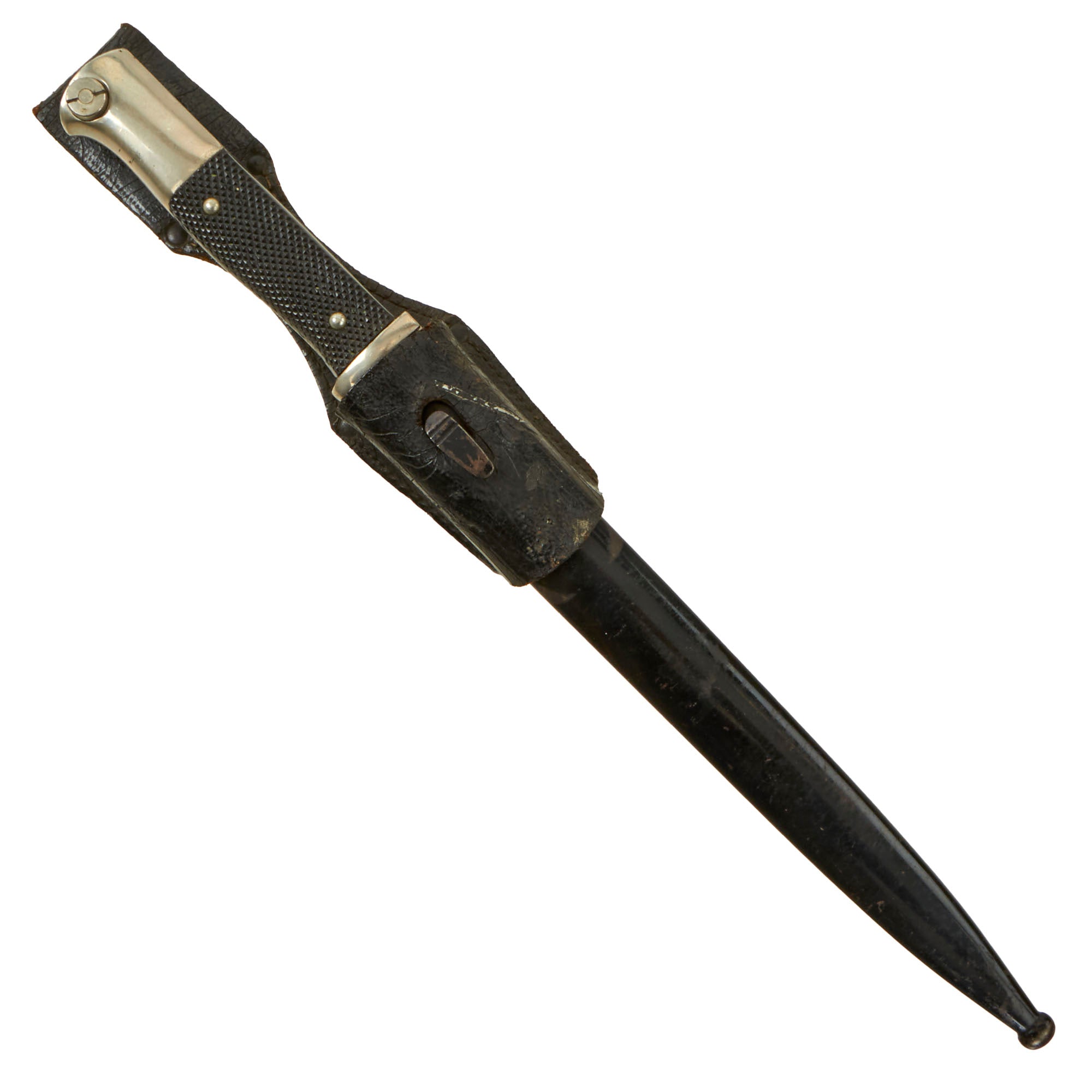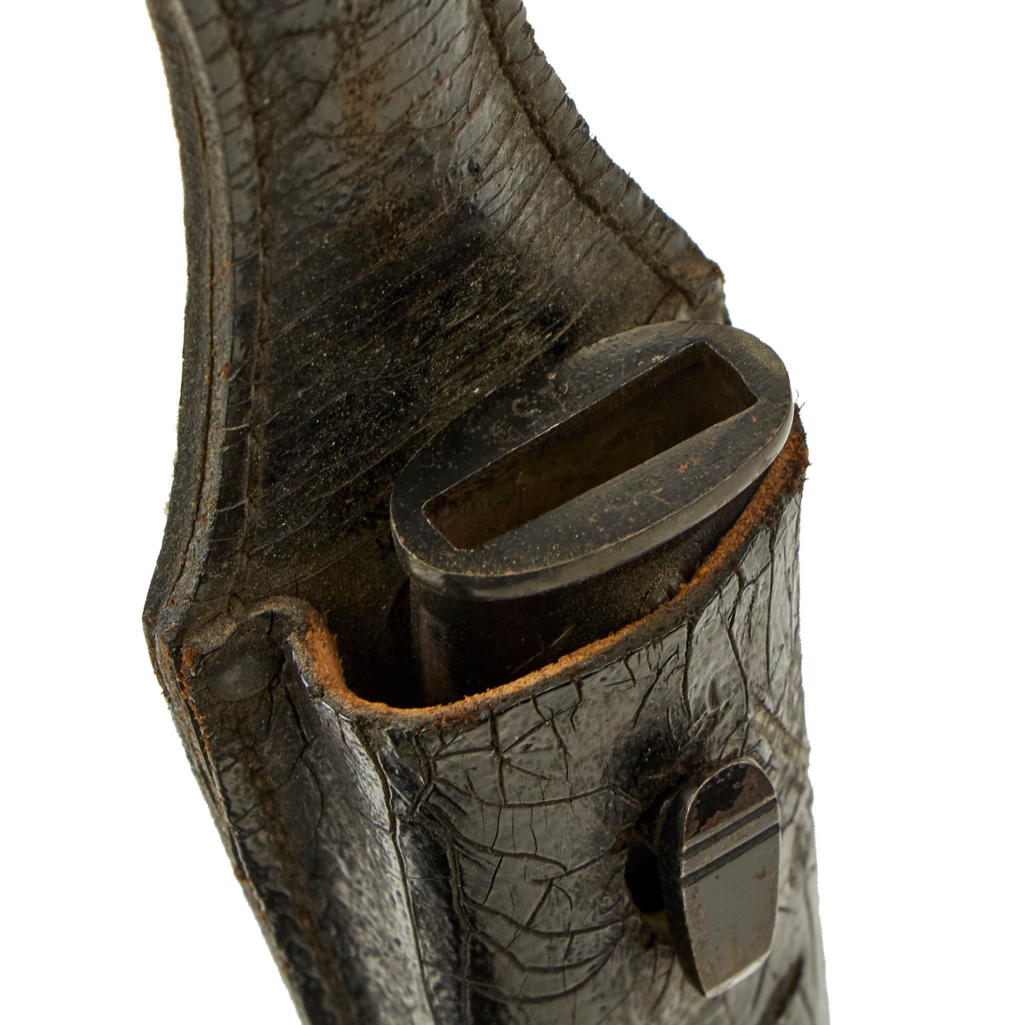 The steel scabbard is straight throughout, showing no dents or other damage, and the original black enamel lacquer finish is retained at about 90%. It has a lovely pattern of checking and crazing, showing that it has not been refinished, and there is just a bit of finish loss from contact with the leather frog. It fits the bayonet well, holding it securely. The scabbard is held in a black patent leather dress bayonet frog, which features steel rivets and a felt covered back. It is in good shape, though as we often see the patent leather finish has "melted" over time, and also shows cracking and other issues.