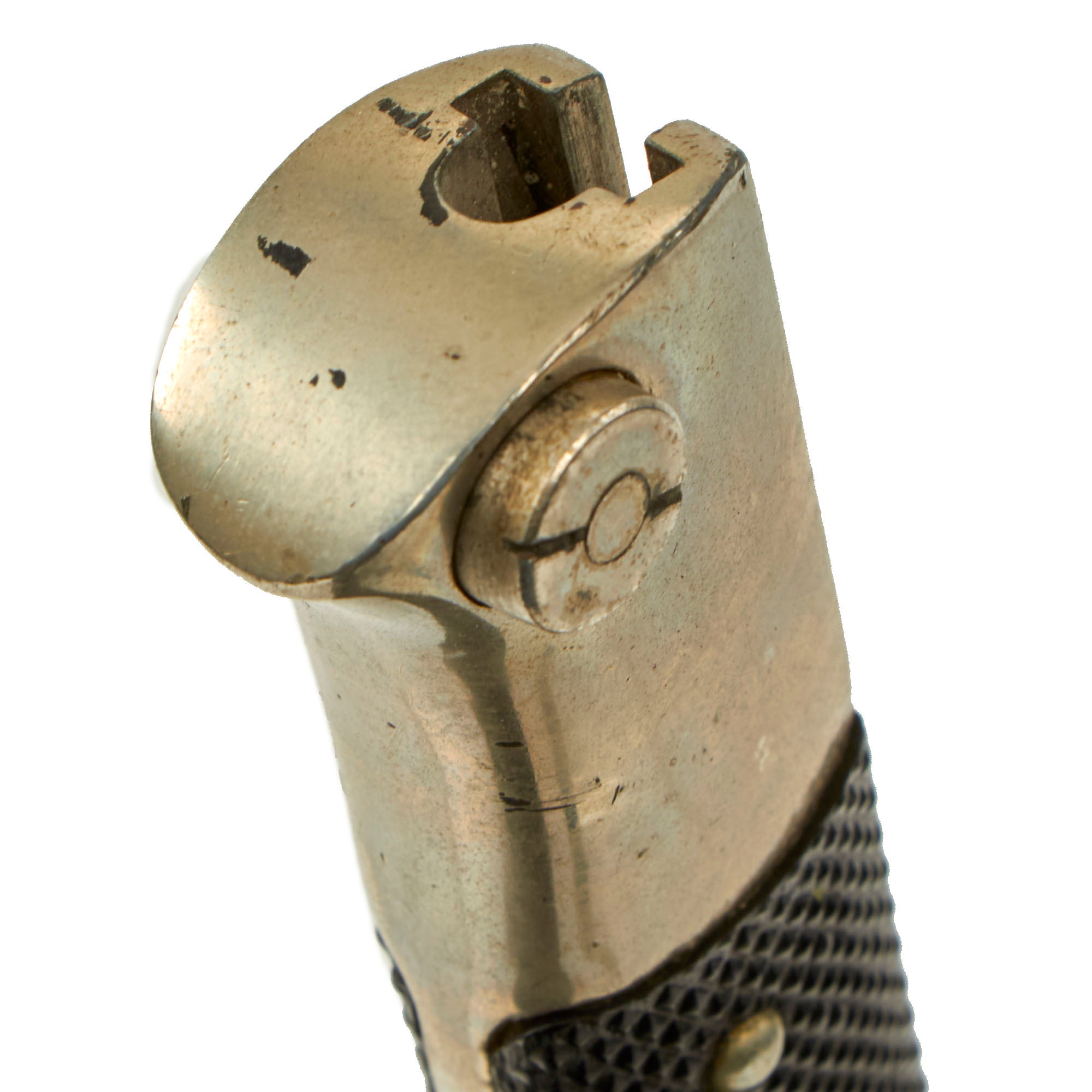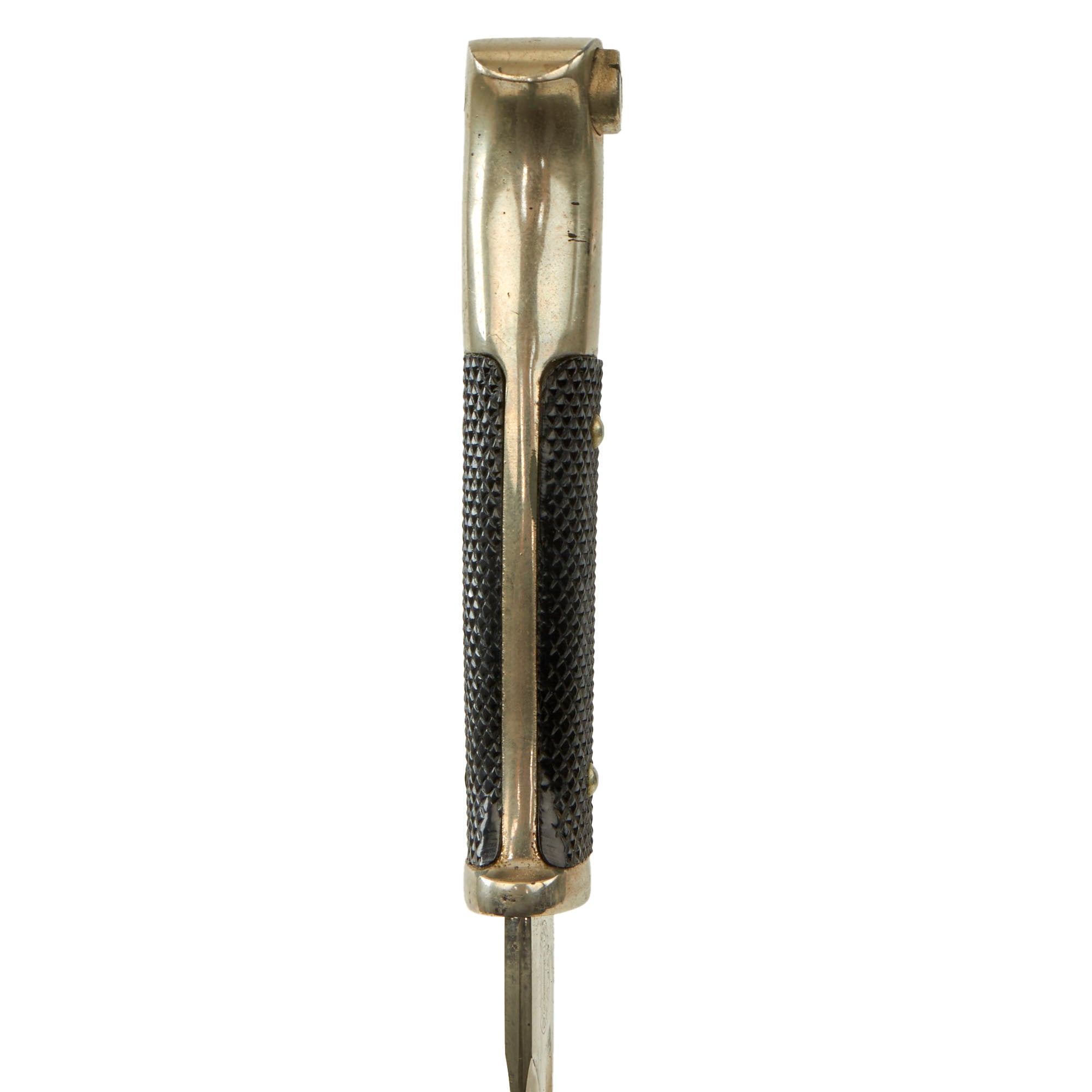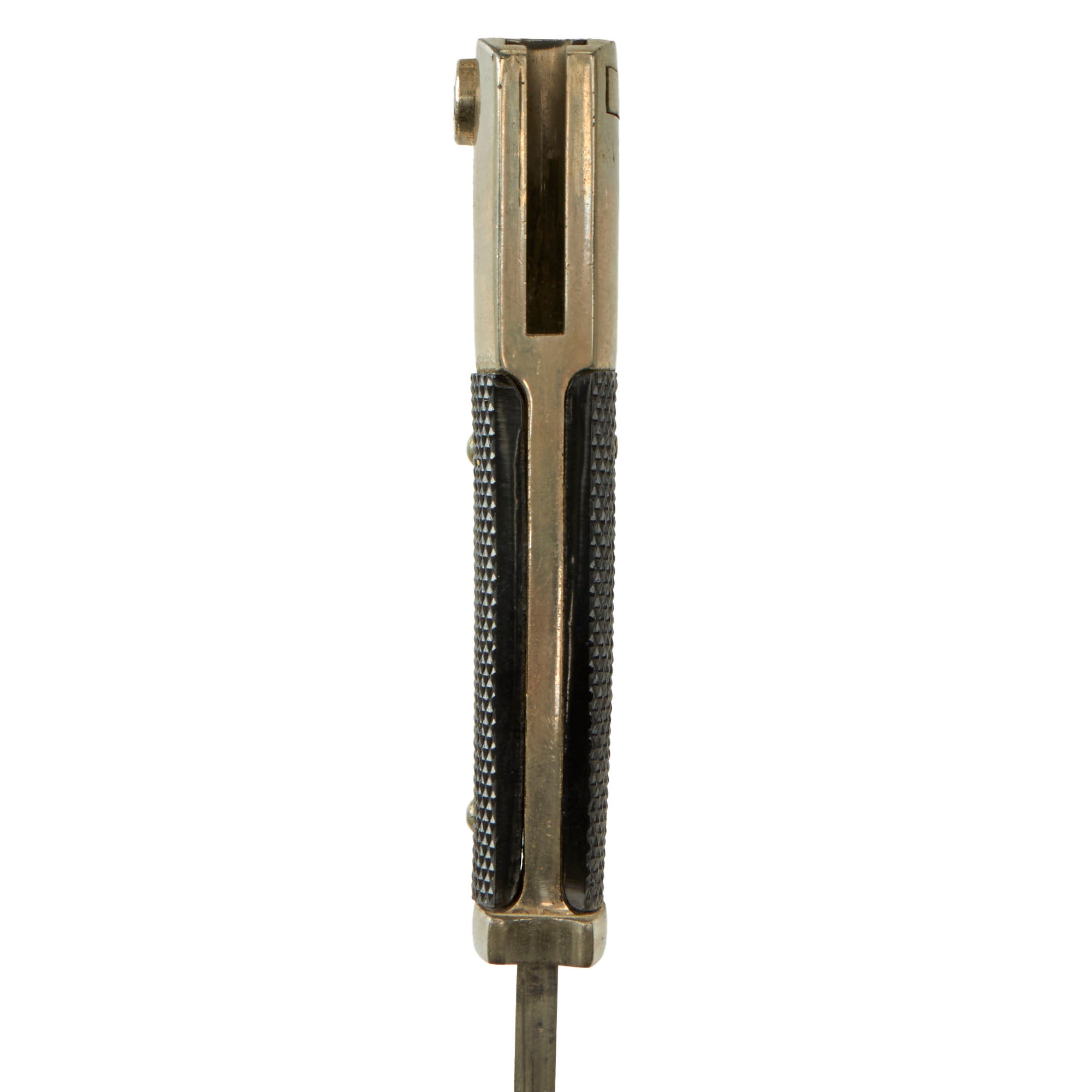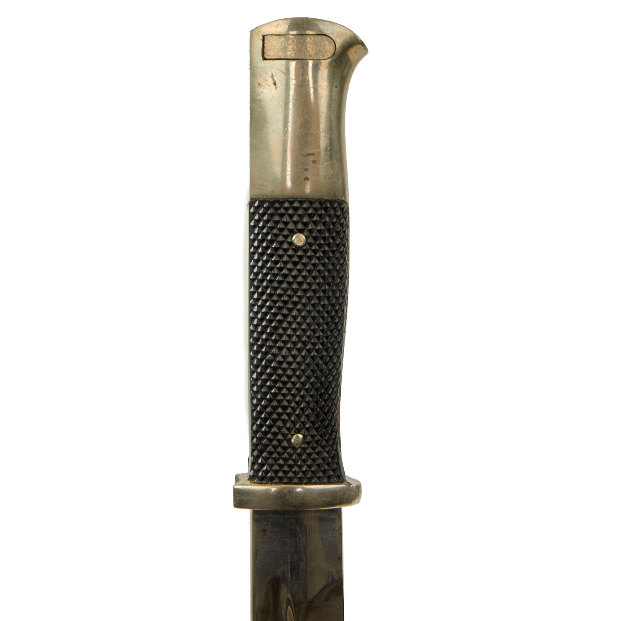 This example has the correct "military style" handle, which is made from nickel plated non-magnetic alloy. It features a functional slot and catch, with checkered bakelite grip scales retained by nickel alloy rivets, which are dressed on the reverse. It sports a beautiful nickel plated 9 7/8” blade, which is shaped identically to the standard S84/98 III. The nickel plating is retained almost completely, and there have not been any attempts to sharpen the edge, as is correct. There is some scattered light oxidation and scuffing from cleaning, and there is no leather blade buffer present.