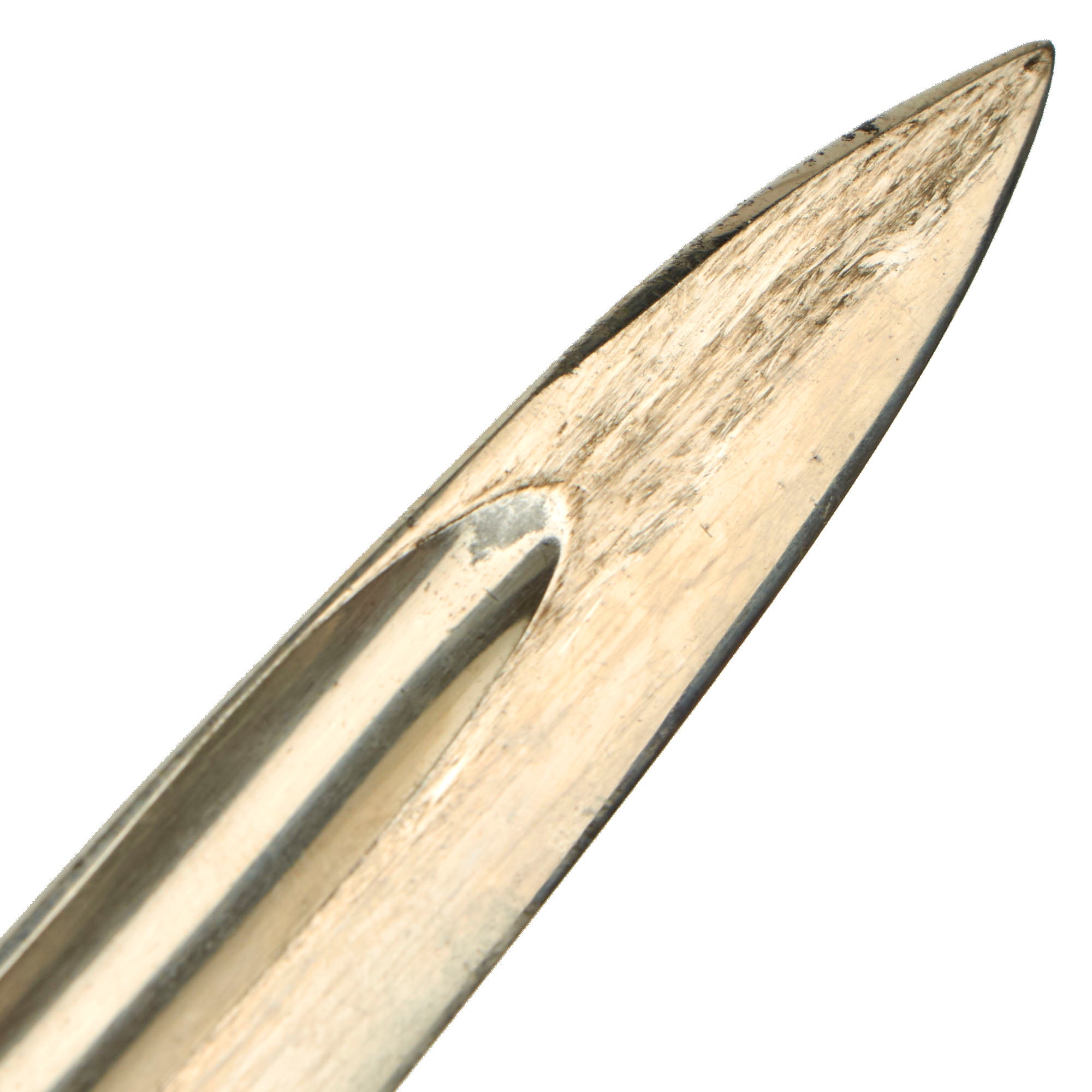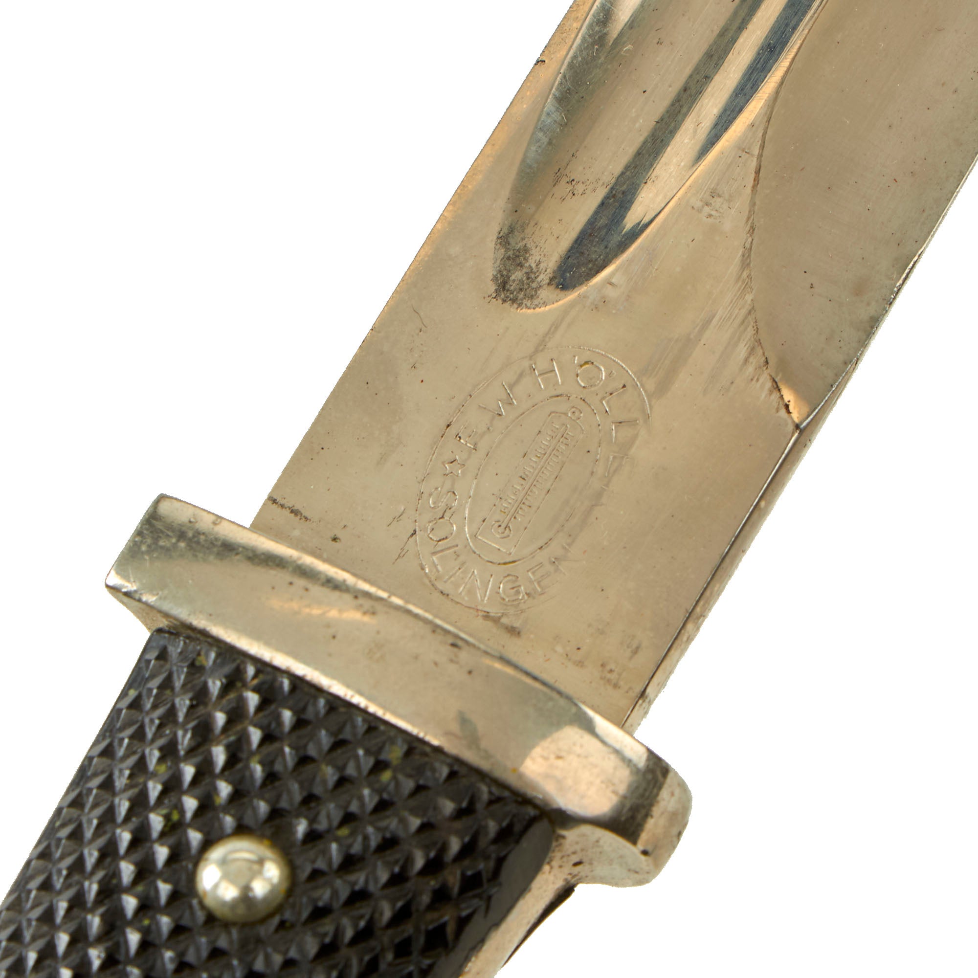 The ricasso is maker stamped with a "losenge" style trademark logo that reads F. W. HÖLLER / SOLINGEN, surrounding the trademark Höller "Thermometer" emblem, which is partly under the chappe. This is a well-known maker from Solingen, the famous "City of Blades" in Western Germany, which produced many fine edged weapons. F.W. Höller, Waffenfabrik (Weapons Factory), located in Solingen, the legendary "City of Blades" in western Germany. During the WWII Period they manufactured many SA and NSKK daggers, both with their "thermometer" trademark and later with the RZM code M7/33. They also produced numerous 98K bayonets and other edged weapons. The firm was founded in 1866, and registered in Solingen in 1883. By 1900 ownership had passed to Emil Höller, and it continued manufacture after WWII, finally closing in 1974. For more information please see J. Anthony Carter's fine work GERMAN SWORD AND KNIFE MAKERS.