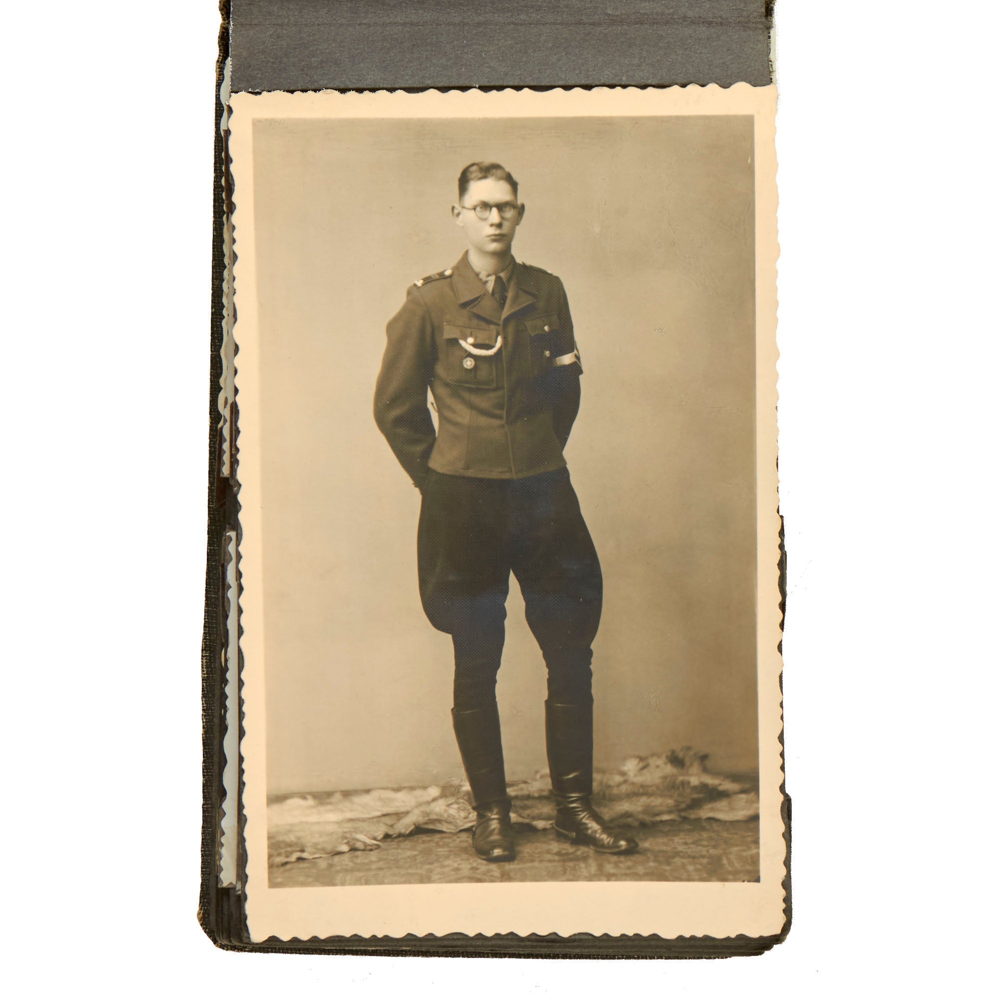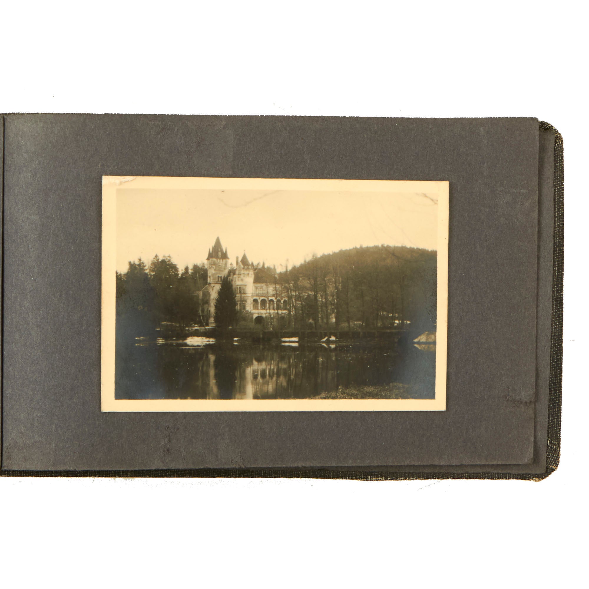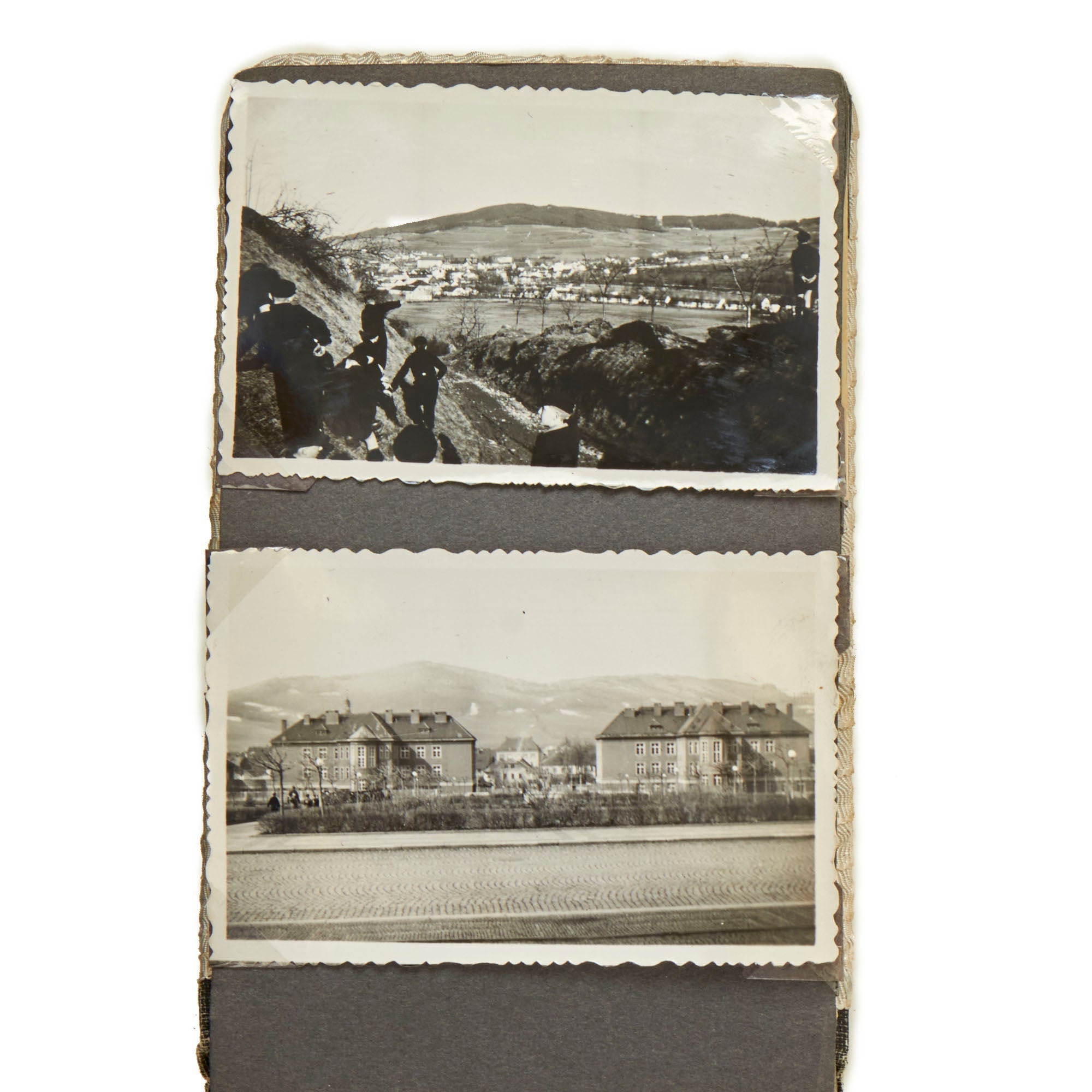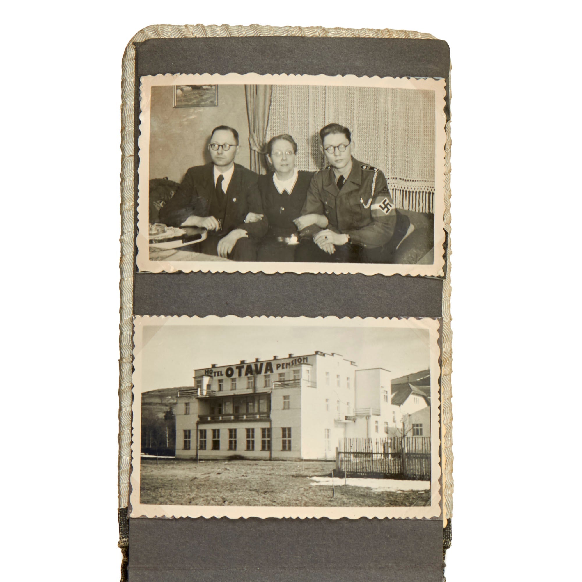 Original Item: One-Of-A-Kind. This is a wonderful personal photo album from a Leader in the HJ National Youth Organization, showing pictures from his time in service, as well as many pictures of the places he visited. The album is covered with black fabric, however it has had a piece of plastic laced to the front, under which is a picture of the Czech resort LETOVISKO SUŠICE NA ŠUMAVĚ (Sušice resort in the Šumava Mountains). It is a relatively small album compared to most we handle, measuring approximately 6" x 3 5/8", and is a bit worn around the edge, so this is not an album that spent its live in a closet.