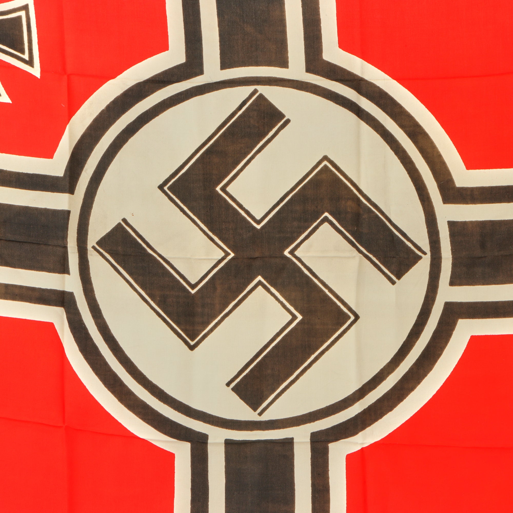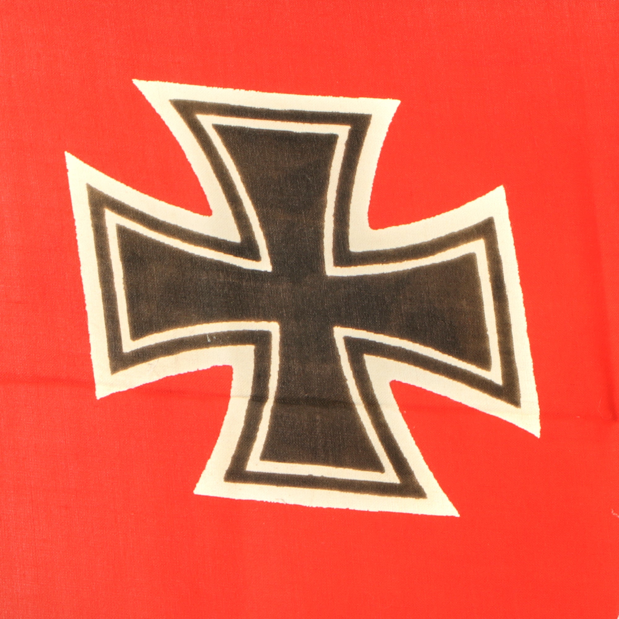 Constructed of what feels like all cotton, the printed flag design features a bright red background with a large white central circle displaying a large Swas (hook cross), overlaid on the German Naval Balkenkreuz (Beam Cross) design also in black to the edges. In the top corner (Canton) is a black on white Eisernes Kreuz (Iron cross) cross pattée. It features a canvas header, however the halyard rope was removed long ago.