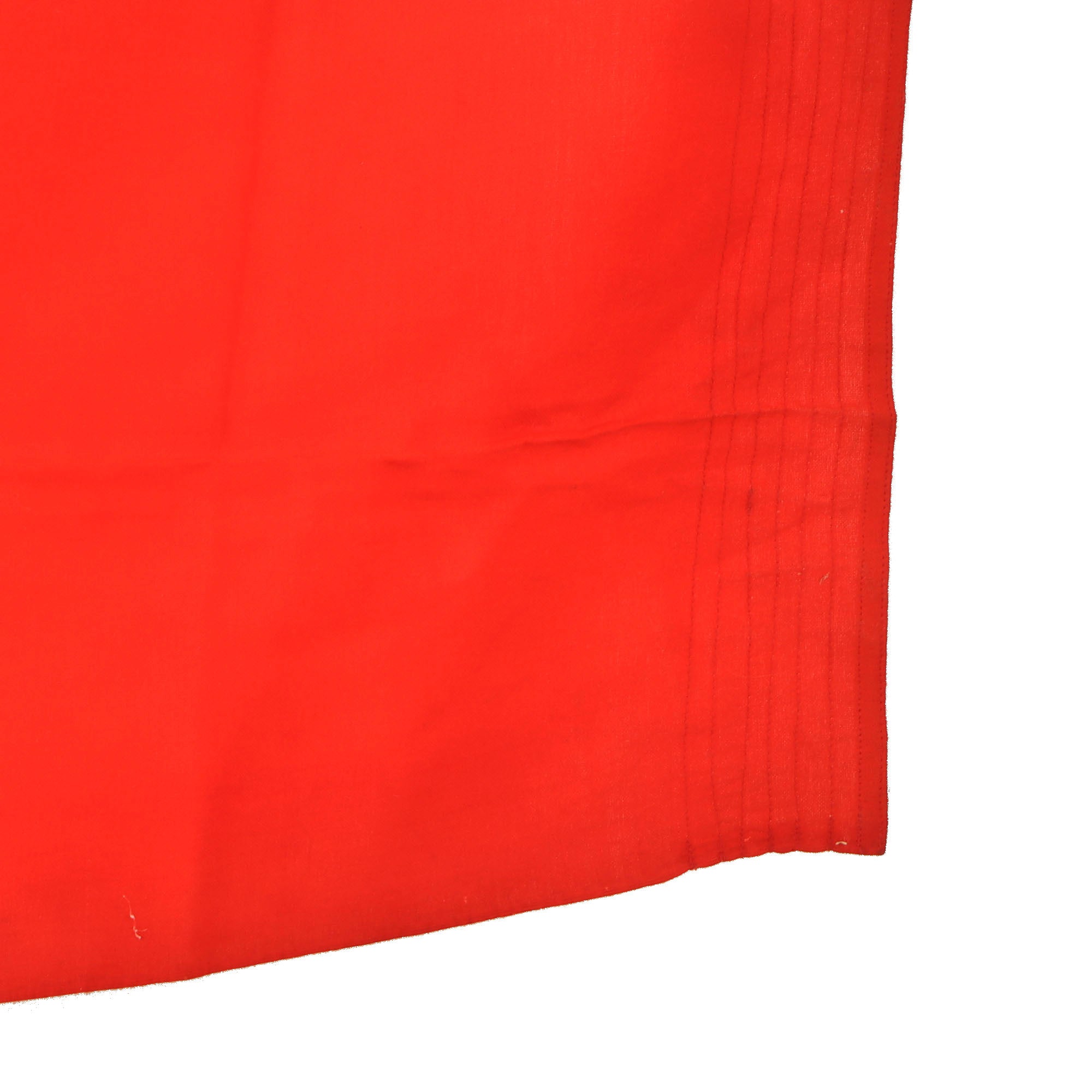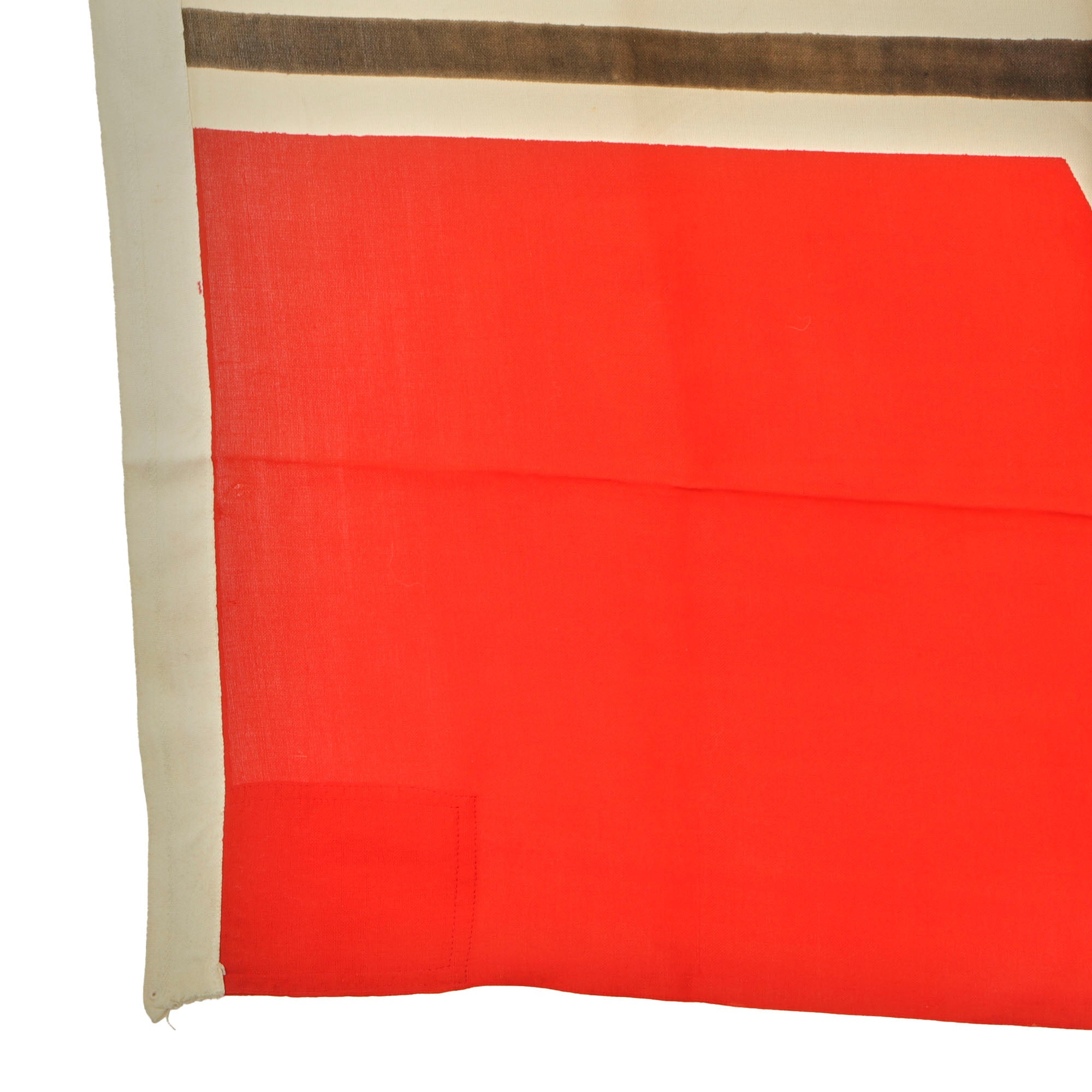 This Naval battle flag is totally original and is in very good service used condition, with the expected wear and damage due to age. It looks to have been laundered several times, and the holes near the header corners indicate it was on display for a long period of time. This has made the red somewhat less vibrant than it was, and the black areas are a bit faded to brown in areas. The flag is marked on the header with an Eagle / M indicating German Kriegsmarine (Navy) acceptance. This marking is a bit faded due to age and cleaning, and the original header markings are also completely gone for the same reason.