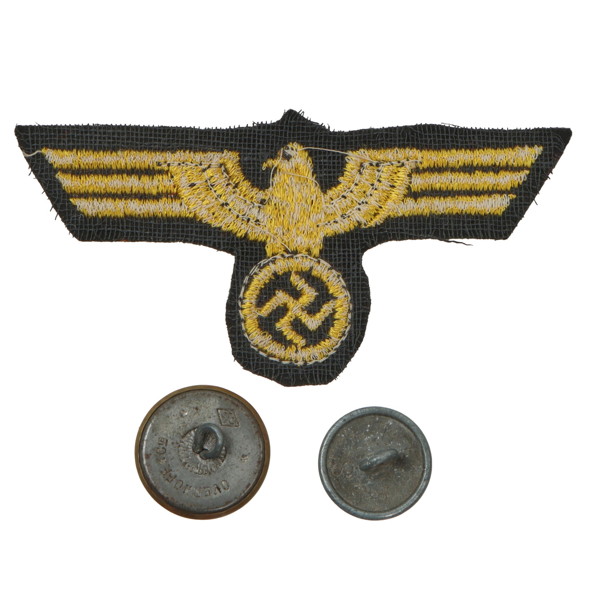 Original Items: Only One Set Available. This is a very nice collection of German WWII Kriegsmarine Navy Insignia, which was brought back from the European theater by a USGI after the war was concluded. Many solders traded these on the way back, and would end up with a pocket full of various different collectible items, and this set represents the typical "haul" one might have come back with. There are a variety of sleeve insignia, including chevrons and ratings badges, and also several breast eagles. Definitely a nice set!