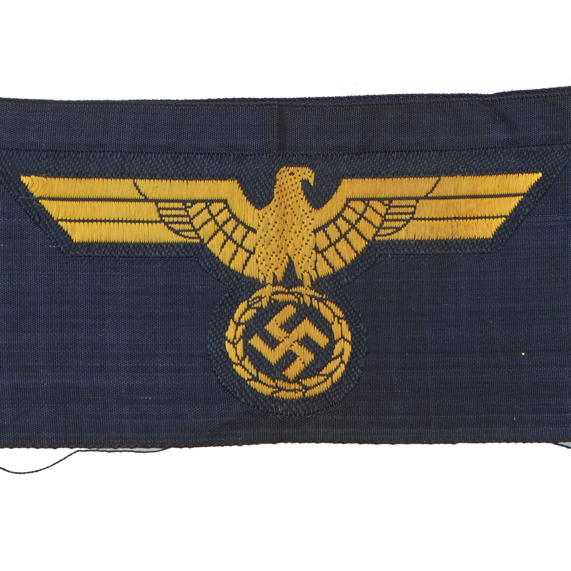 - One German WWII Kriegsmarine Machine Embroidered Breast Eagle, Gold on Black background. This would have been used on the navy blue uniform, and has no signs of being installed on a uniform.