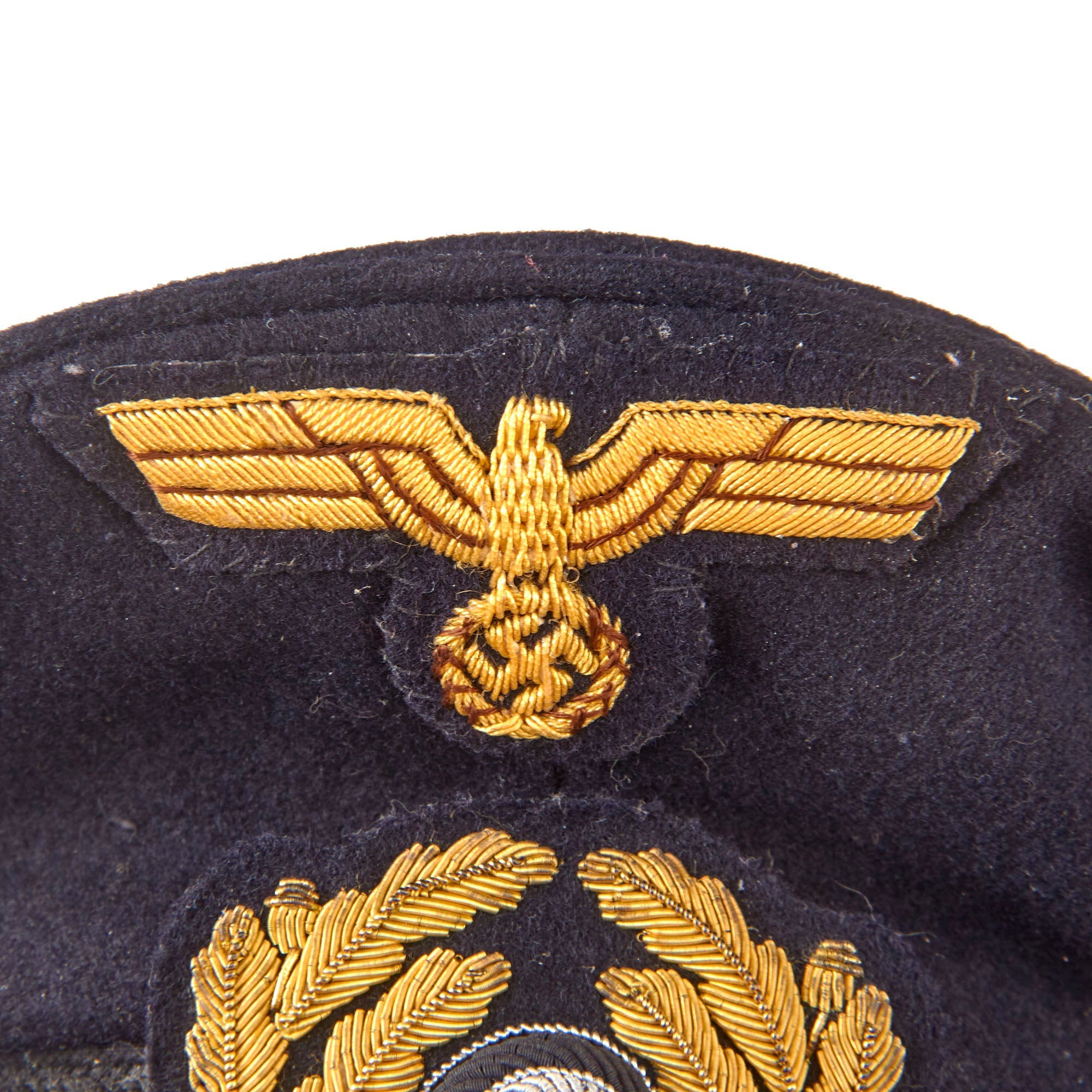 This is a fantastic German World War Two Kriegsmarine Navy Junior / Company Grade Officer's Schirmmütze (Visor Cap). This version of the cap was worn by officers of the Leutnant zur See (Ensign) rank up to Kapitänleutnant (Lieutenant). Constructed with dark navy blue wool, this cap is similar to the U.S. Navy "Combination" cap, and the crown is removable. This would allow various different color crowns to be attached to match the uniform. The Reichsadler National Eagle Insignia as well as the front cap badge wreath and tri-color cockade are all hand-embroidered with gold thread, with a red felt insert. The wreath looks to be metal bullion thread, while the eagle looks to be gold Celleon wrapped thread. By the early WWII period typically the cockade would at least be a cast insignia, but not on this example. The badge is attached to the classic black coarsely woven band, which is partly covered by the black patent leather chin strap.