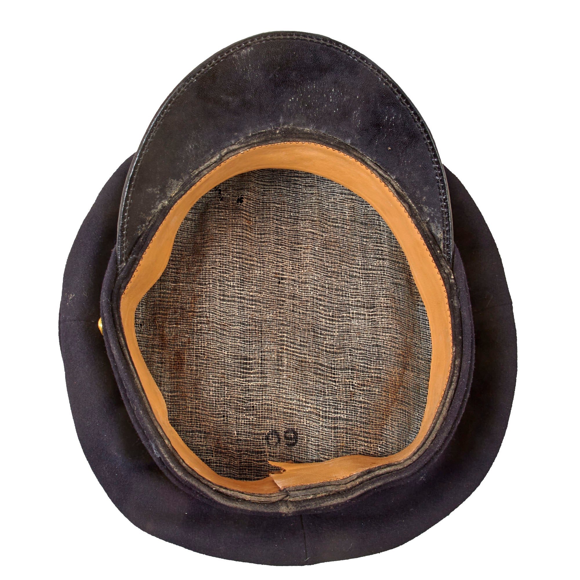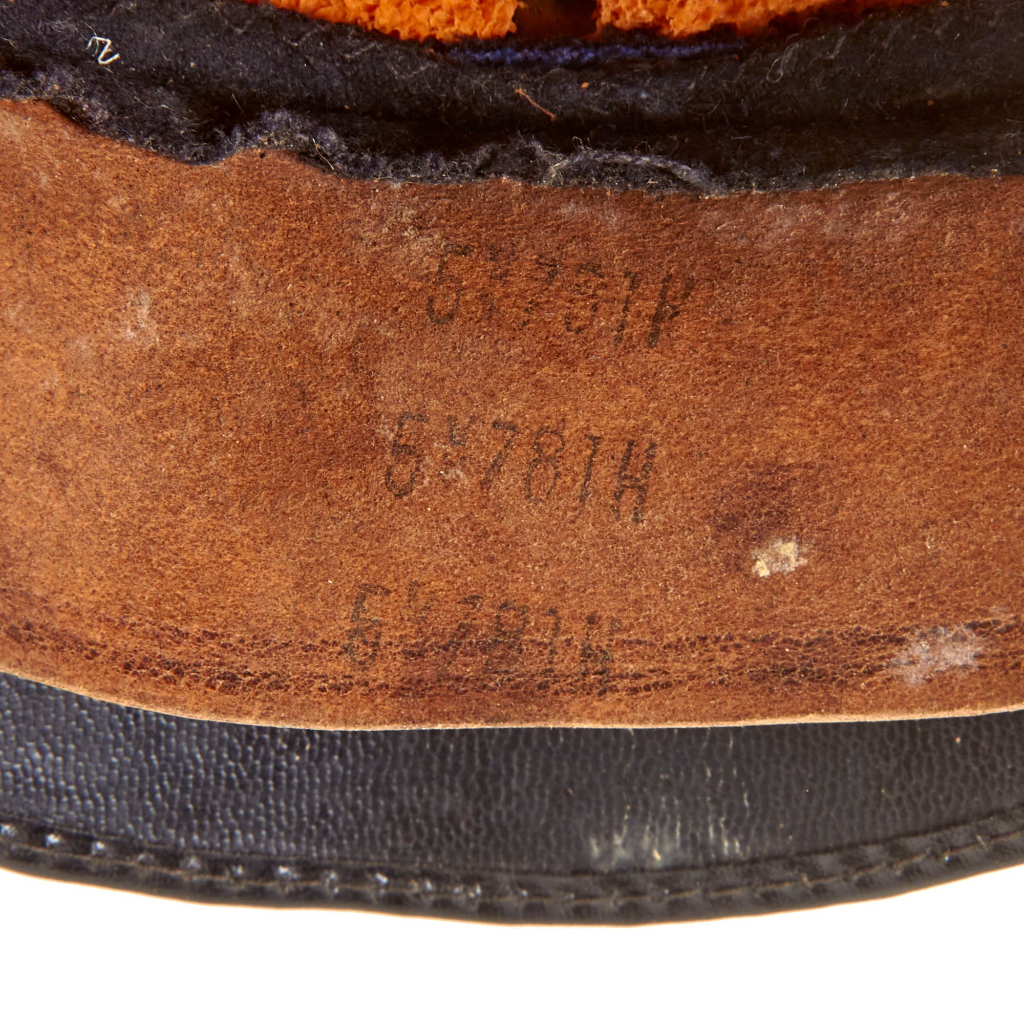 The visor has a felt top with half leaf embroidery around the edge, representing a junior or "company grade" officer. The underside of the visor is faux leather, and the edge trim on the visor is fully intact. The interior of the cap does not feature any type of lining under the crown, which is itself covered with a white tricot layer. We did note that it is size stamped 60 on the inside of the crown. The sweatband is made from tan finished leather, and is still in very good condition, supple with no major tears or damage, and intact stitching. The underside is stamped three times with 53781H, which is not a marking we recognize.