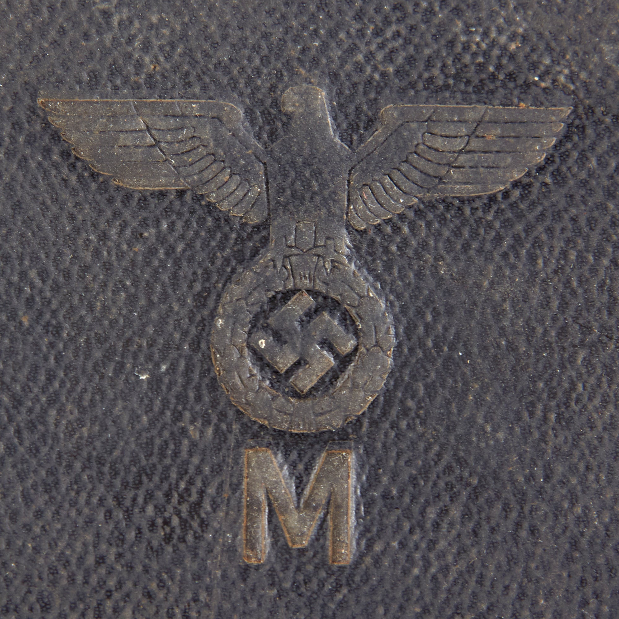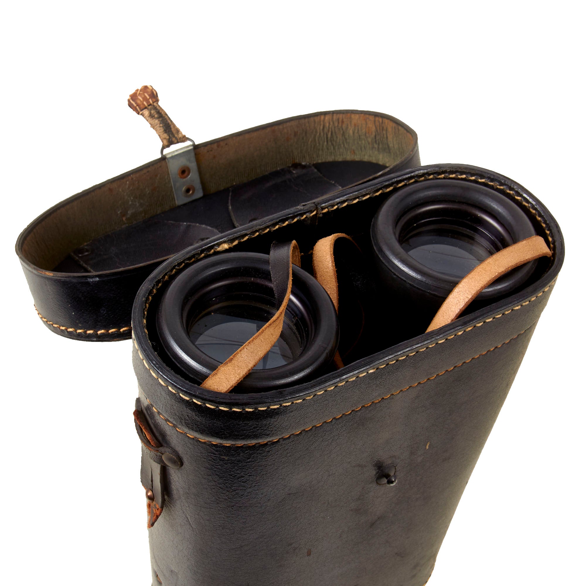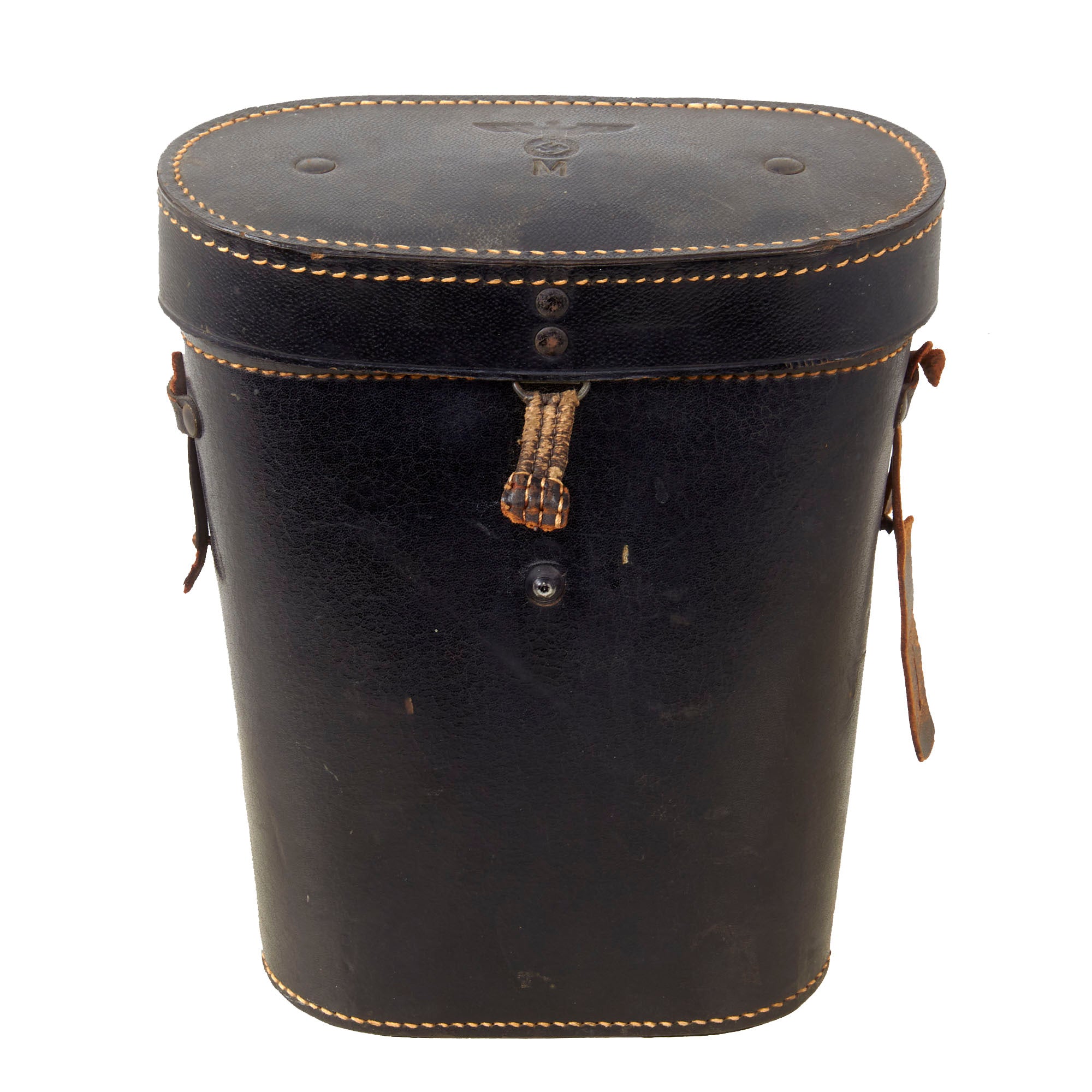 The binoculars come in their original black issue case, which has the Kriegsmarine Eagle / M proof on the lid. There is no maker mark or date we could find on the case, but it is likely also made by Leitz. The case retains a small portion of the strap but even that is heavily crazed, and the closing mechanism on the case is broken off at the end.