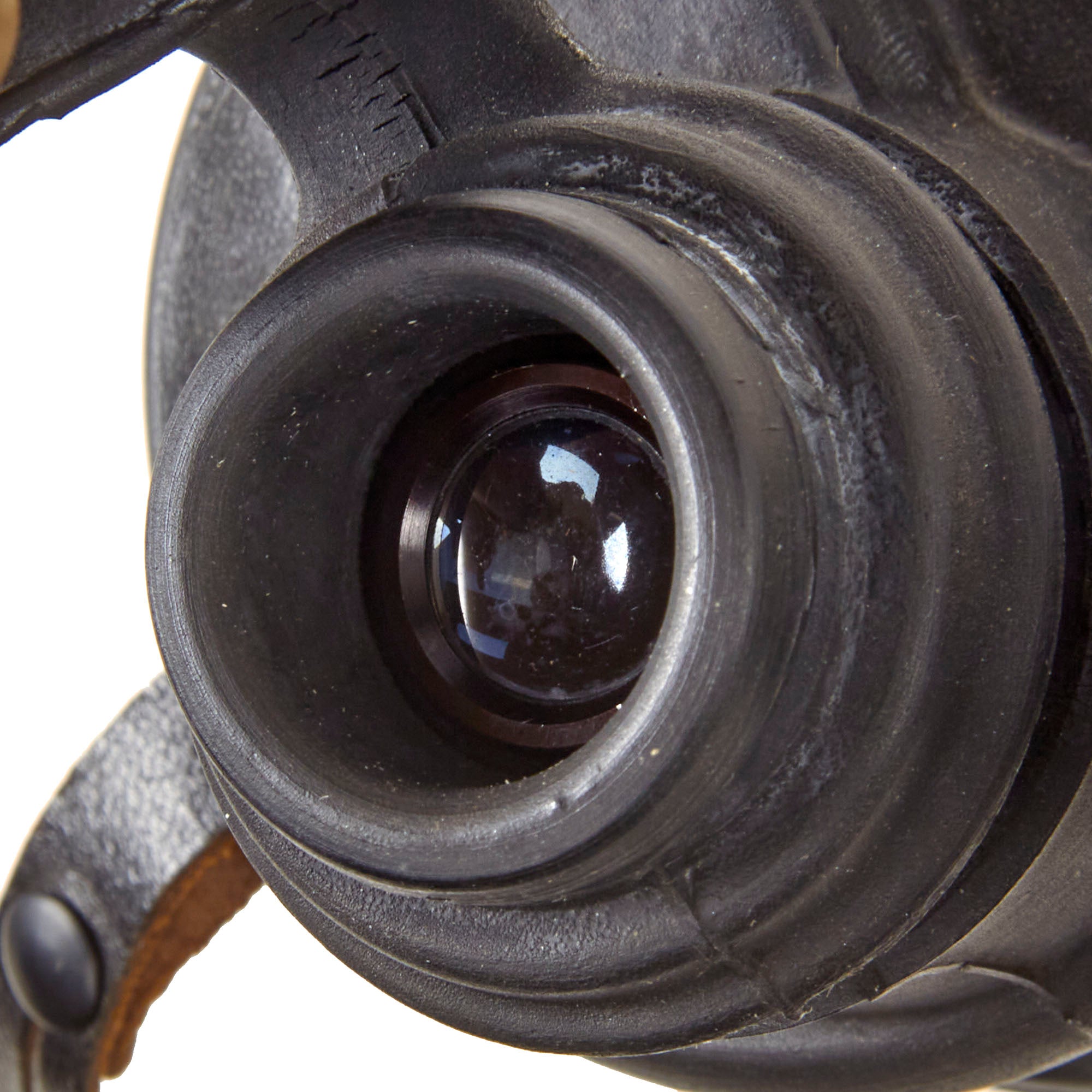 Gently pulling up the housing on the back of the left barrel shows the Leitz 3-letter code beh under the 7 X 50 magnification settings. The other side of the barrel shows serial number 474223. We were unfortunately not able to get pictures of these, as we feared tearing the rare rubber fittings. The optics are very spotty from residue inside coming off, but they are still functional and come complete with original leather neck strap. Really a great set of binoculars here. They measure approximately 9" x 7 1/2" x 3". As previously stated, the rubber eye covers are both retained but one of the two has broken off of the binoculars themselves.