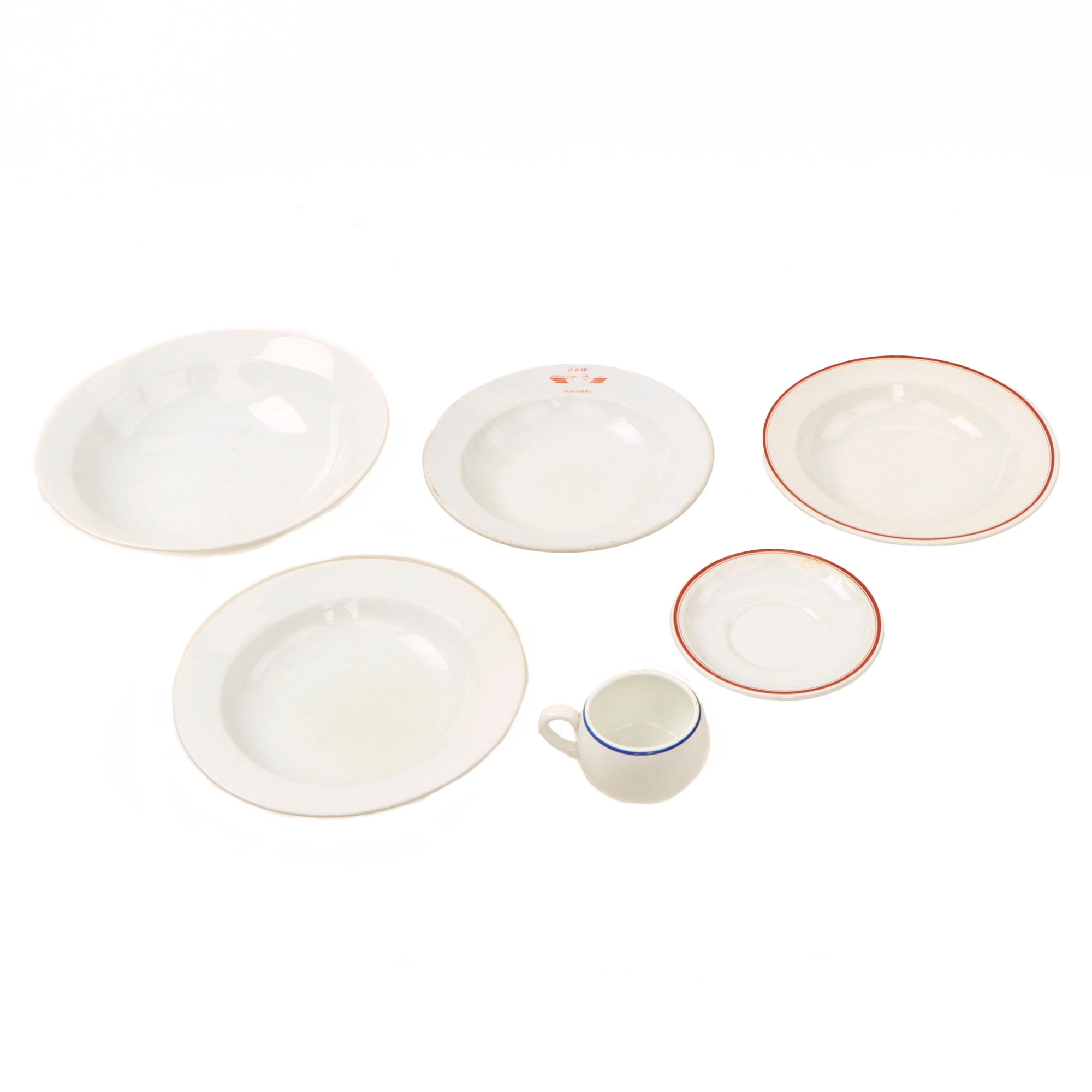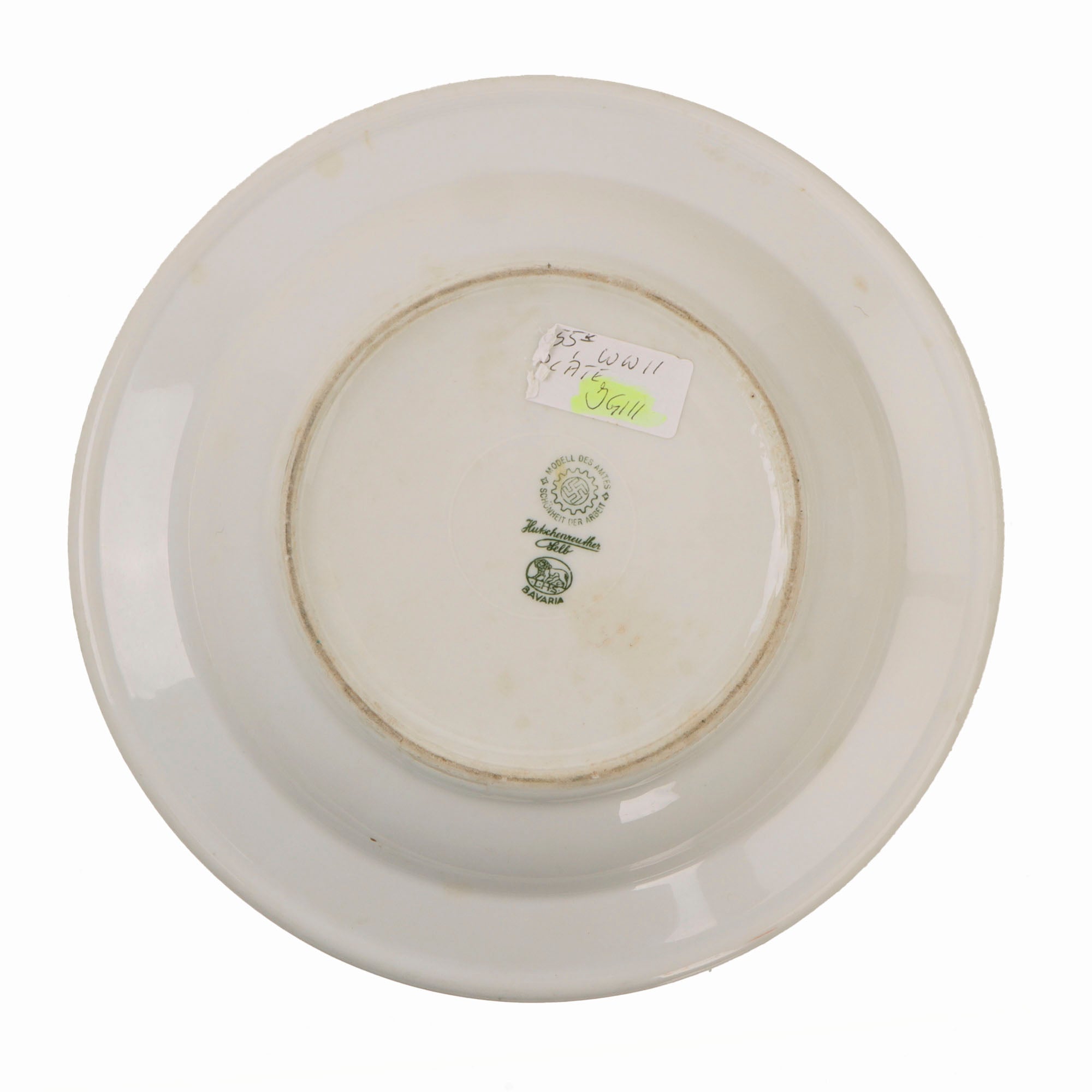 ● One Deep Plate measuring approximately 9 inches across, with a worn maker or organizational logo on the rim of the plate. It is marked on the bottom with the logo of known maker Bauscher of Weiden, Bavaria.