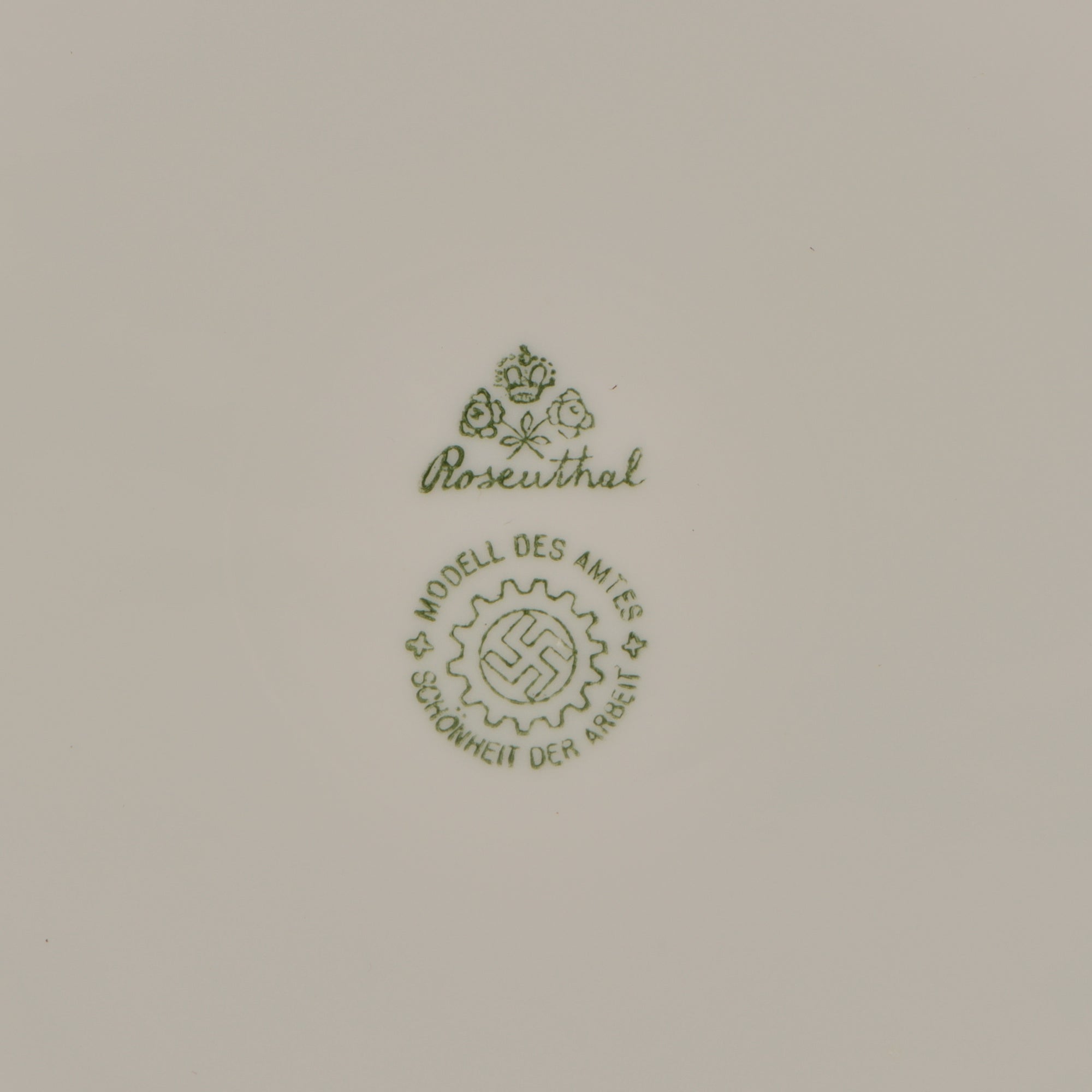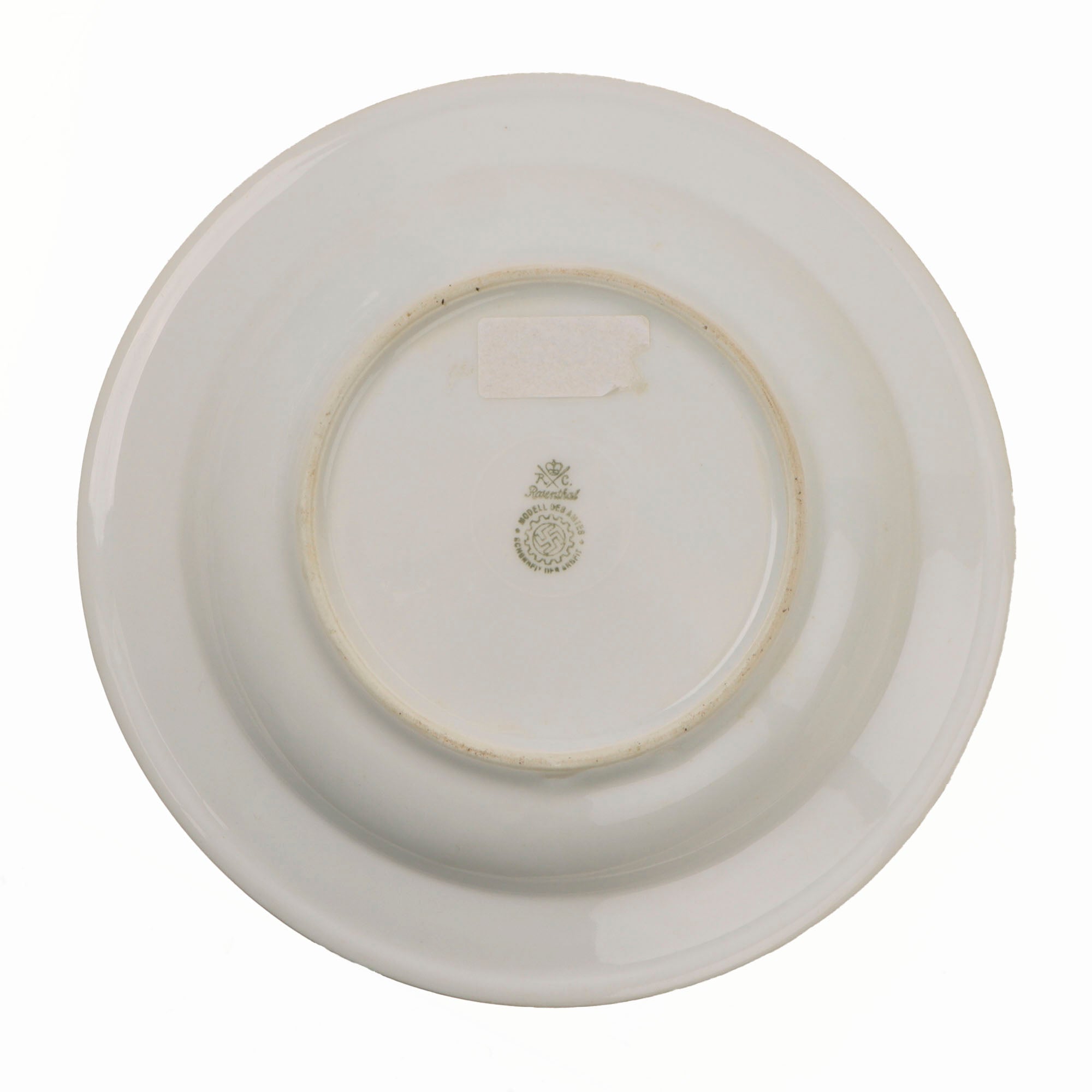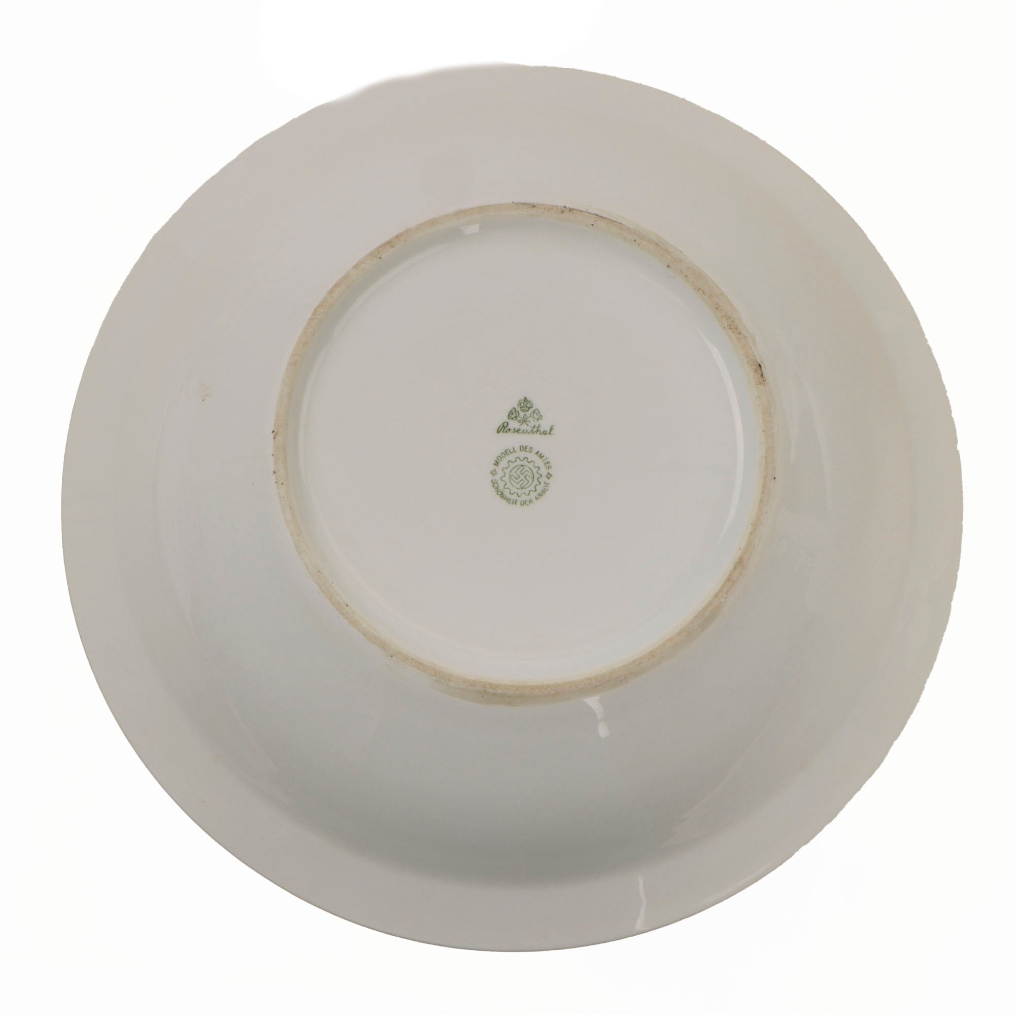 ● One Deep Plate measuring approximately 9 3/8 inches across, with no border or other markings on the top. It is maker marked on the bottom with the maker logo of Rosenthal of Selb, a Bavarian maker of fine porcelain that exists even today.