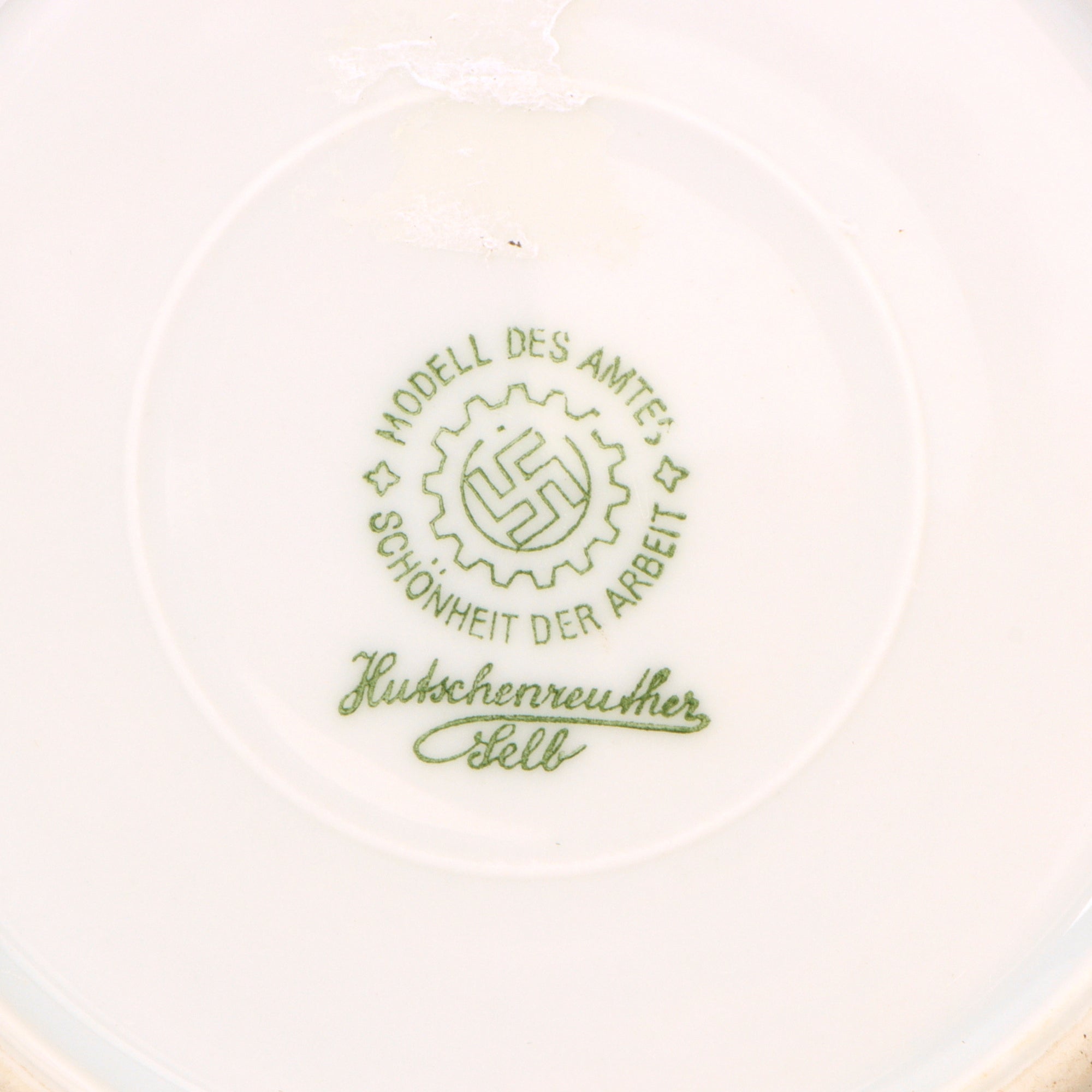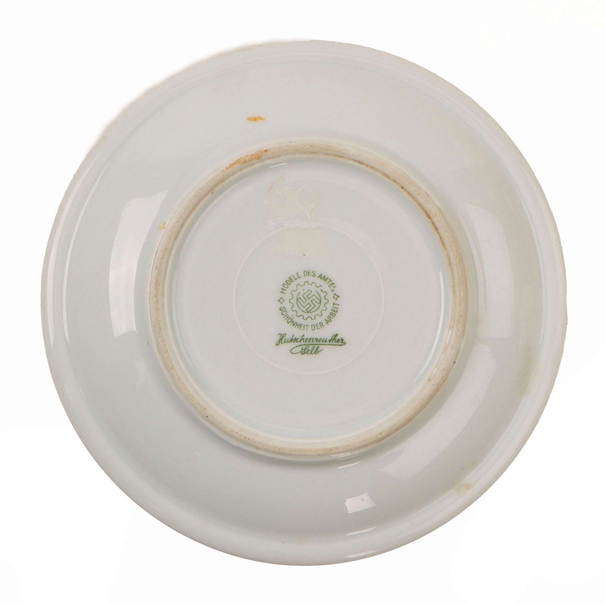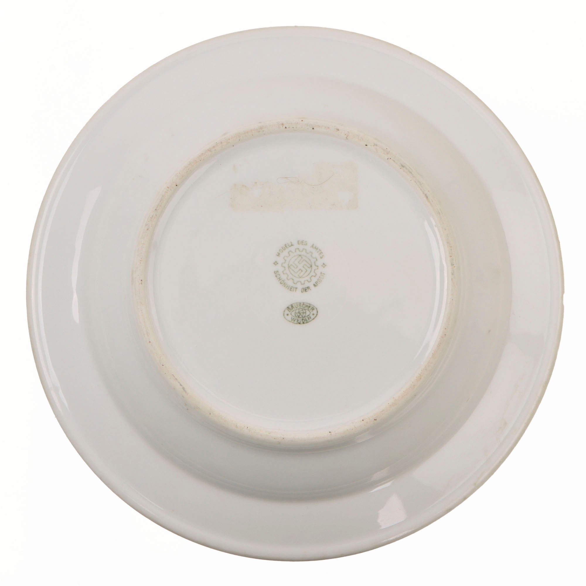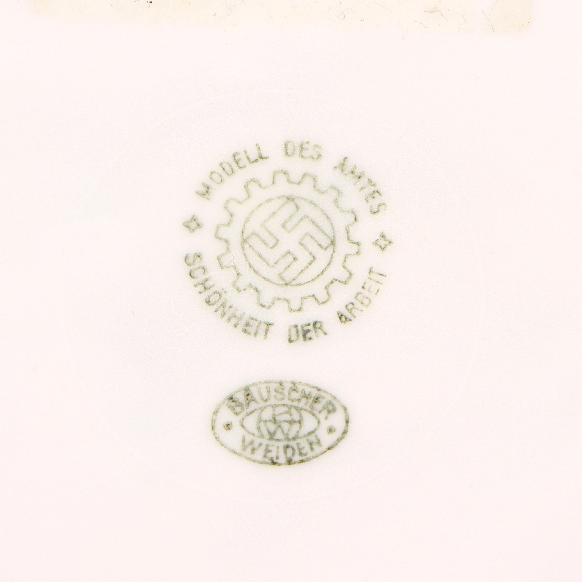 Original Item: Only One Available. This is a lovely set German WWII period porcelain items, as would be found in the mess of many organizations under the NSDAP umbrella. All of the items are plane glazed white porcelain, some with colored accent borders. One item has a specific organization logo on it, however all are marked with the DAF logo on the bottom, indicating that the factory was run under the authority of the German Labor Front, which had replaced all unions during the NSDAP period. This marking reads: