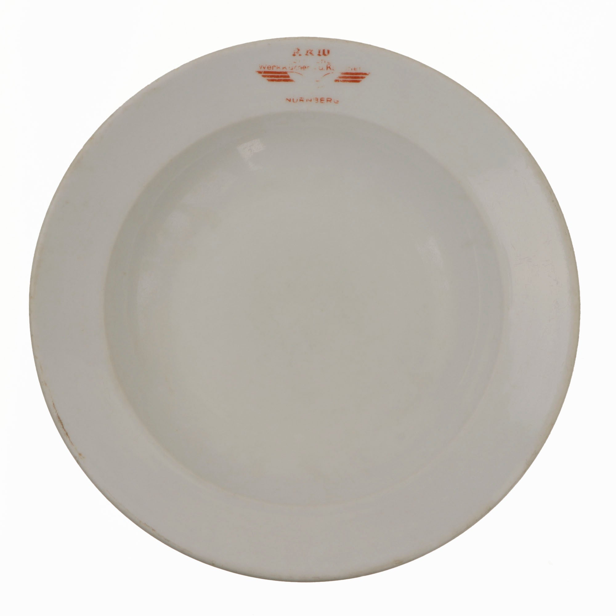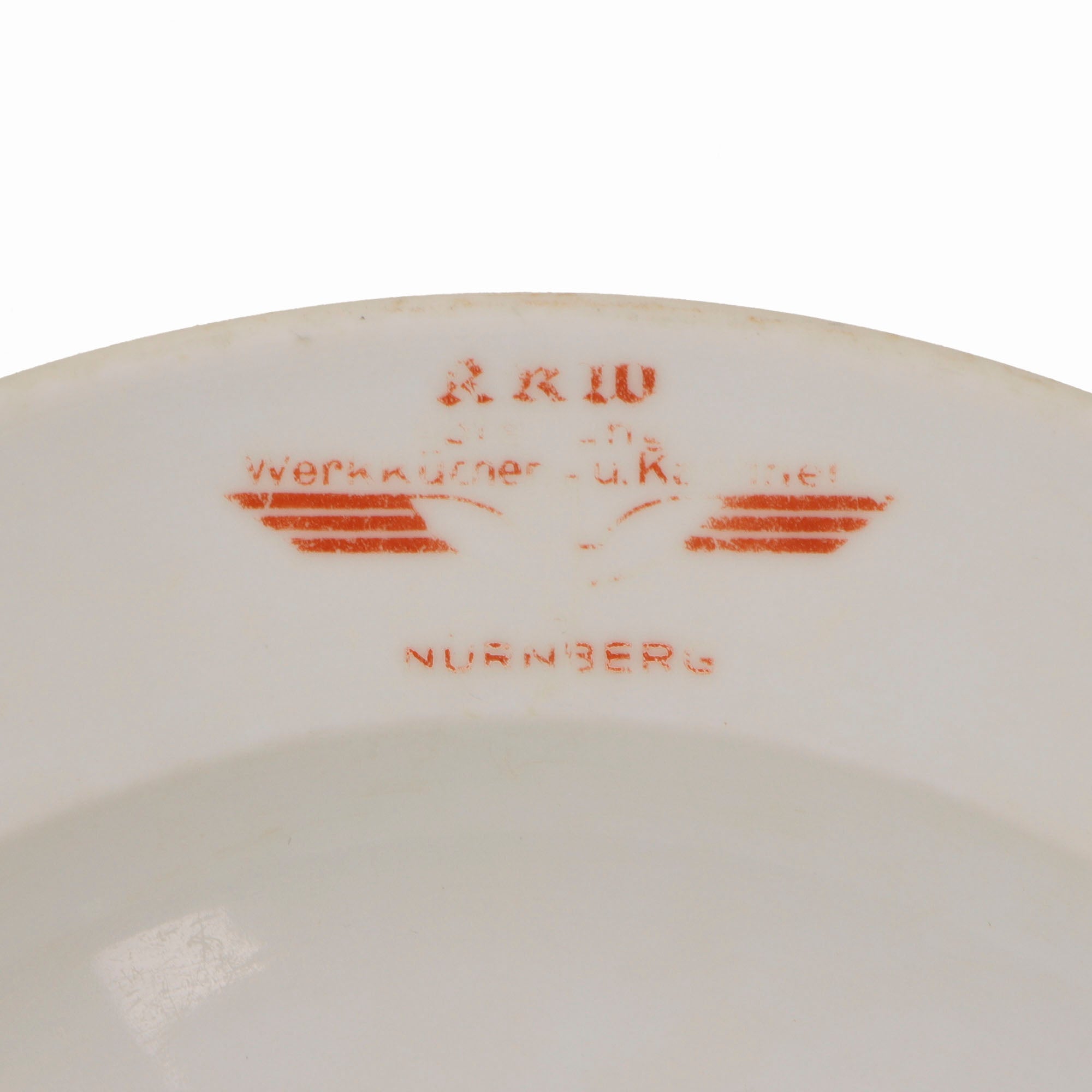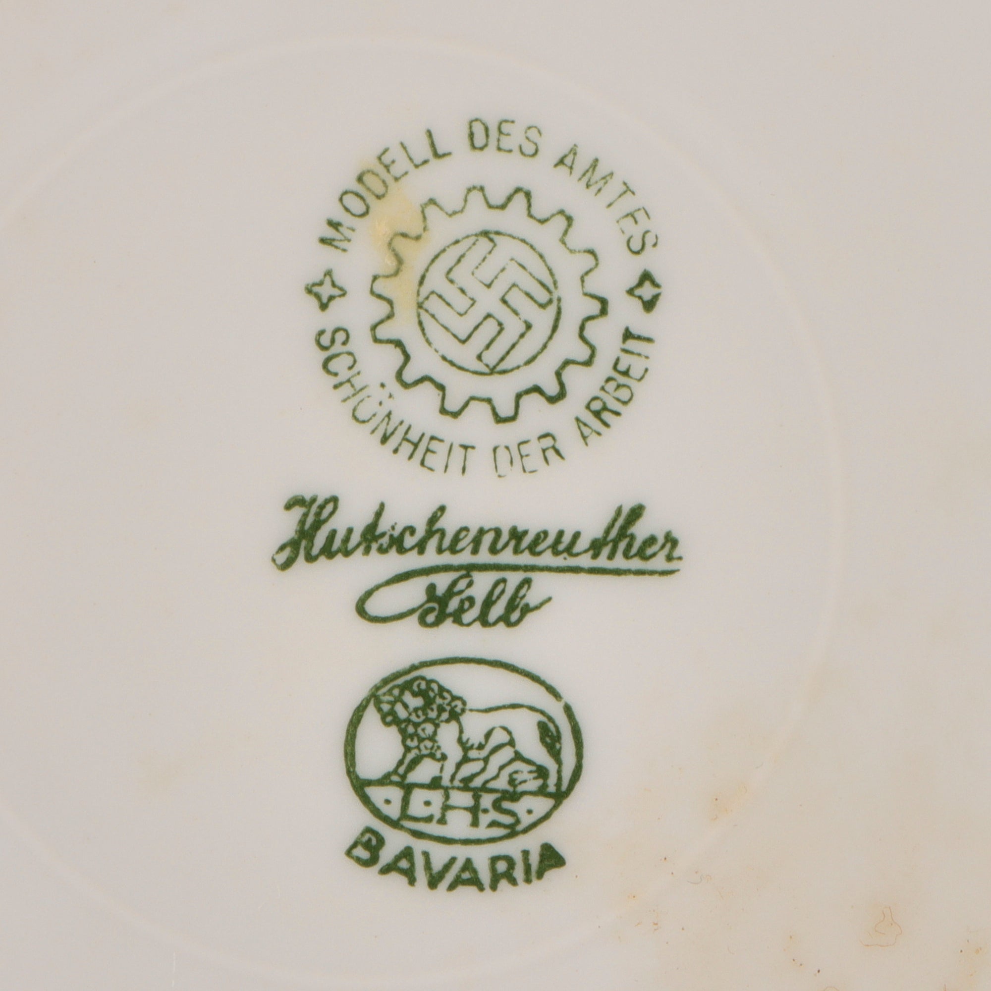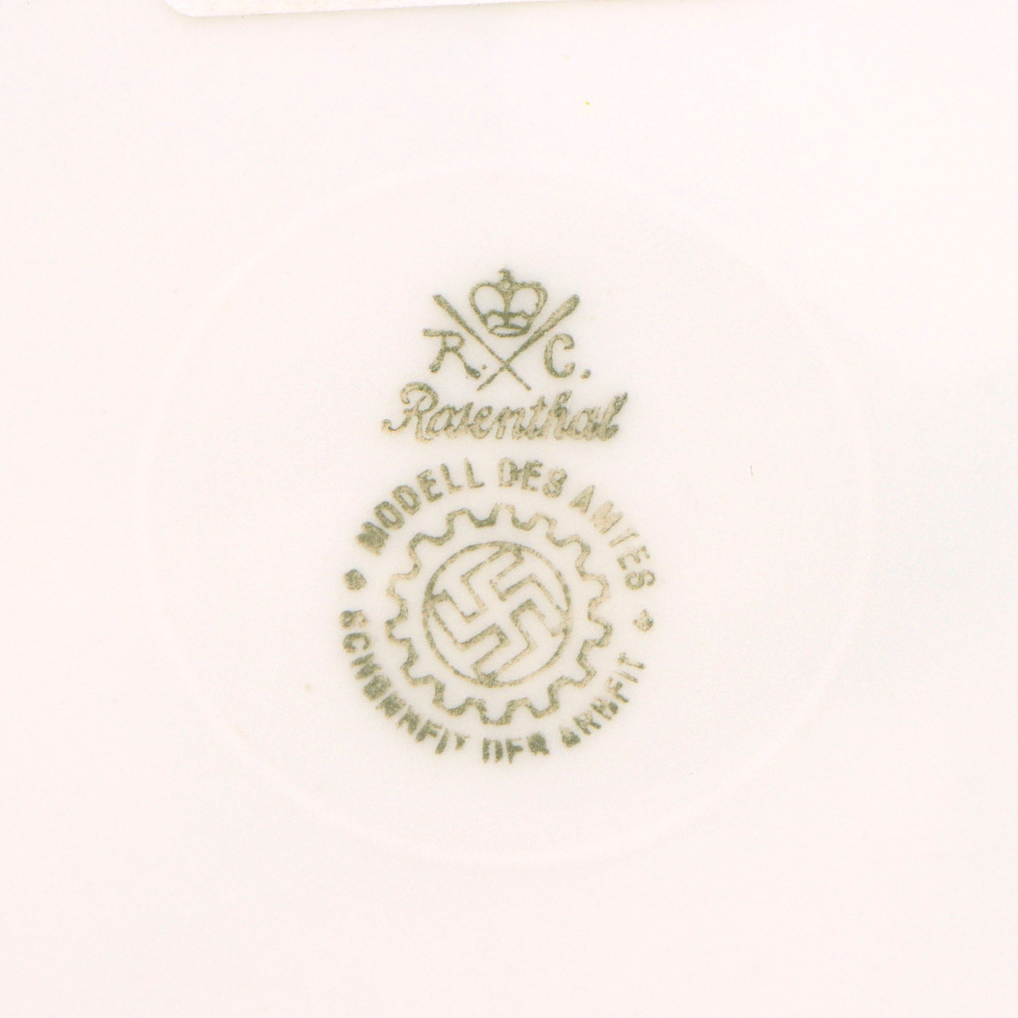 Original Item: Only One Available. This is a lovely set German WWII period porcelain items, as would be found in the mess of many organizations under the NSDAP umbrella. All of the items are plane glazed white porcelain, some with colored accent borders. One item has a specific organization logo on it, however all are marked with the DAF logo on the bottom, indicating that the factory was run under the authority of the German Labor Front, which had replaced all unions during the NSDAP period. This marking reads:
