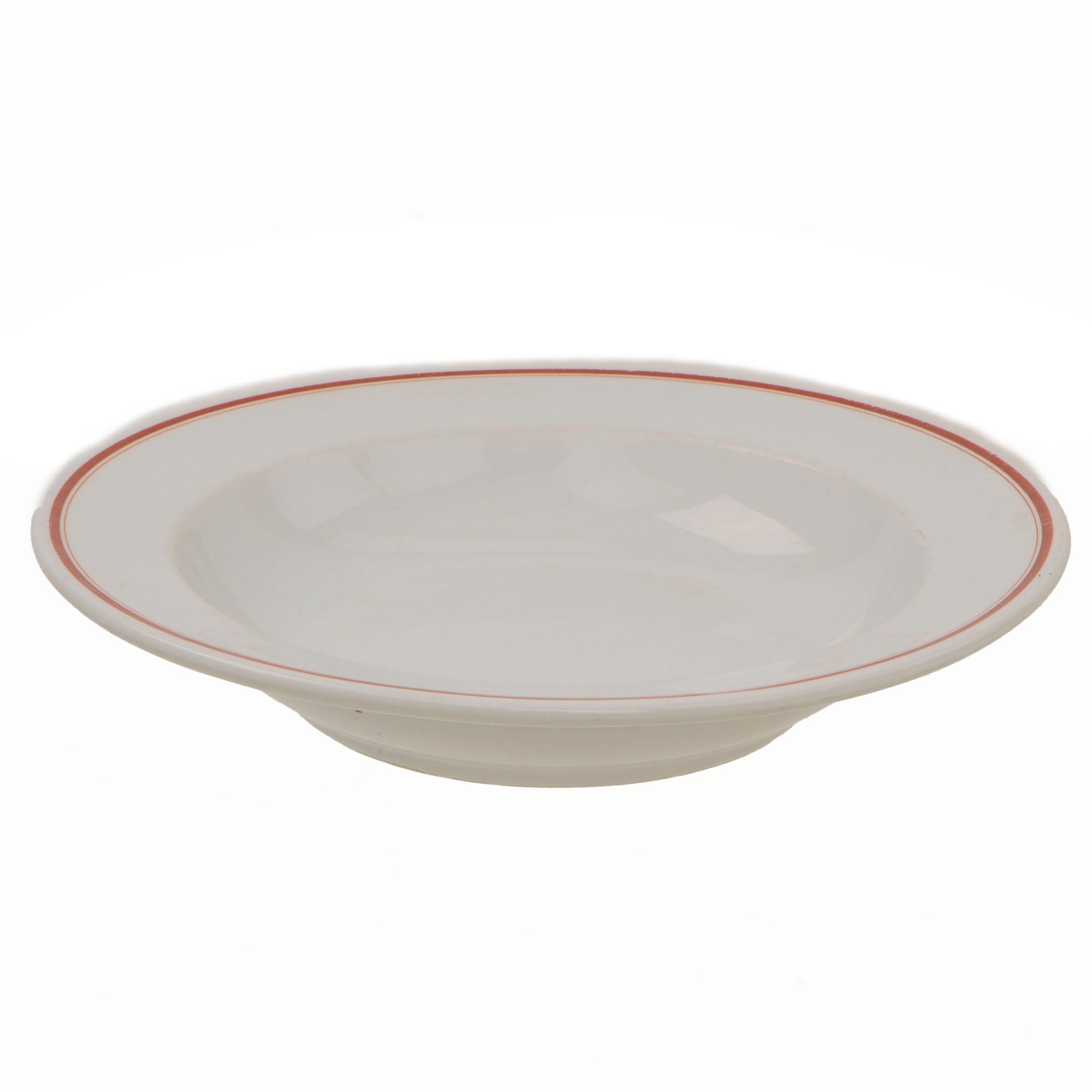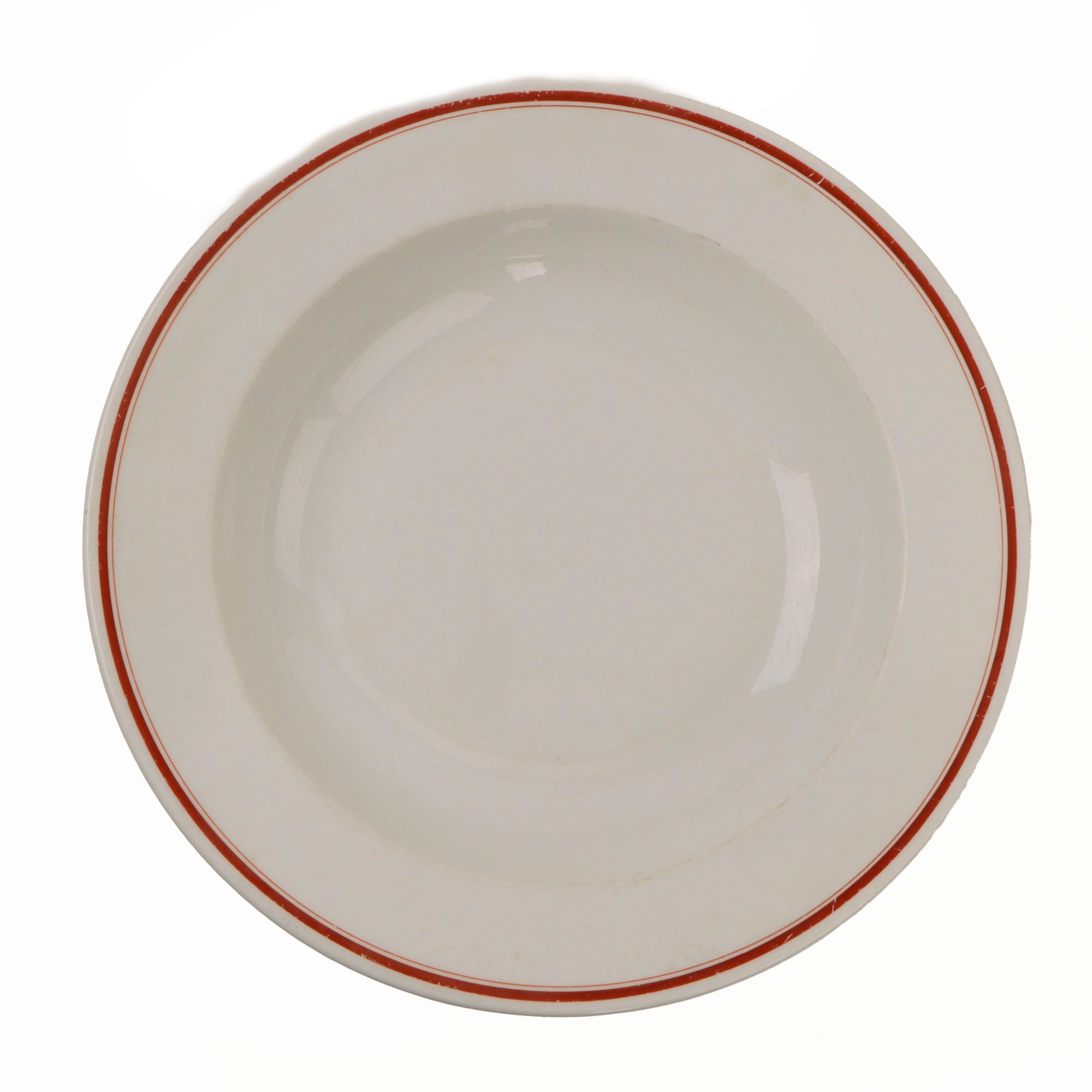 ● One Deep Plate measuring approximately 9 5/16 inches across, with a red border around the rim of the plate. It is maker marked on the bottom with the maker logo of Hutschenreuther of Selb, BAVARIA, a city known for porcelain and earthenware manufacture.