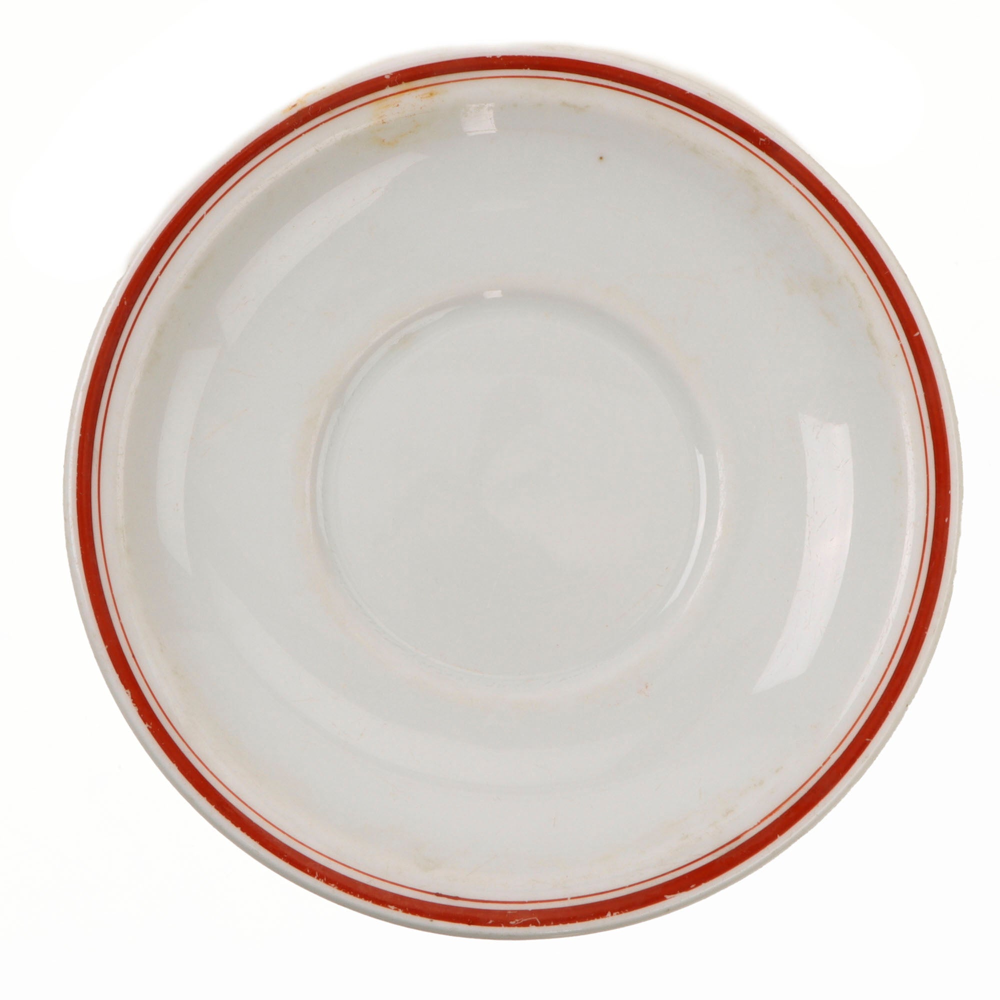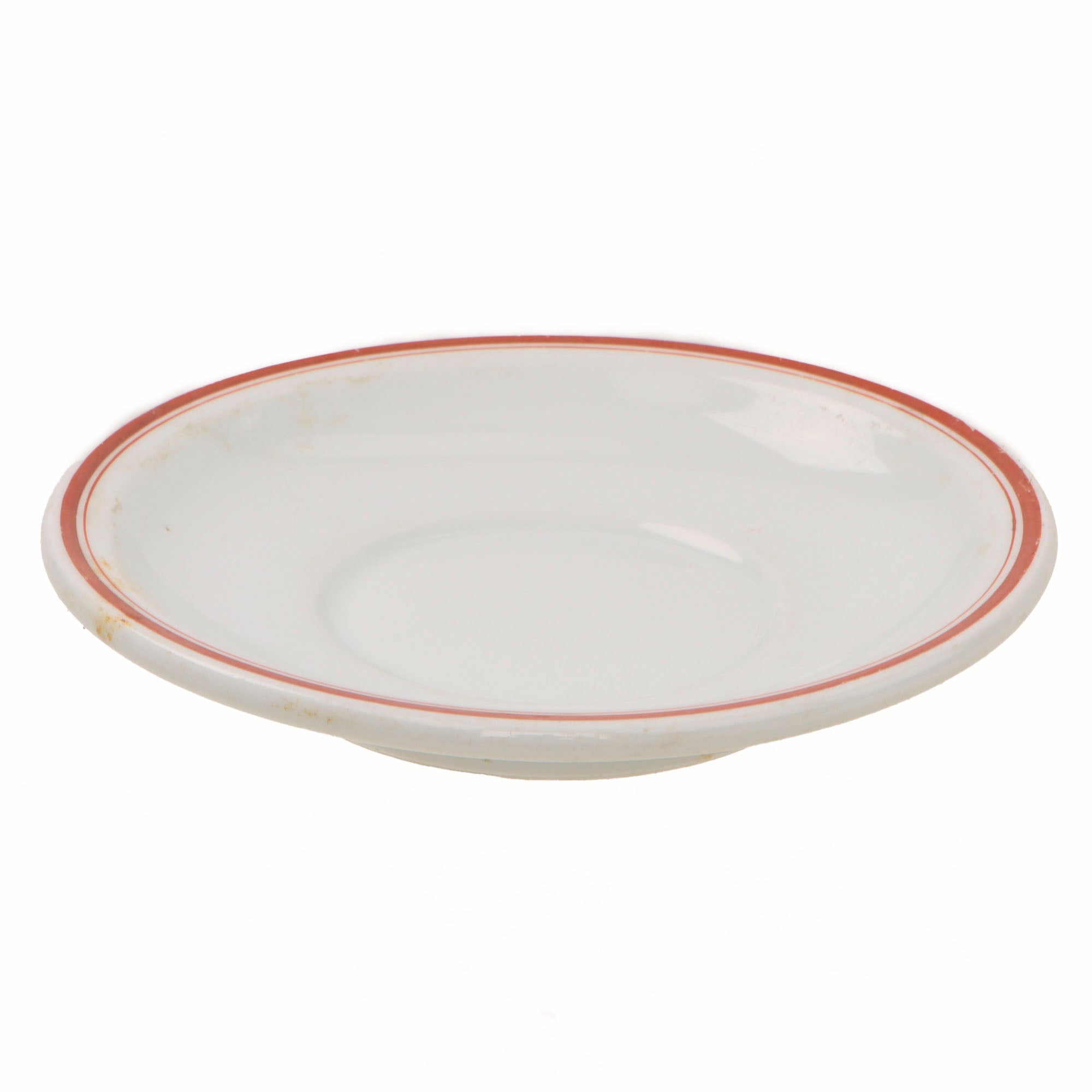 ● One saucer for a tea cup or coffee mug, white with a red border, measuring about 6 inches in diameter. It is maker marked on the bottom with the maker logo of Hutschenreuther of Selb, Bavaria, a city known for porcelain and earthenware manufacture.