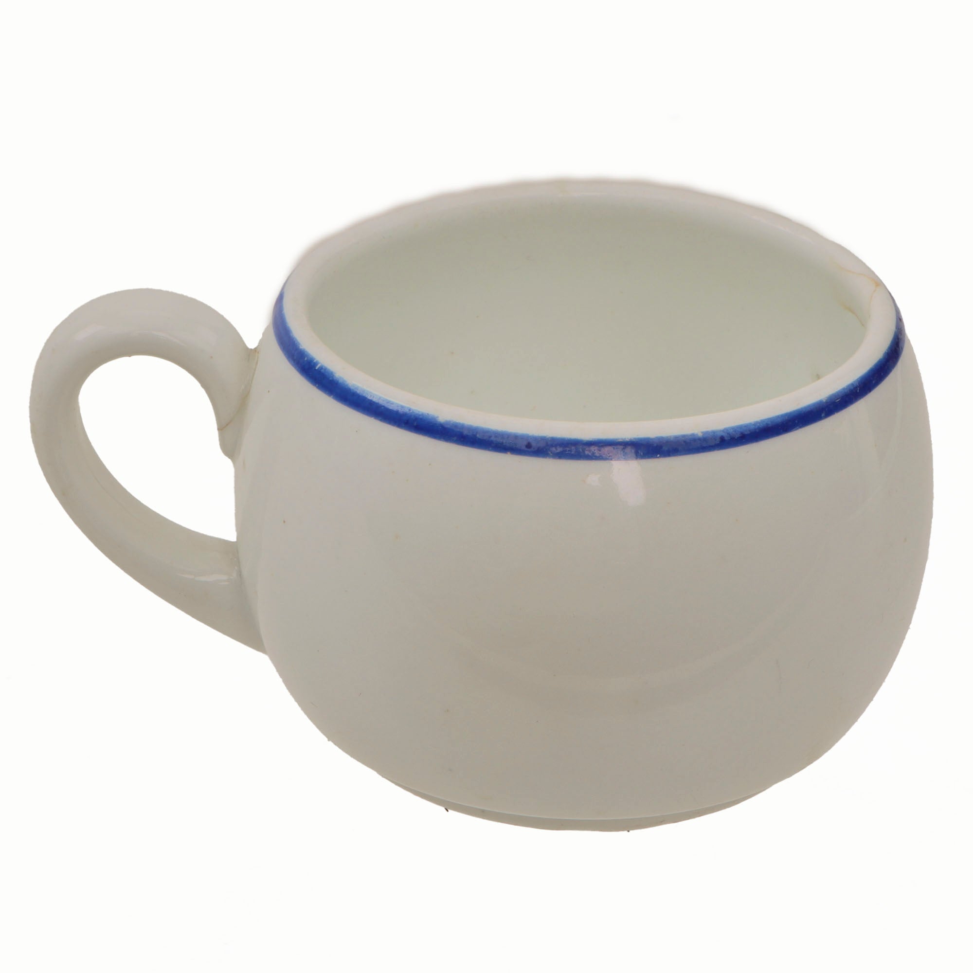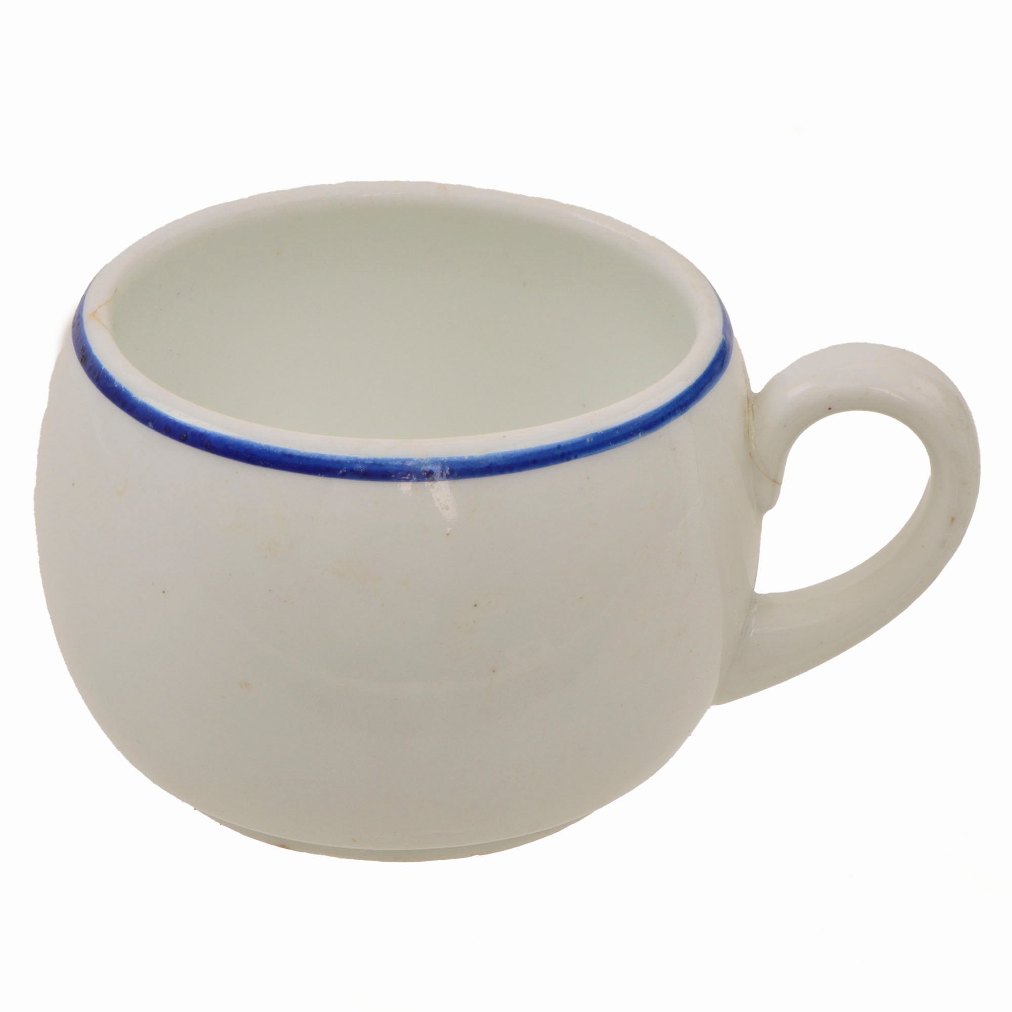 ● One small coffee mug, white with a blue border around the mouth. It is maker marked on the bottom with the maker logo of Hutschenreuther of Hohenberg, Bavaria, a known maker of fine porcelain that exists even today. Measures approximately 2 1/4"H x 3 1/4"W not counting the handle.