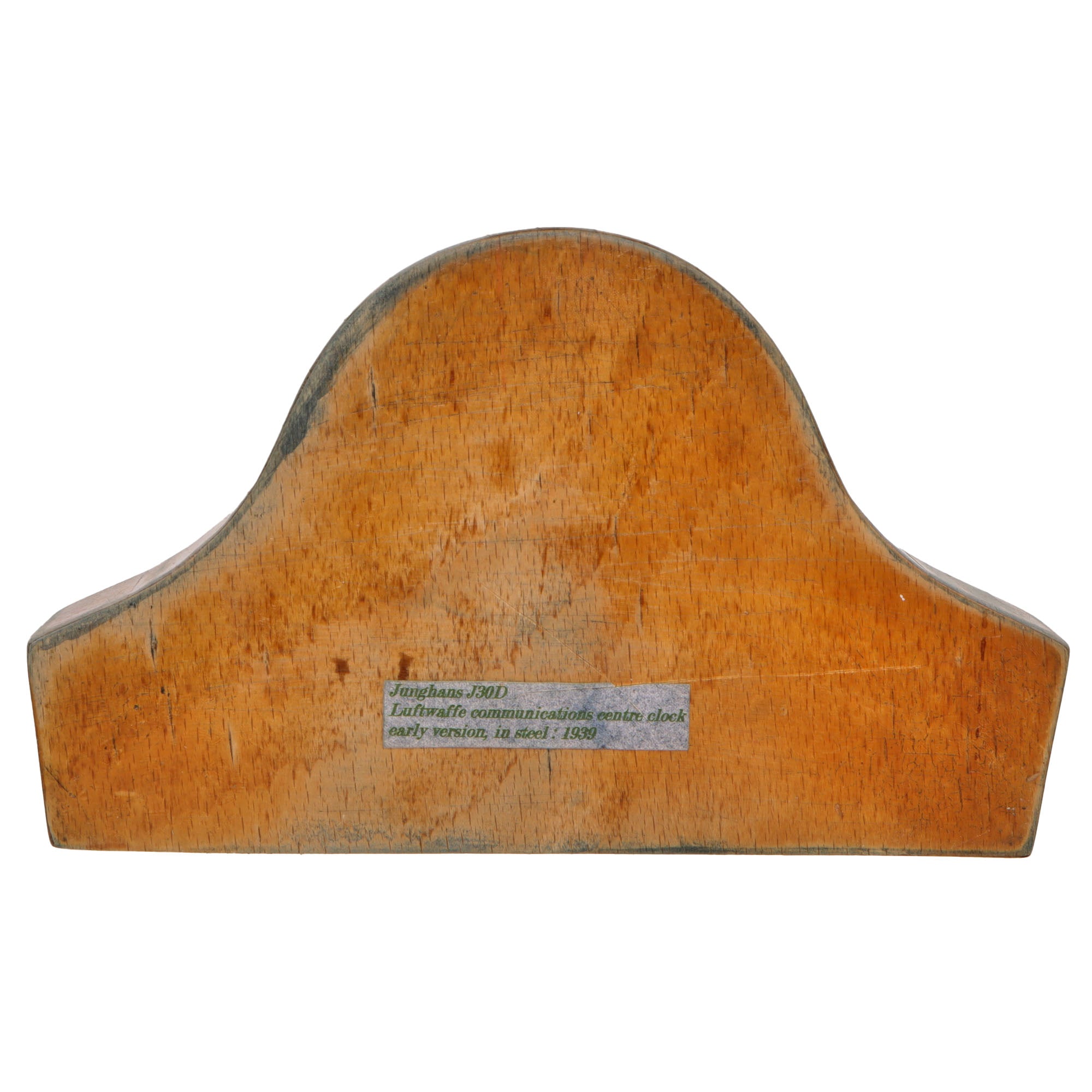 The back of the clock has the Junghans logo over J30D. The display stand shows very heavy wear from over the years with decades of scratches and a nice patina. It measures roughly 7 ¾ x 2 ¼ x 4 ⅝”. The back of the stand has a label reading: