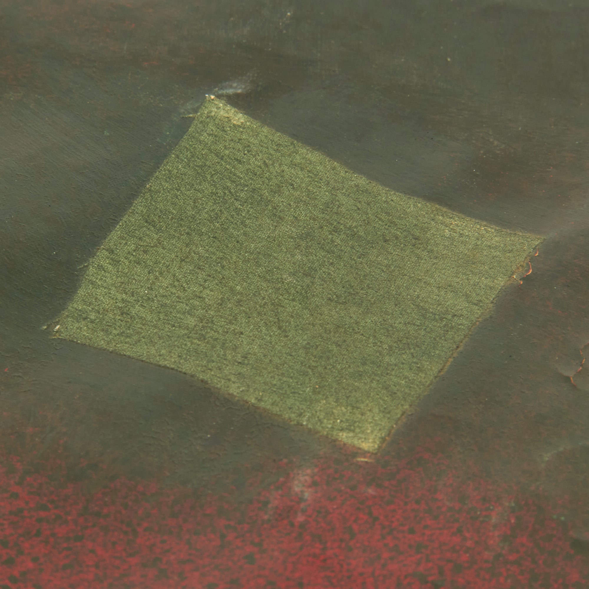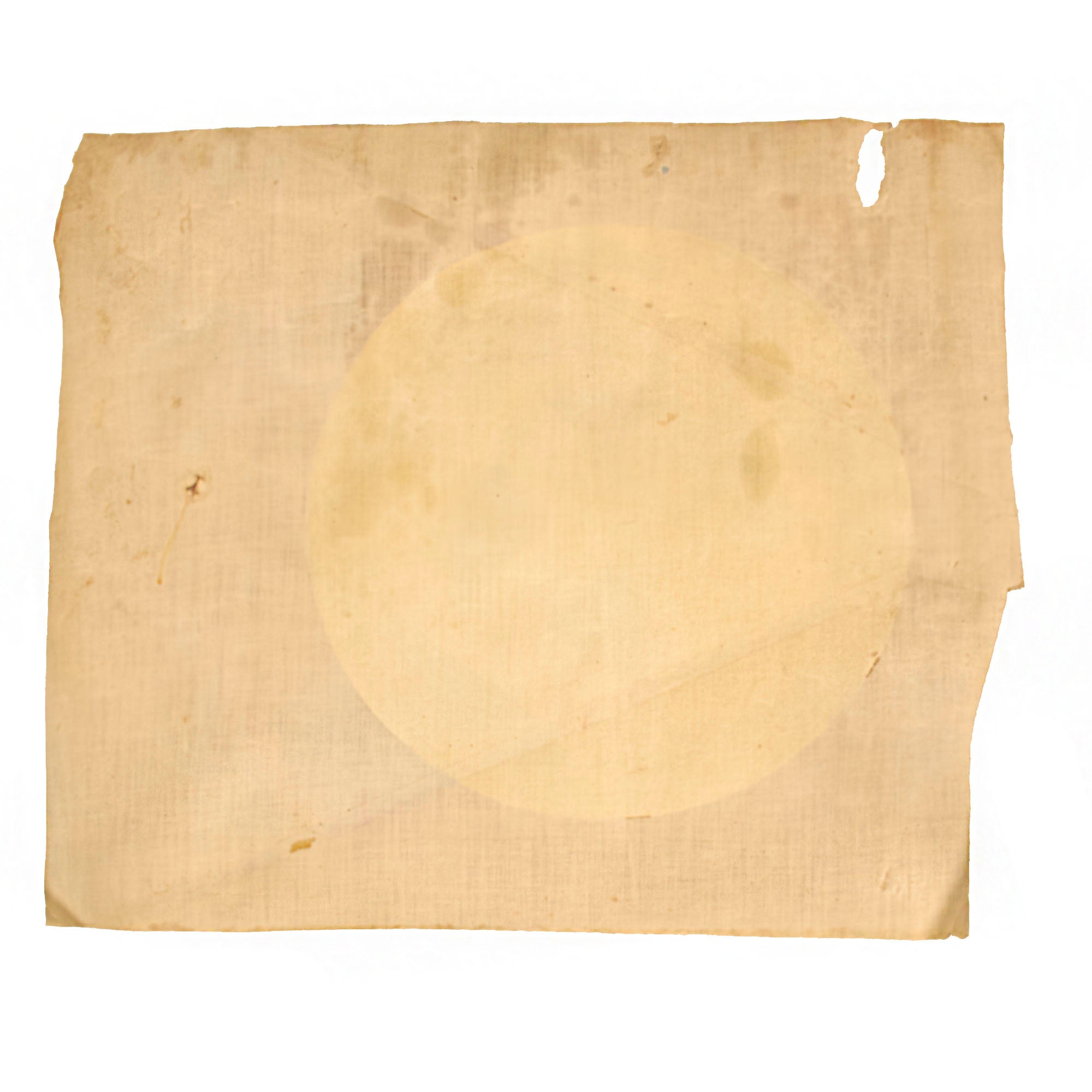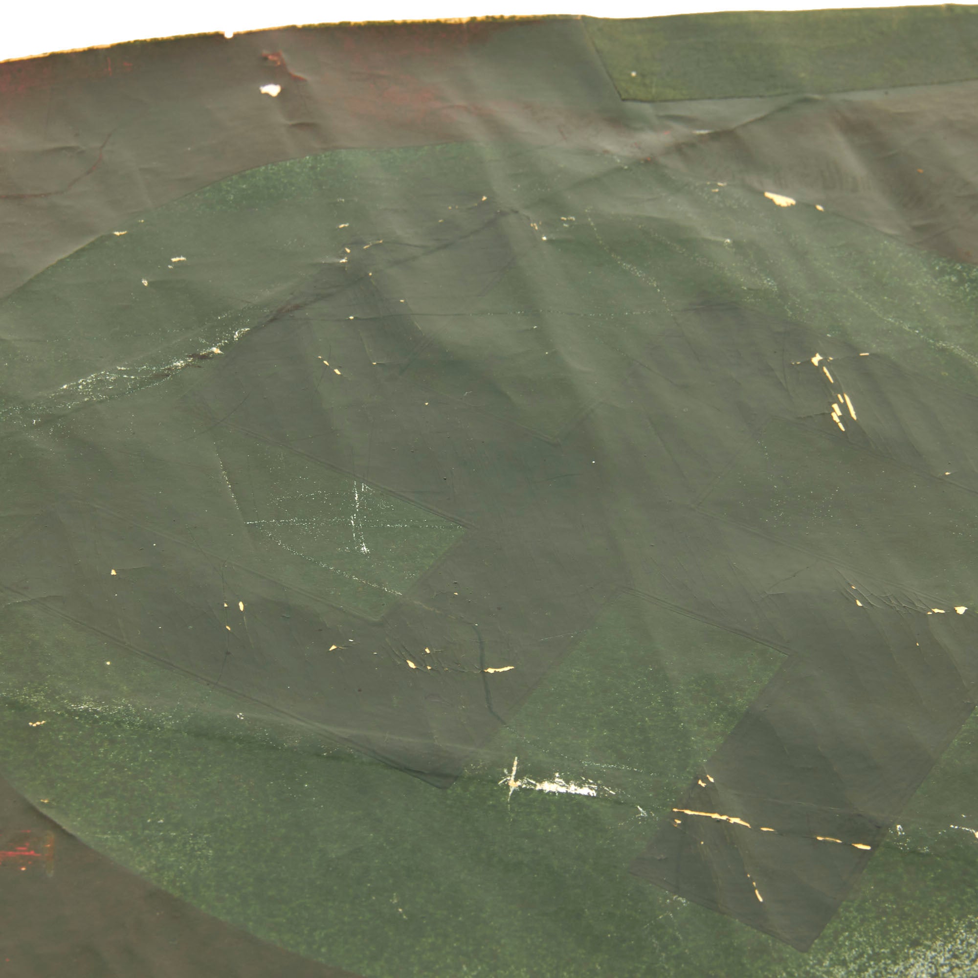 This is a very nice piece of canvas aircraft skin, cut off of a German glider during WWII. The piece measures 15 1/2" x 19", and shows a black swas in a whit circle surrounded by red, with green paint overall as camouflage. It is properly "doped", covered with a plasticized lacquer that is applied to fabric-covered aircraft. It tightens and stiffens fabric stretched over airframes, which renders them airtight and weatherproof, increasing their durability and lifespan. The canvas is not particularly heavy, most likely owing to the single use nature of the glider. It has some fold marks and a tear in it. We unfortunately do not know where it was recovered from.