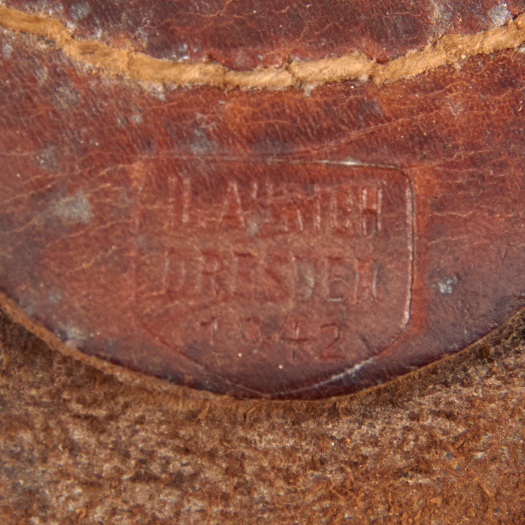 The leather tab is still present, though definitely a bit worn and folded from use and age. It is nicely maker stamped inside a small shield design with:
