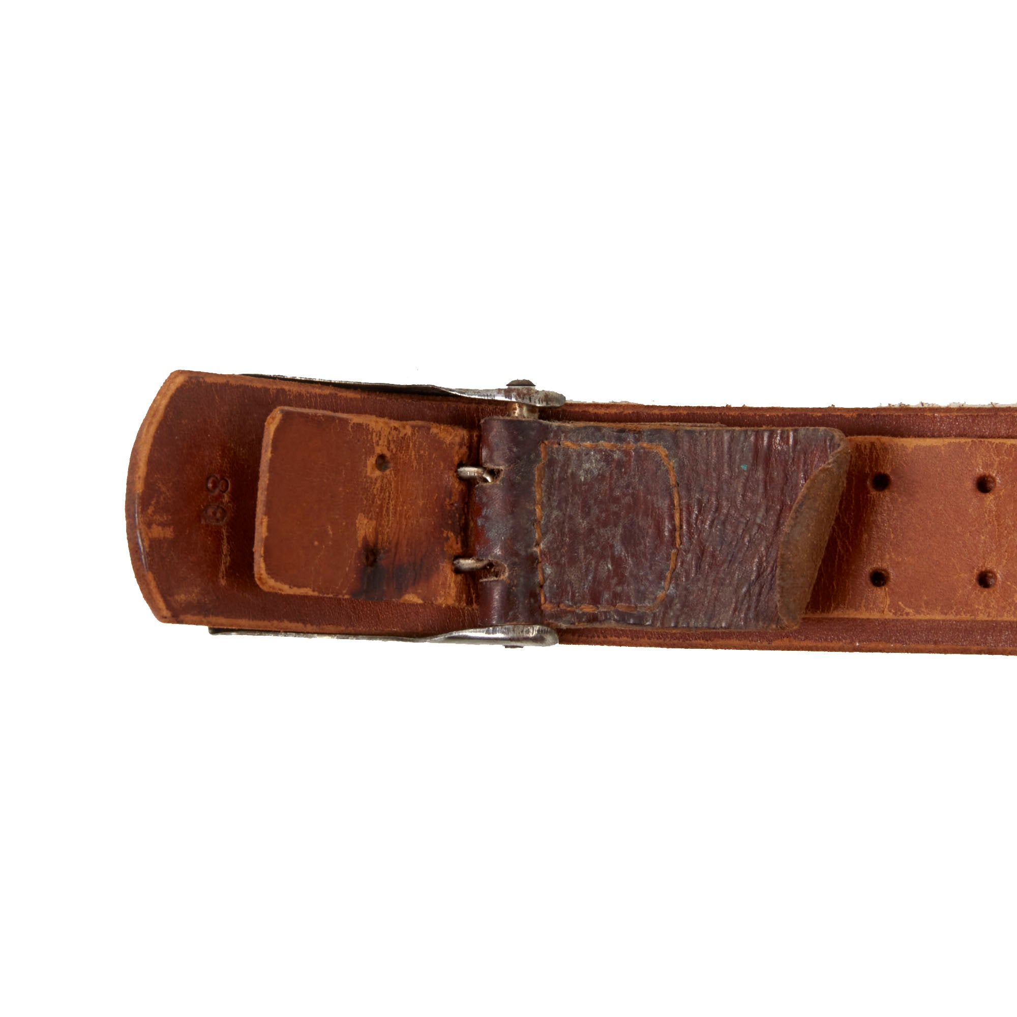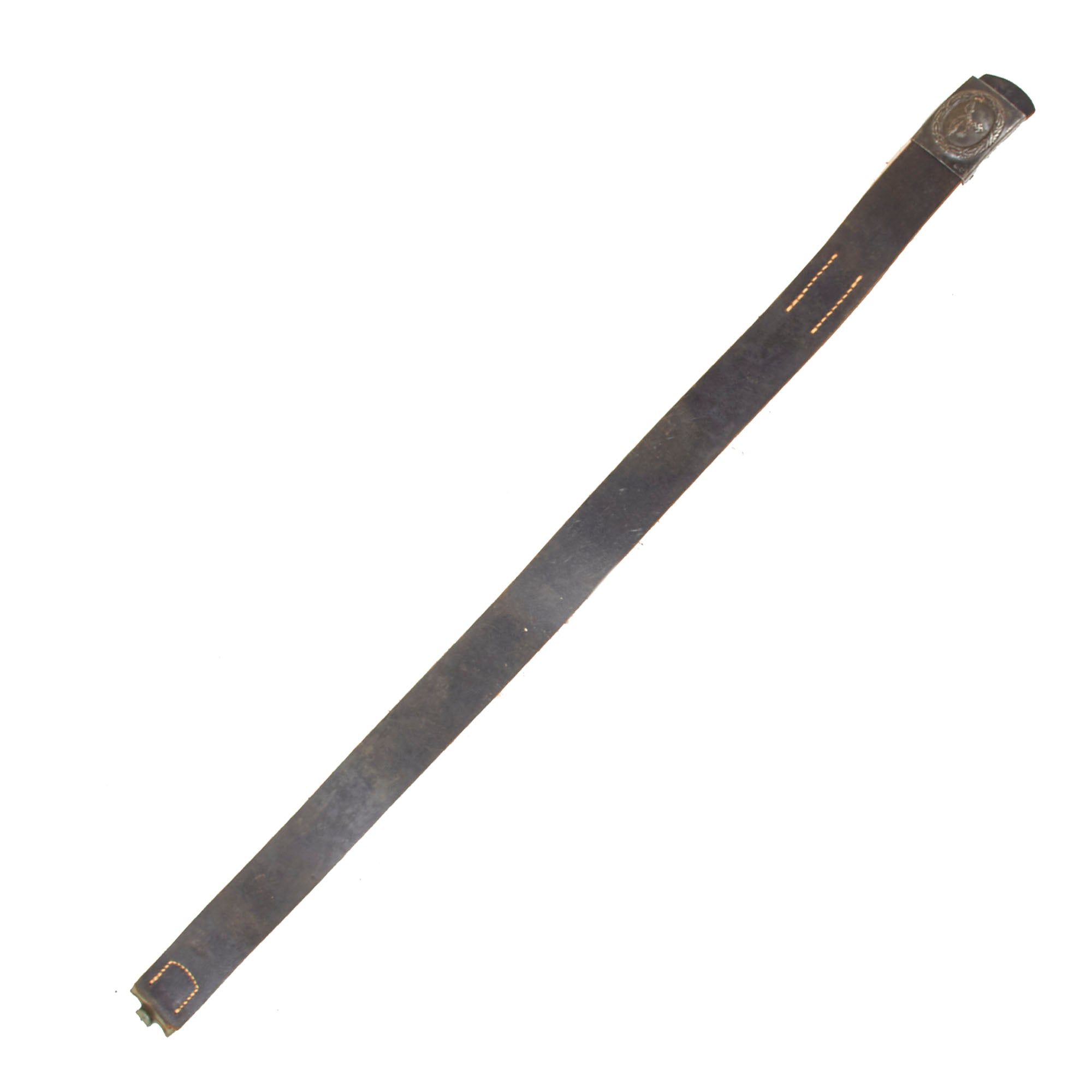 The black leather belt itself measures about 35” when fully extended, and is in very good condition, showing only light wear to the black exterior. The buckle end is stamped with 88 for 88cm (34.6in.), and the clip end of the belt is marked with bmd / 42 for 1942 production by Max G. Müller of Nürnberg O. in Bavaria, who was known leathermaker of the time that produced holsters, saddles and other leather goods. It still has the leather tab with a double row of 7 holes for attaching the buckle and size adjustment, and is still quite supple.
