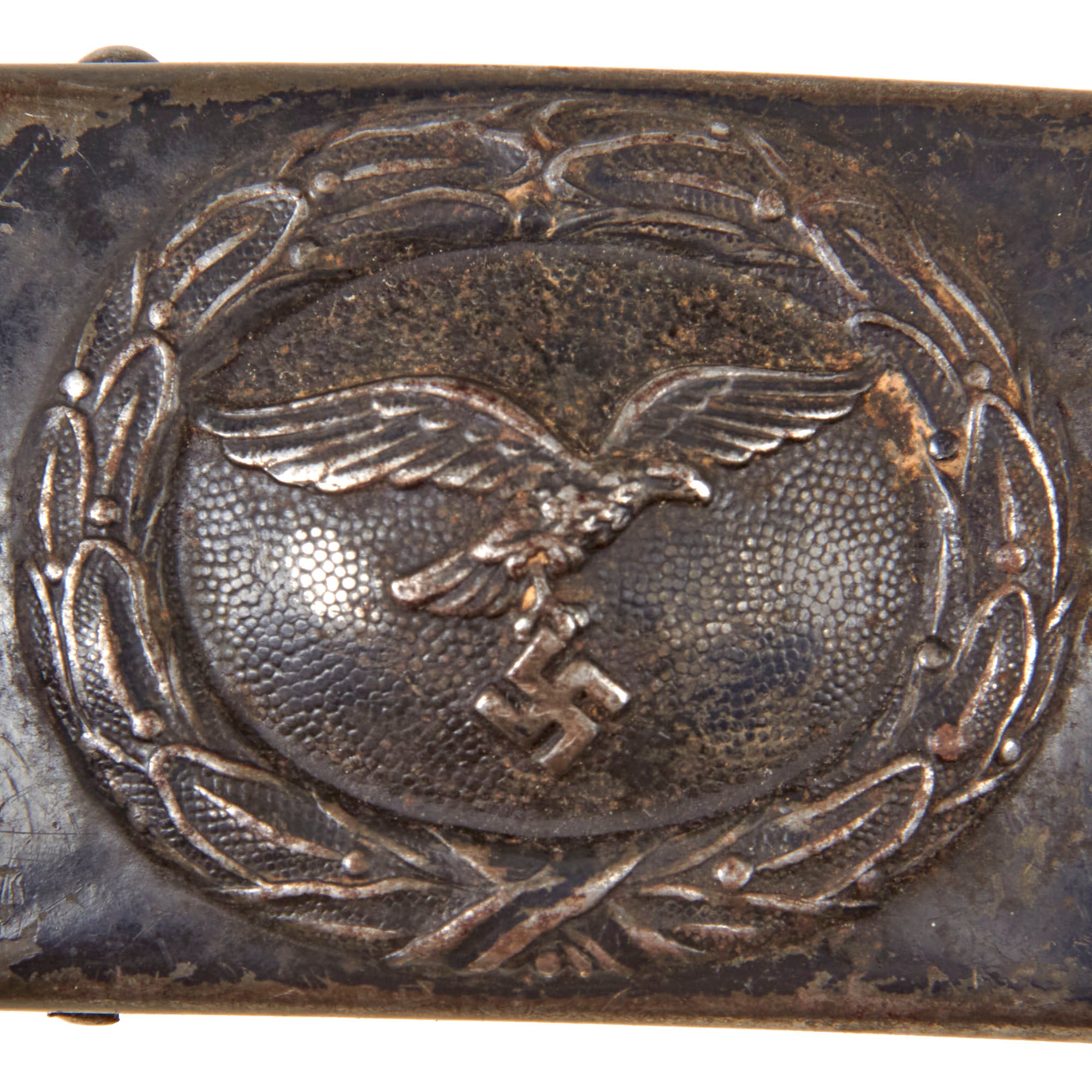 Original Item: Only One Available. This is a very good condition WWII German Wehrmacht Luftwaffe EM/NCO's Belt Buckle (Koppelschloß), with the correct black leather belt, both dated 1942. The buckle is embossed with the wartime Luftwaffe straight tail eagle on a pebbled central field, surrounded by a laurel leaf wreath. The buckle is of 1940 pattern, die stamped, steel construction, with a dark blue/grey painted finish, which is retained at about 60% on the obverse, while the reverse shows over 85% still intact. There is some denting and oxidation to the front, as expected from a buckle that saw service in a wa.