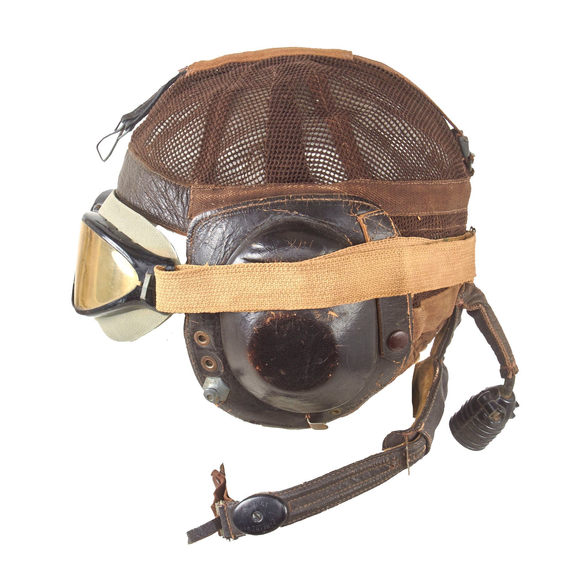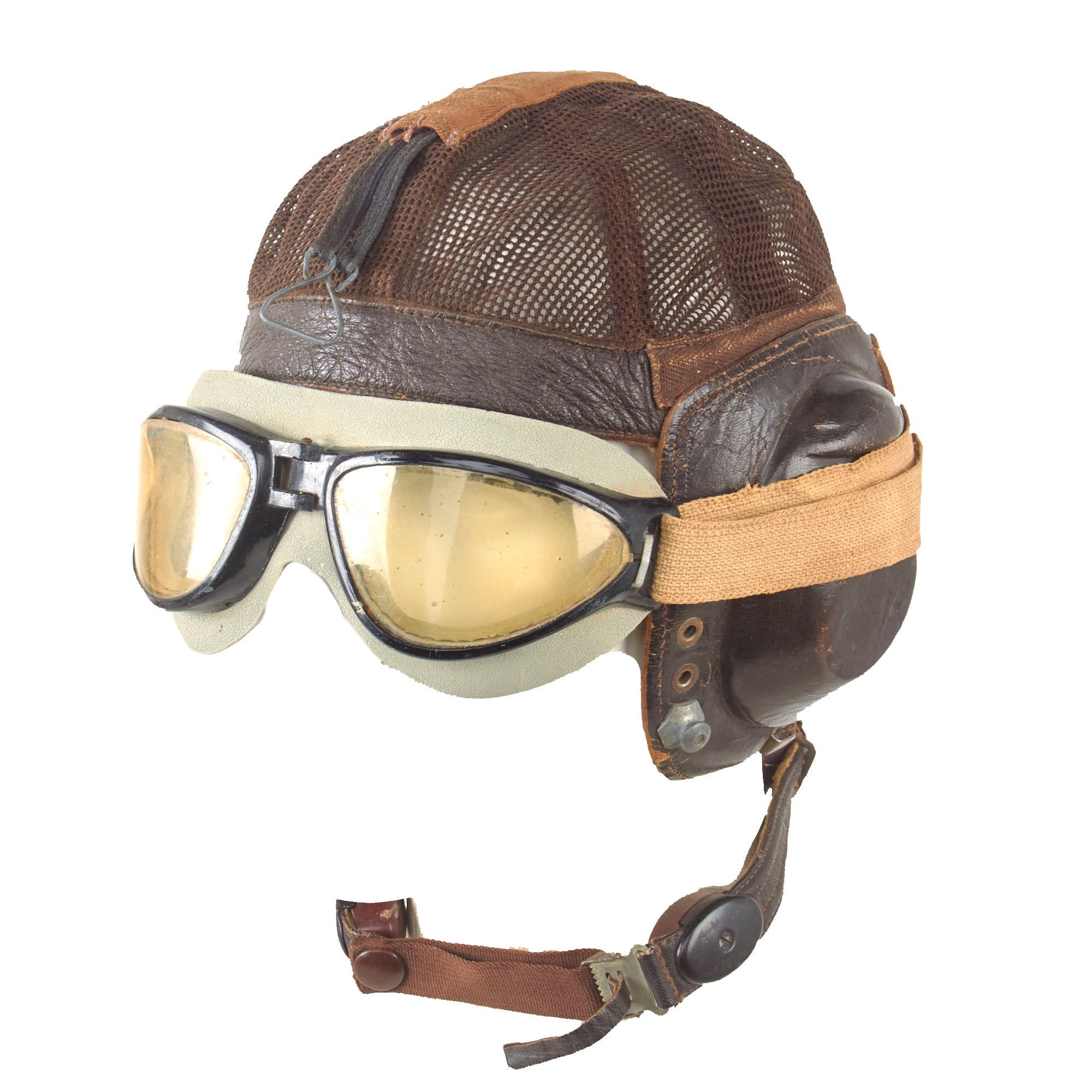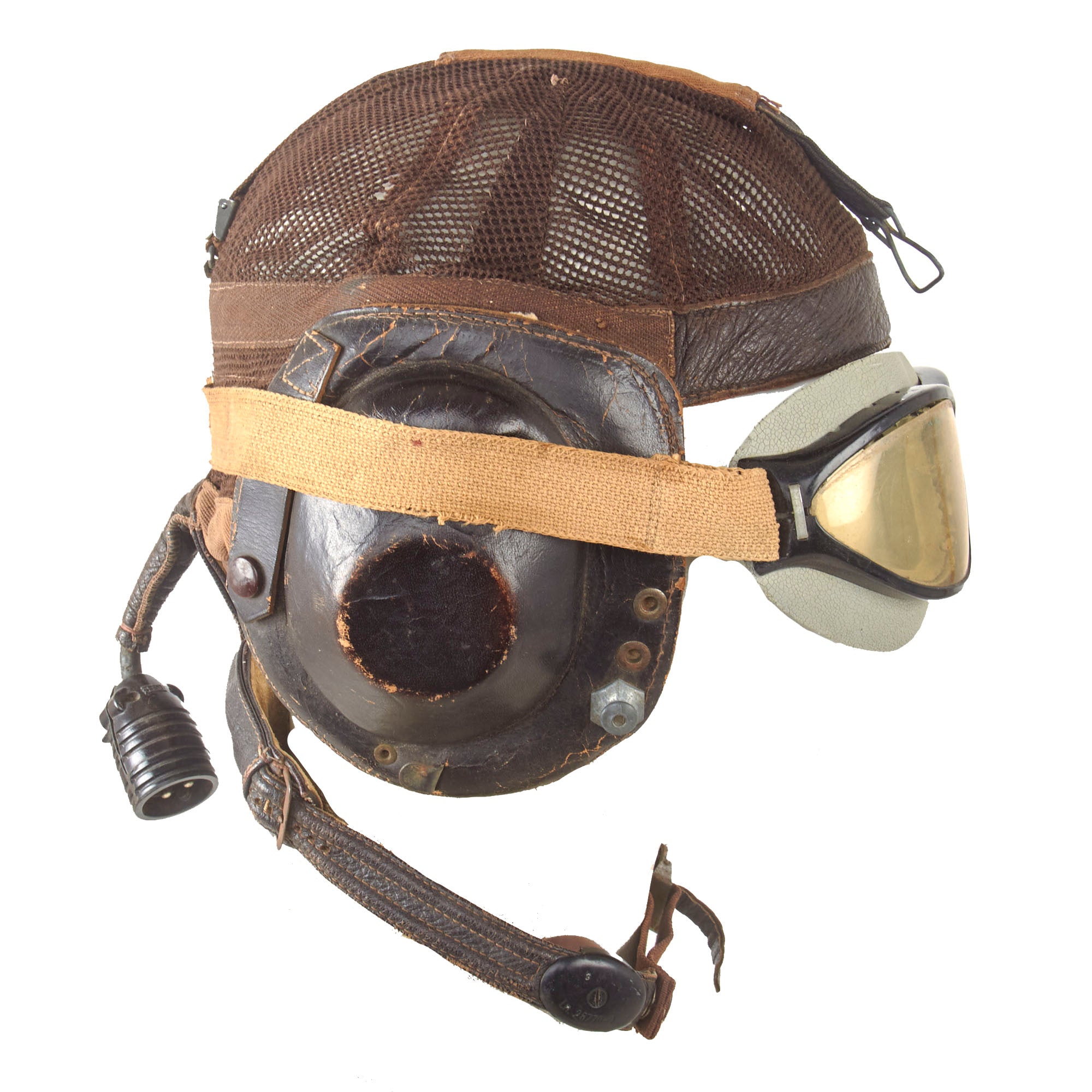 Original Item: Only One Available. The famous net-top helmet proved popular with Luftwaffe pilots as it was designed for comfort and without the restriction of a chinstrap. This classic mesh flying helmet which has become synonymous with Luftwaffe fighter pilots in WW2. This example has a manufacturers label coded hdc indicating it was produced by the firm of Luftfahrtgeraetewerk Hakenfelde GmbH, Berlin-Spandau. Overall condition is great with some minor tearing in the mesh. This example includes the original Avionics and a set of flight goggles.
